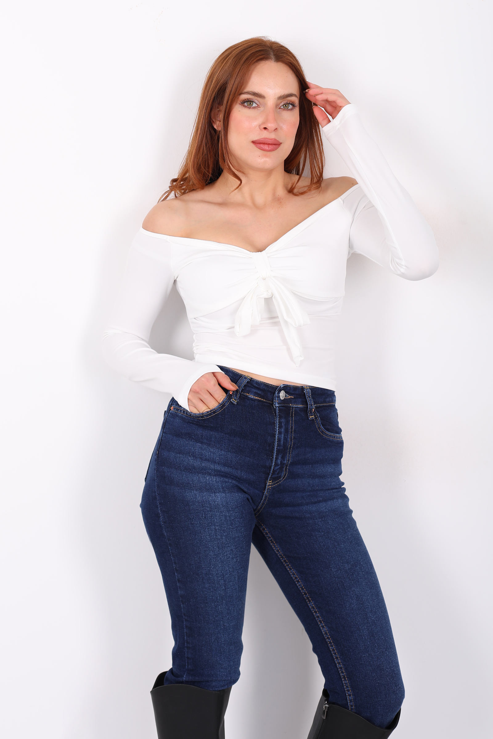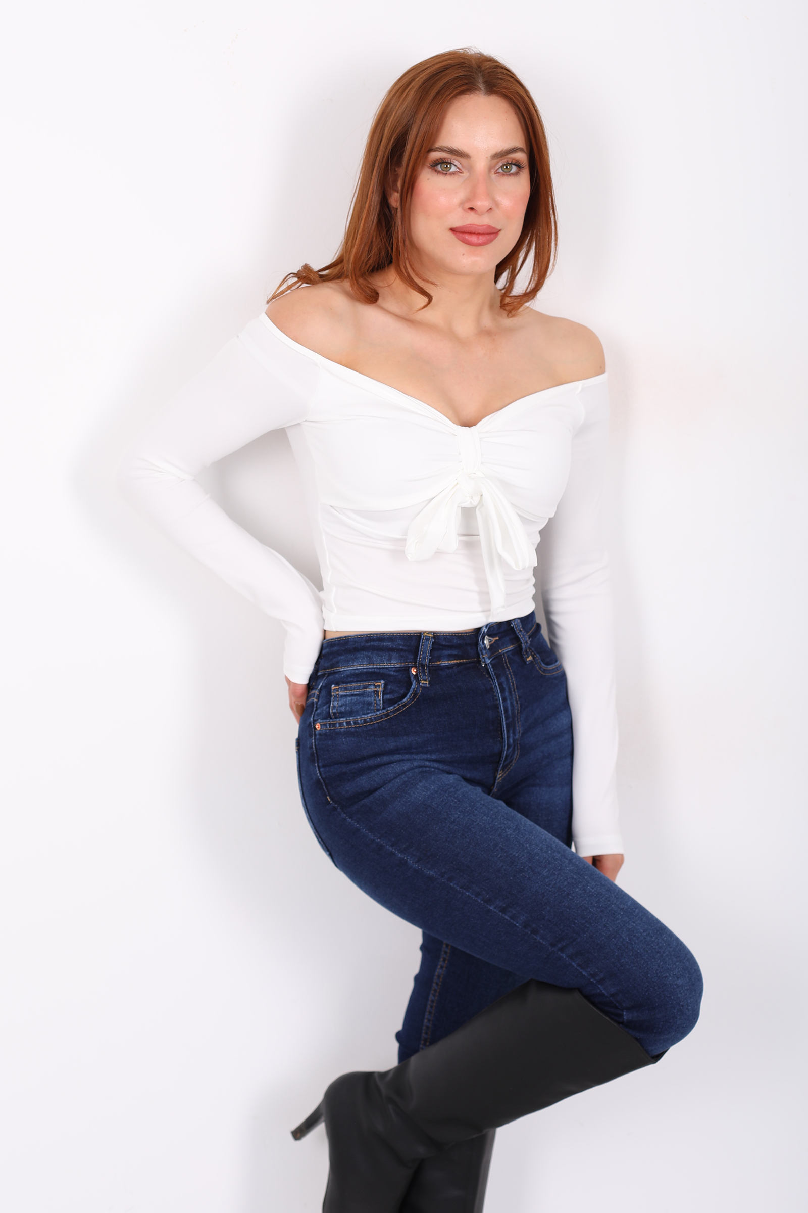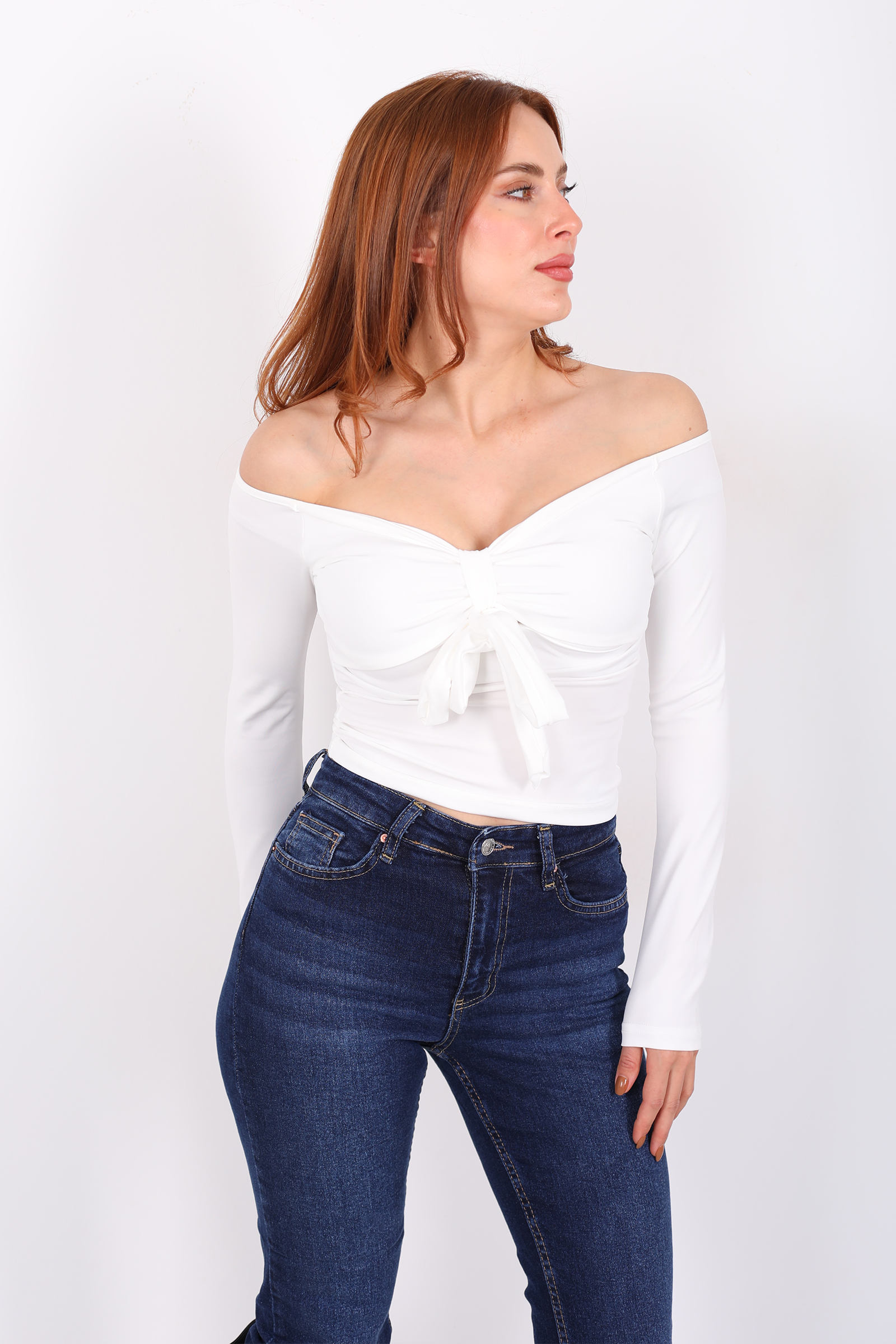 Açık Yaka Fiyonk Bağlamalı Kadın Beyaz Sandy Bluz