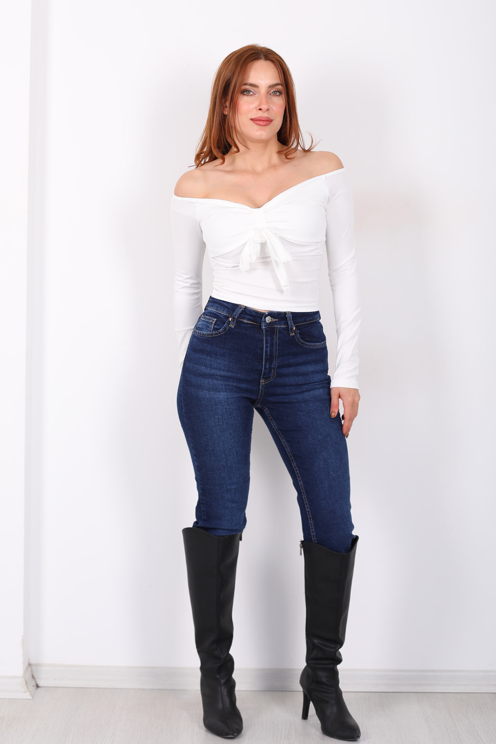 Jean Parçalı Beyaz Kadın Crop Bluz