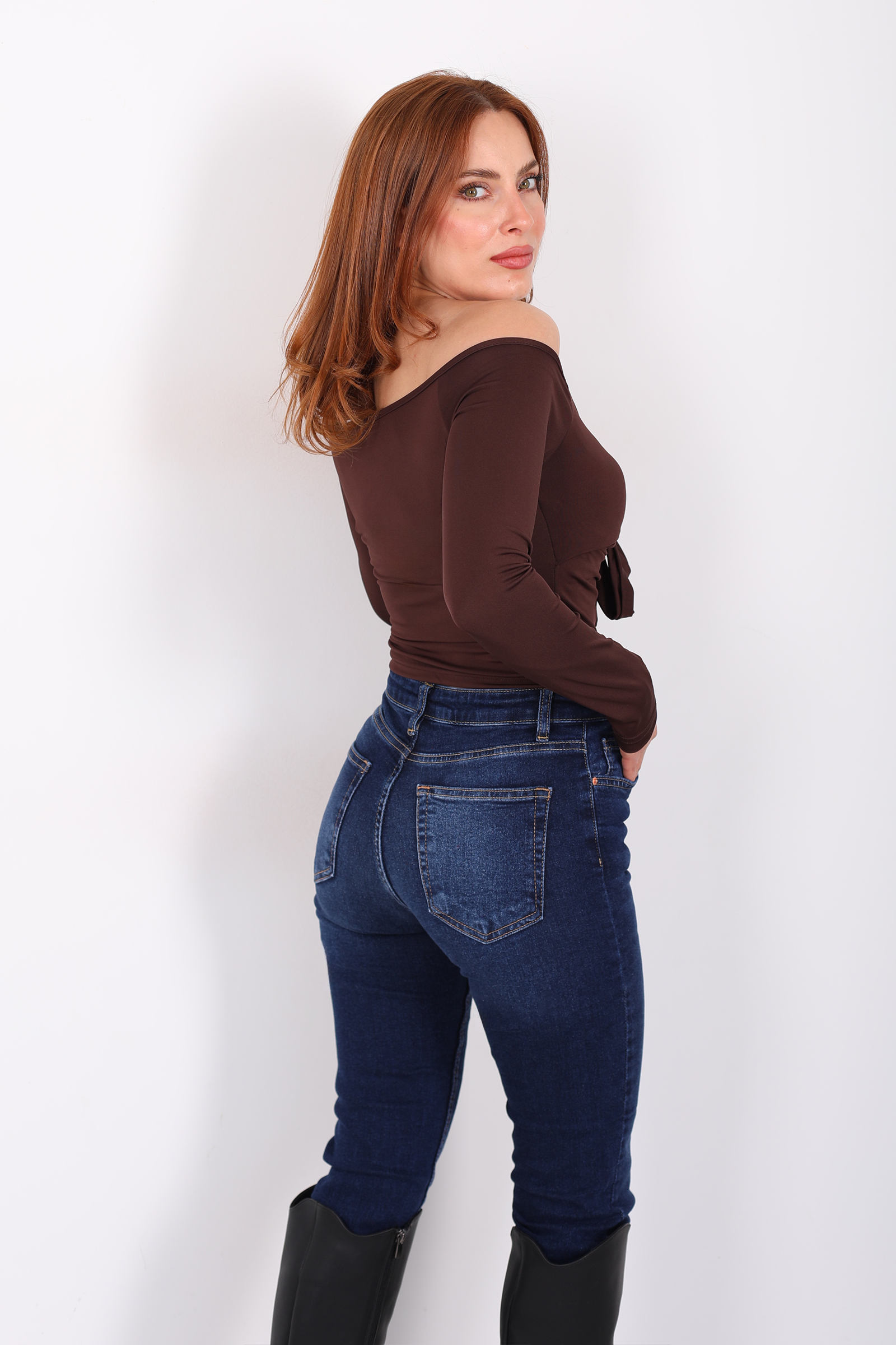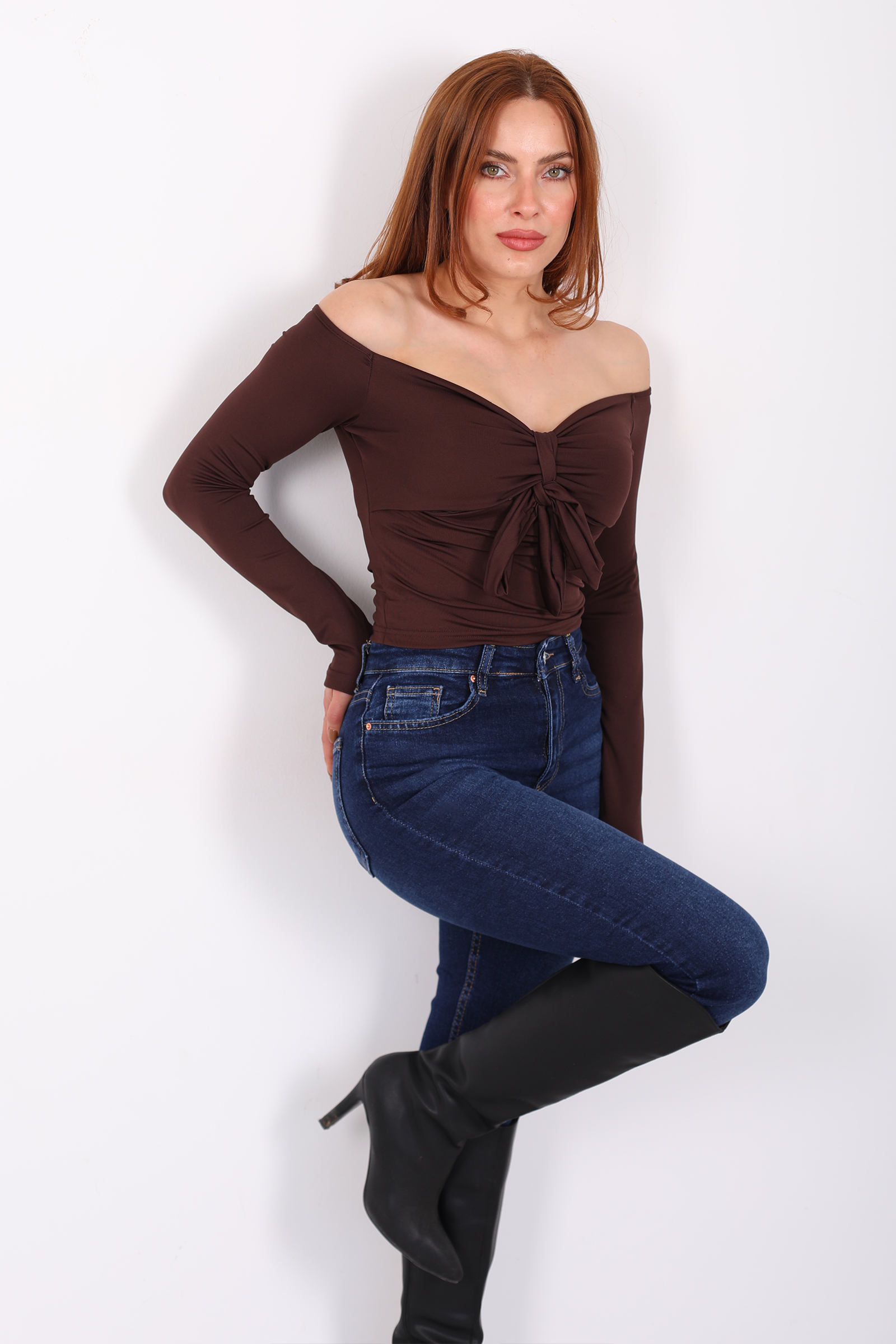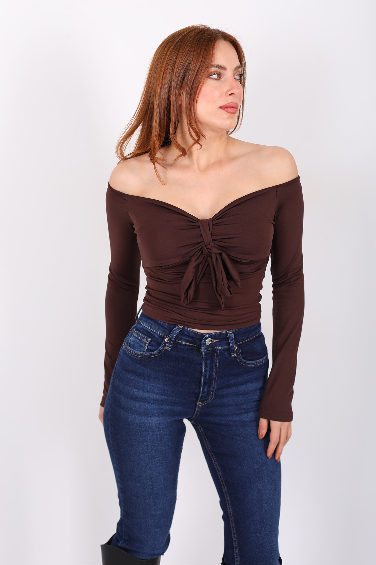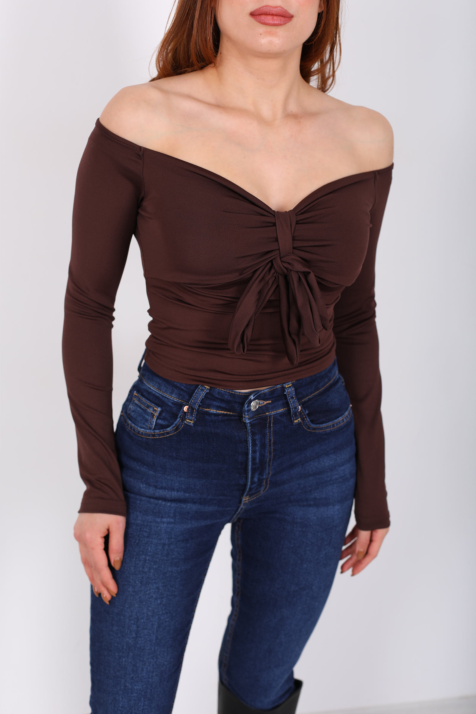 Açık Yaka Fiyonk Bağlamalı Kadın Kahverengi Sandy Bluz