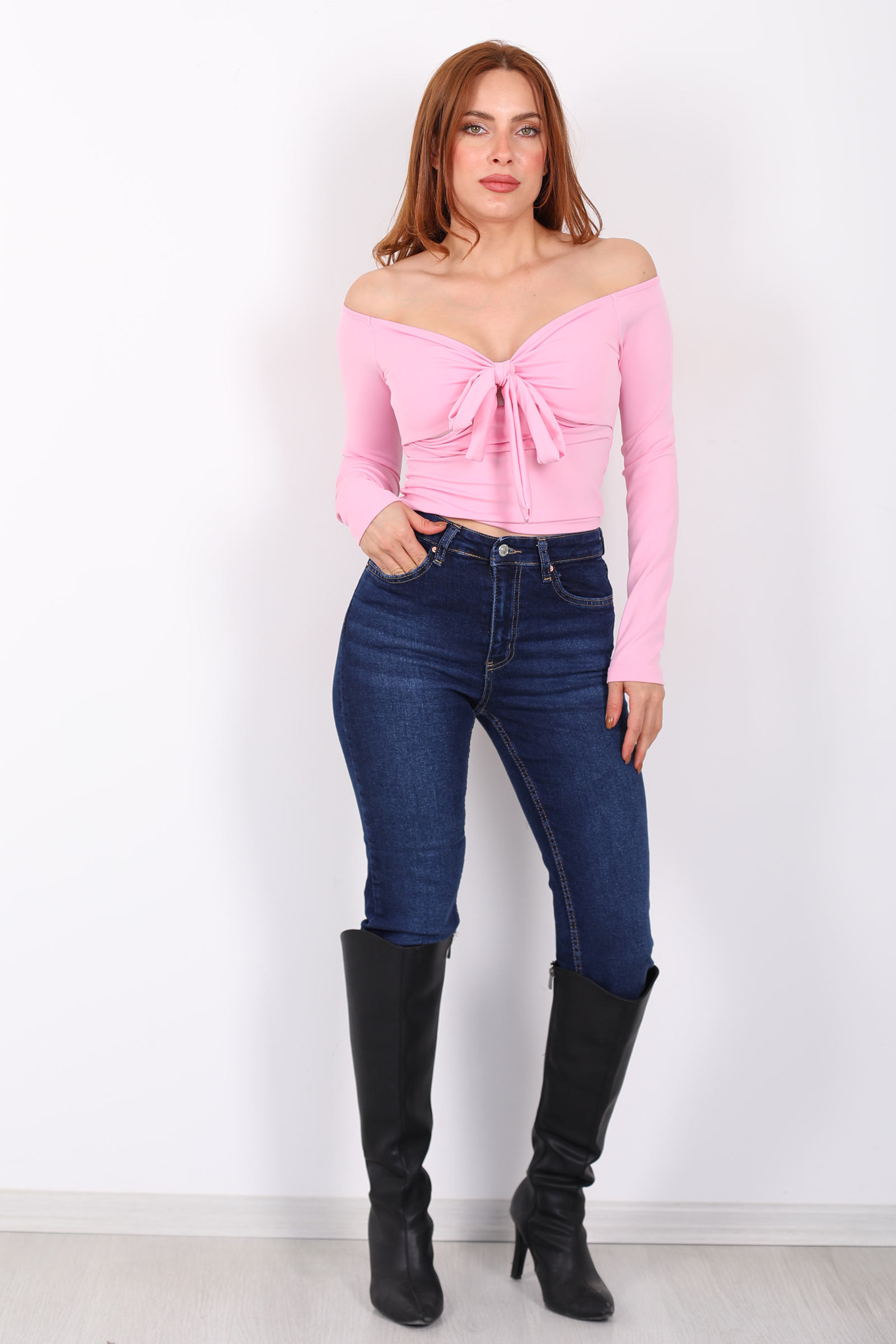 Açık Yaka Fiyonk Bağlamalı Kadın Pembe Sandy Bluz