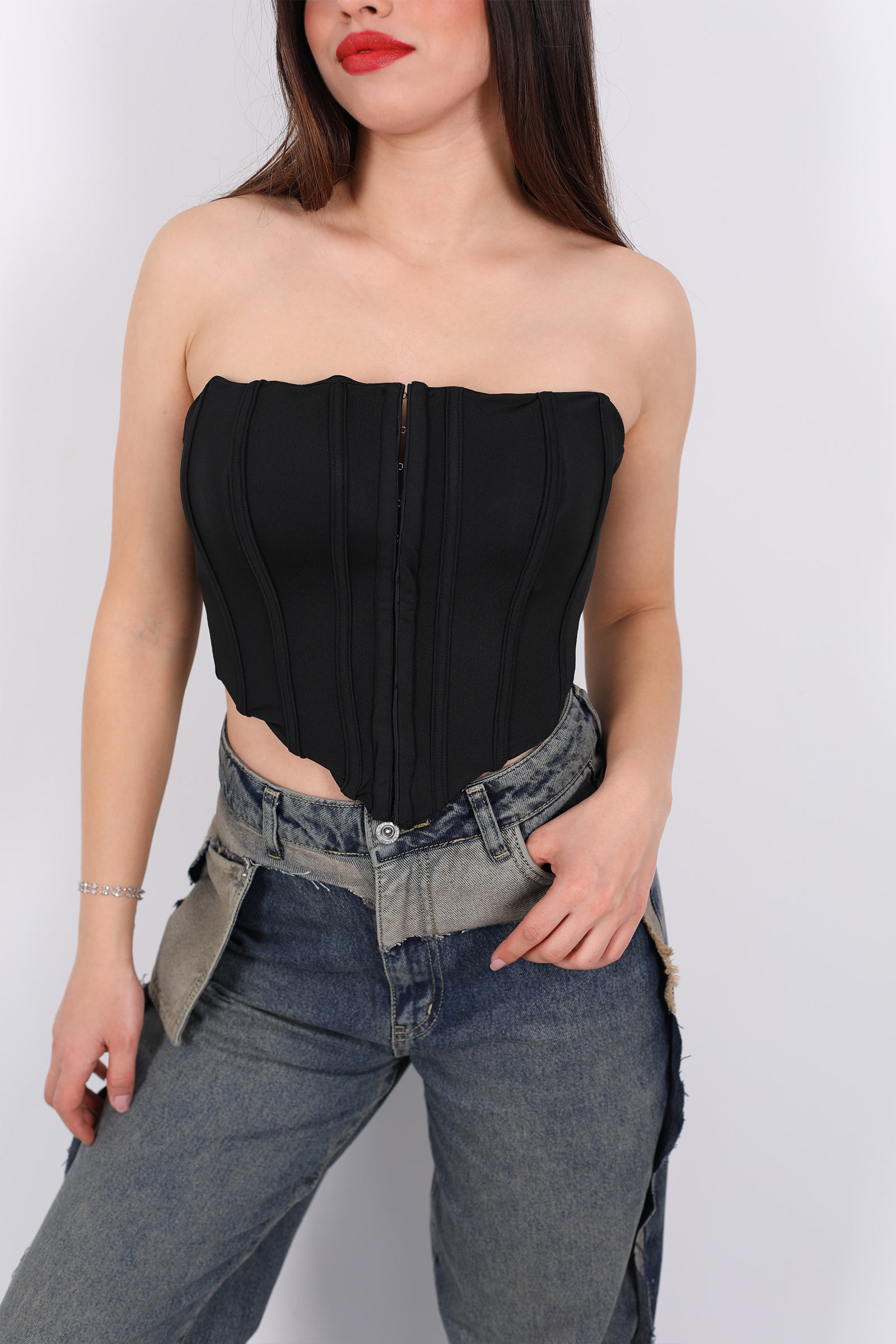 Agraflı Korse Straplez Siyah Kadın Crop