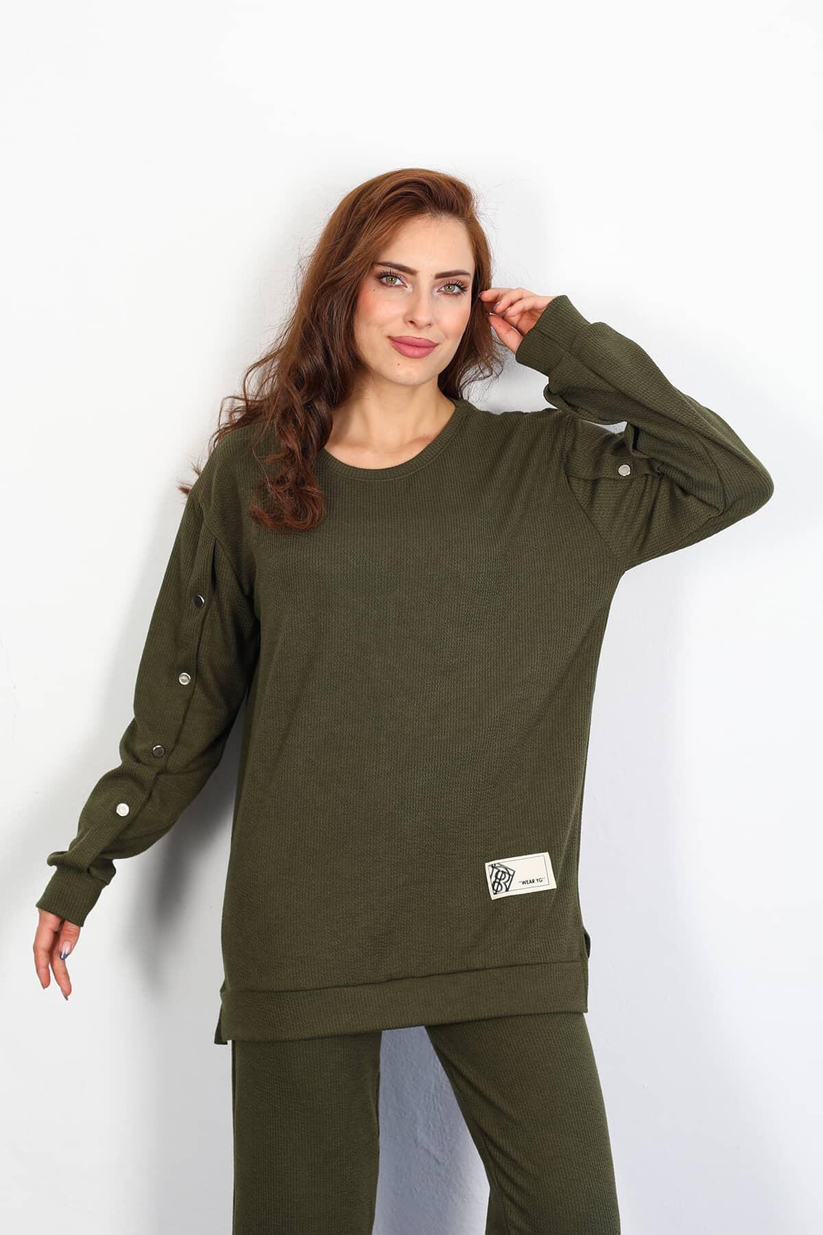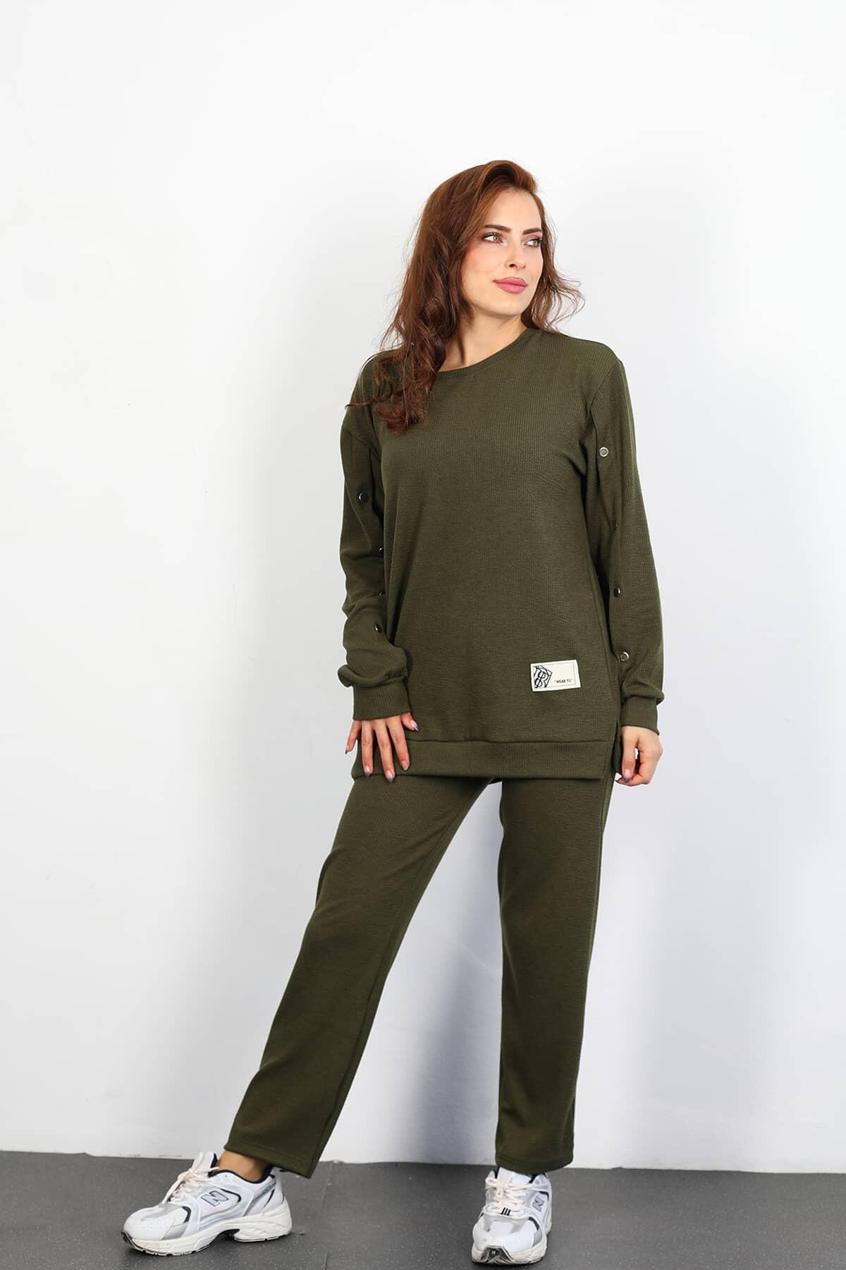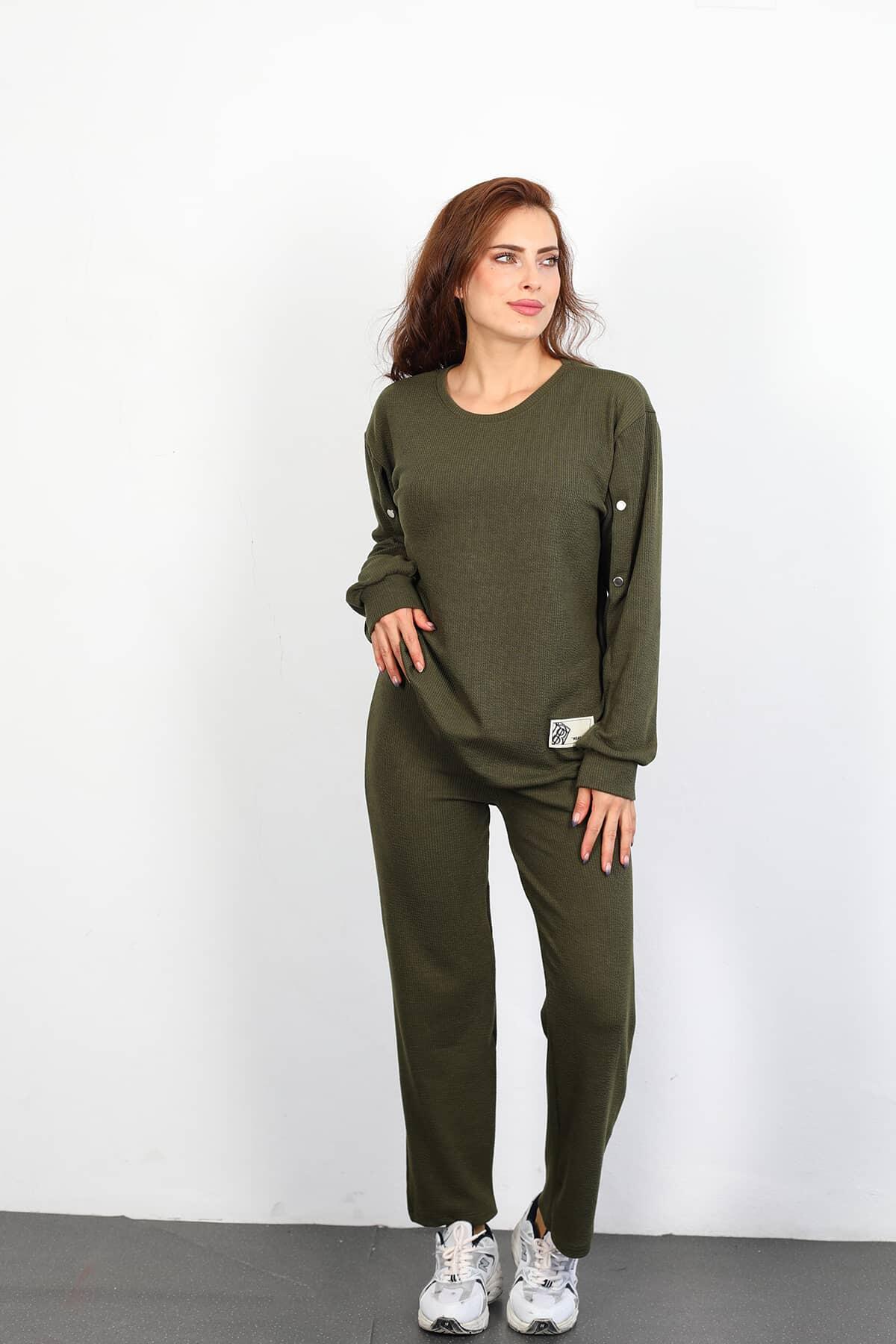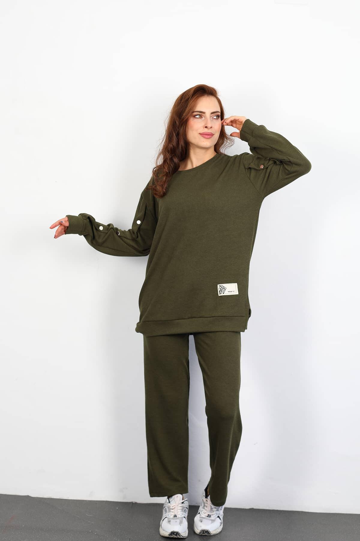 Apolet Detay Armalı Bol Paça Kadın Haki Fitilli Takım