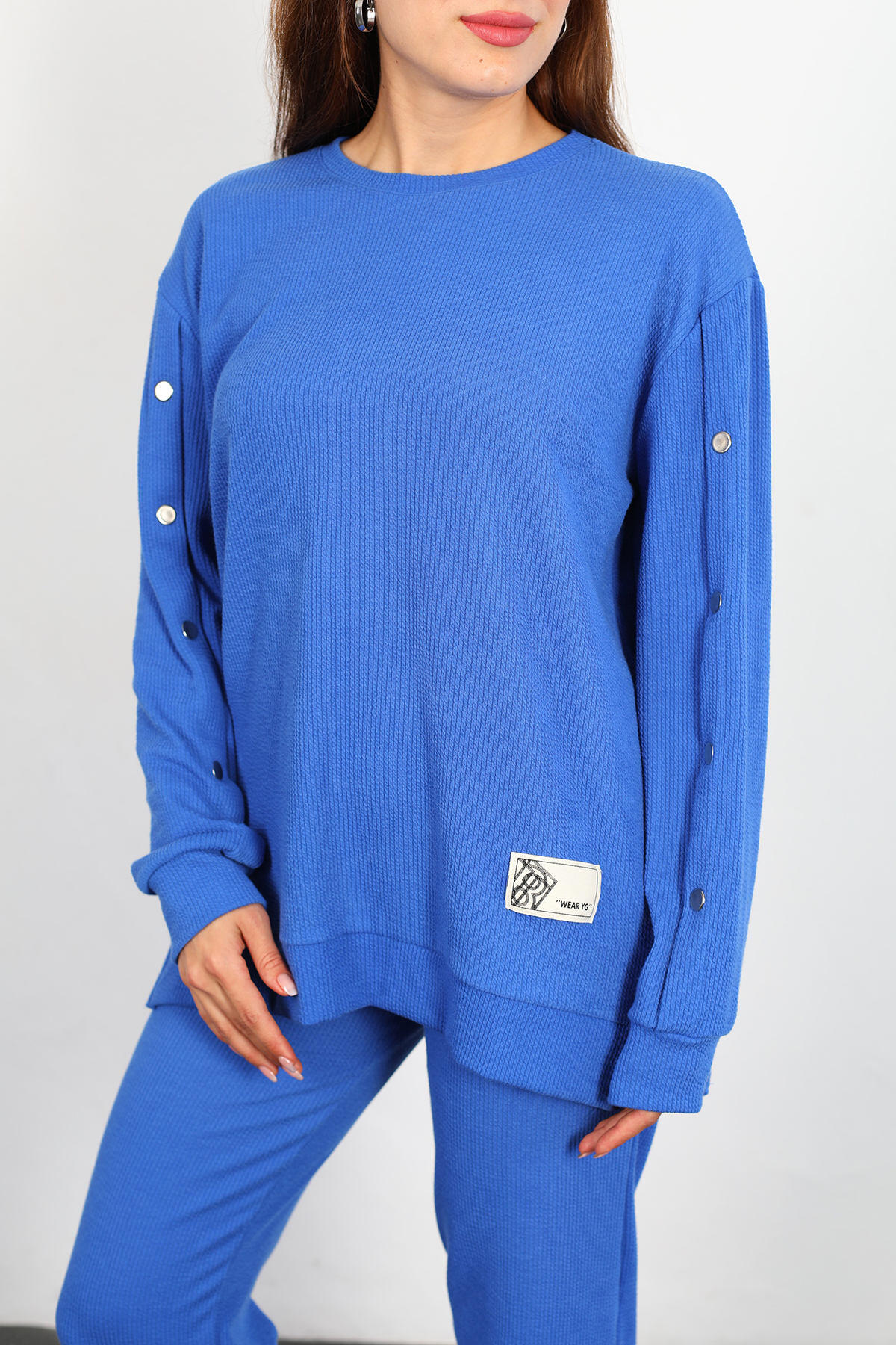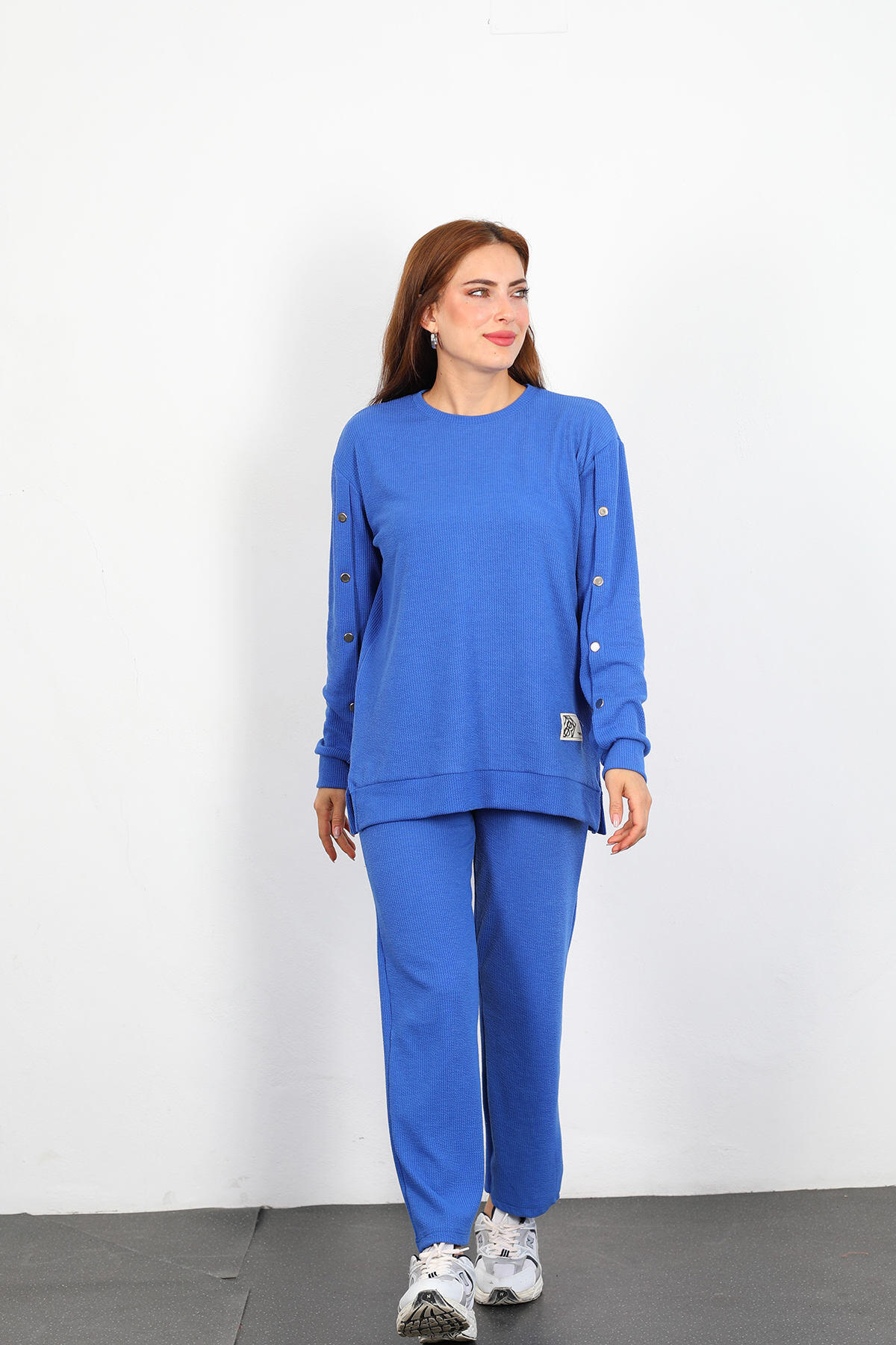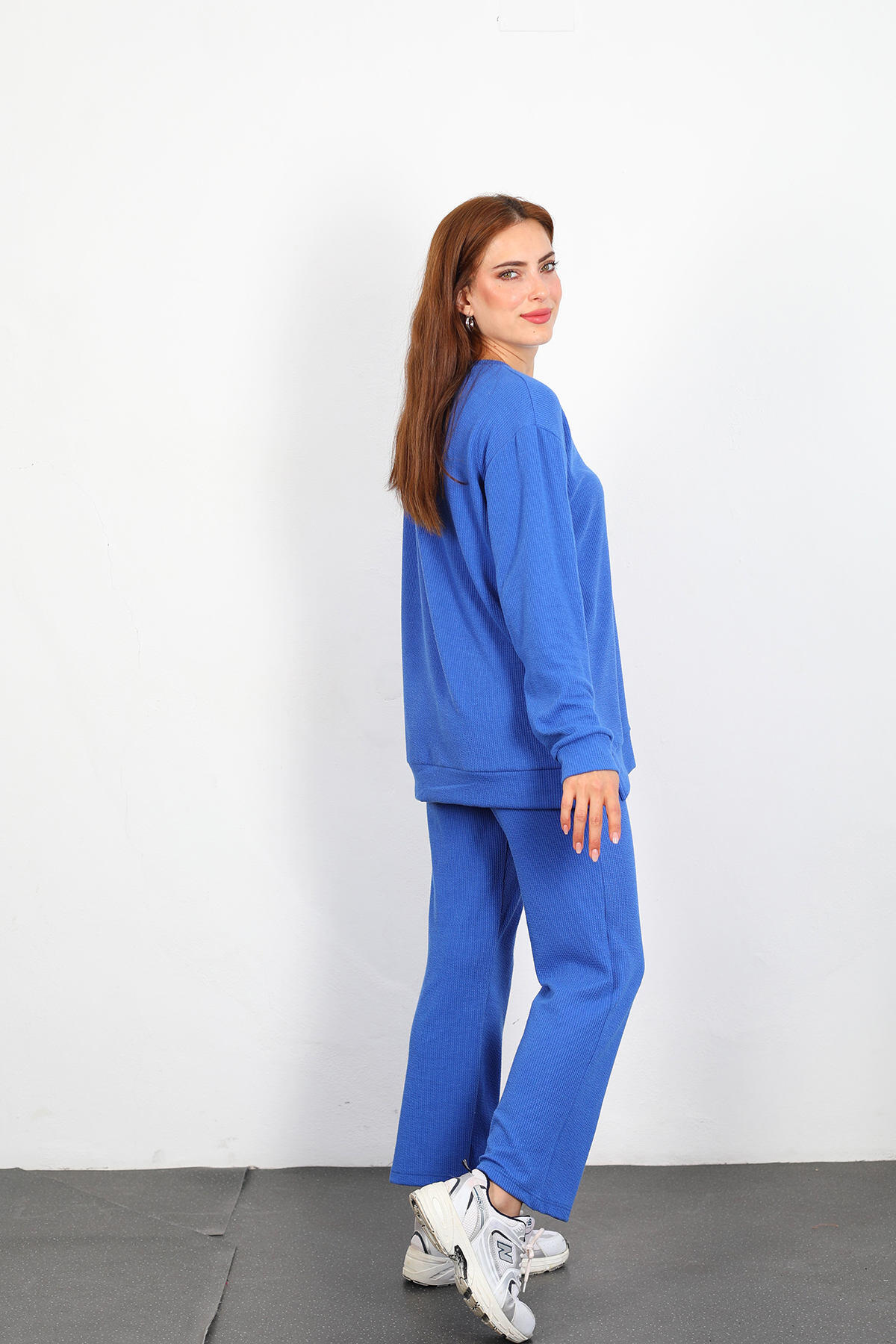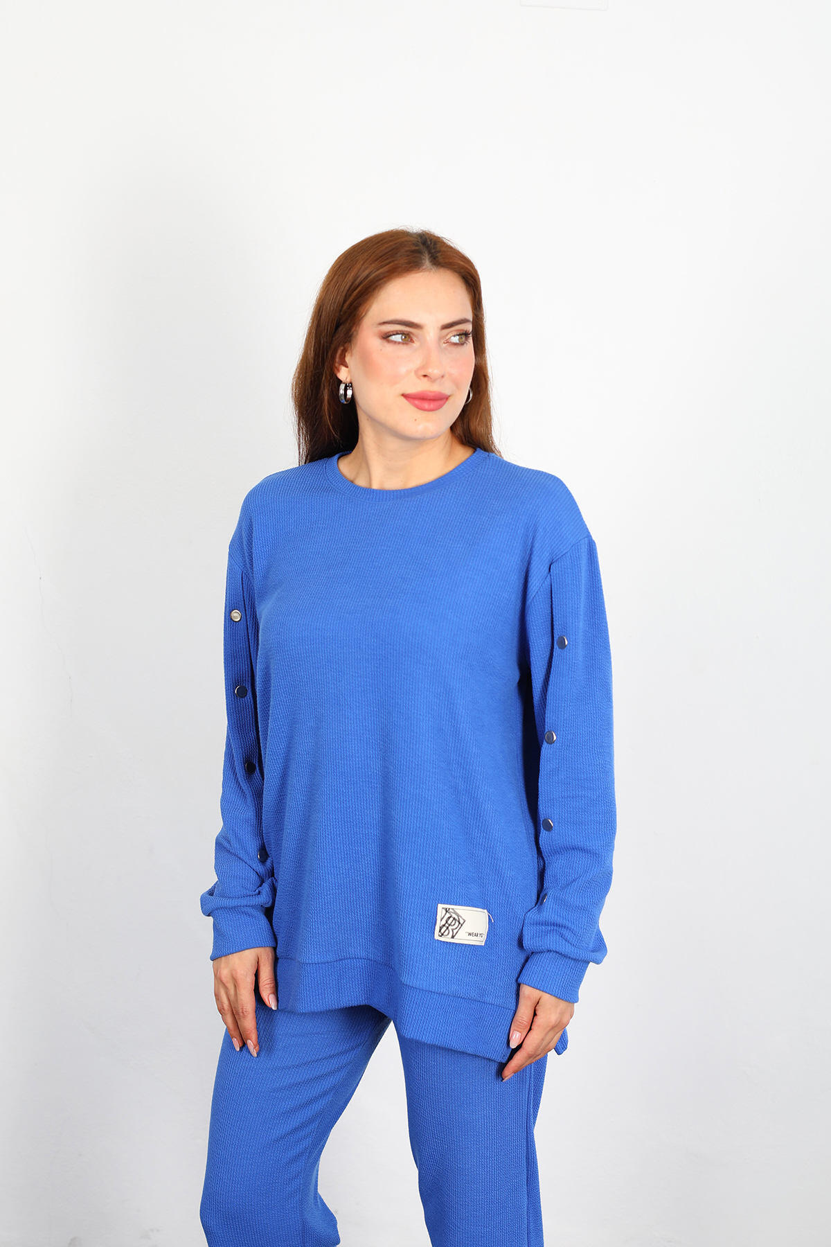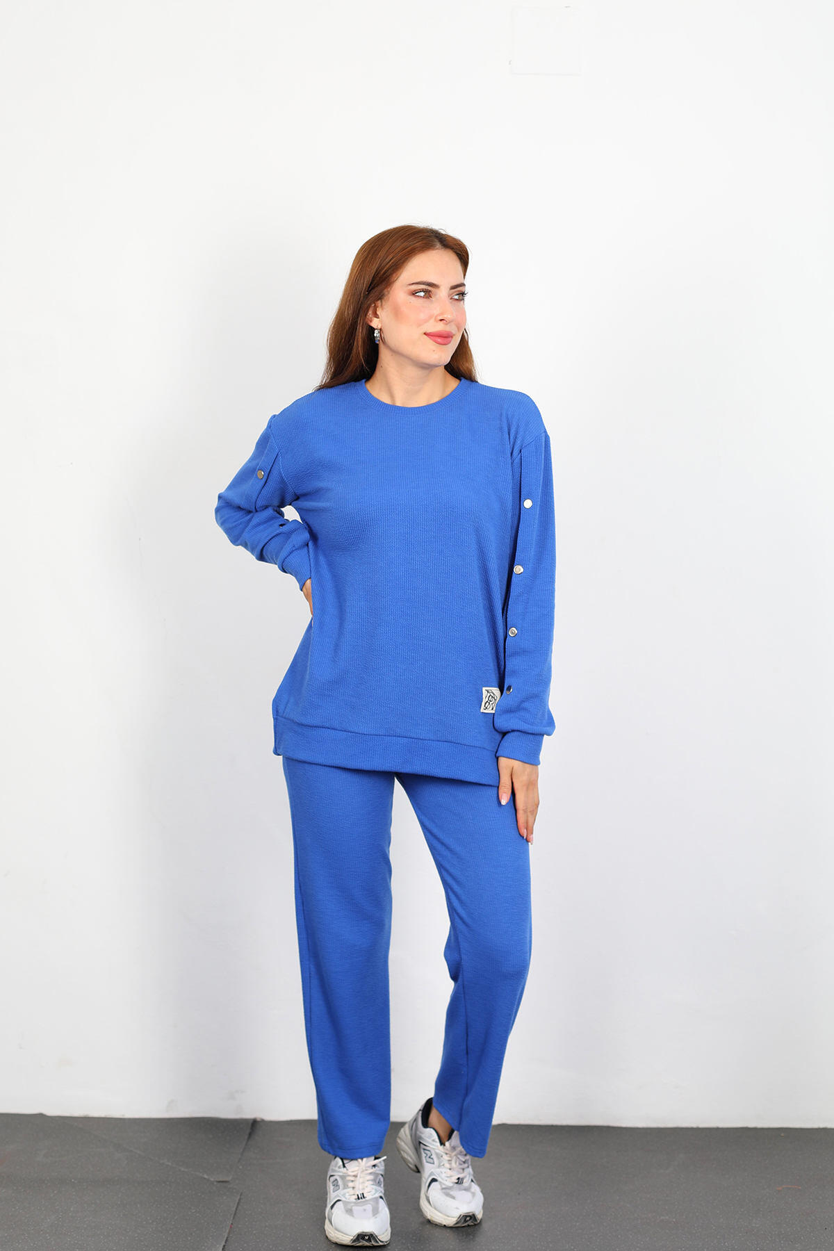 Apolet Detay Armalı Bol Paça Kadın Mavi Fitilli Takım