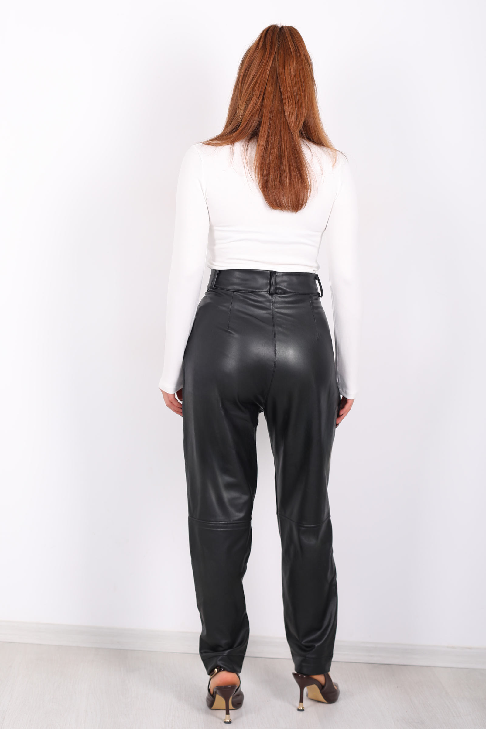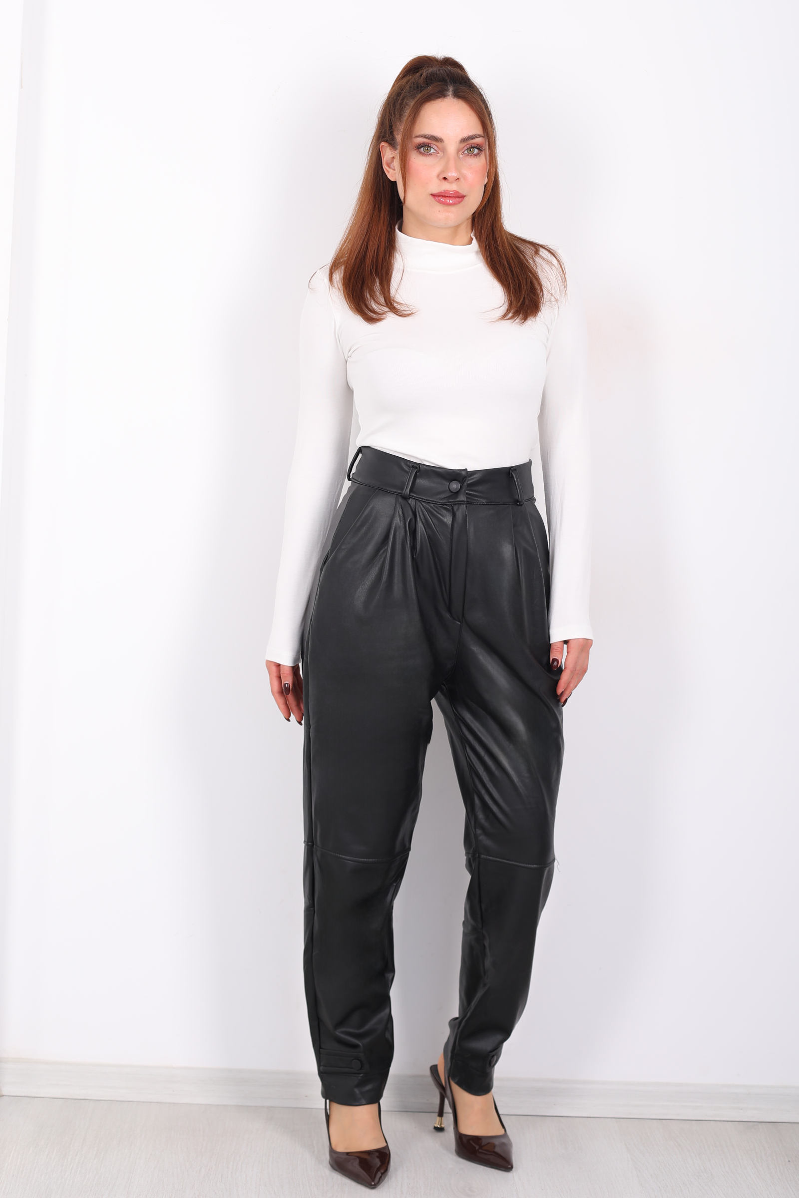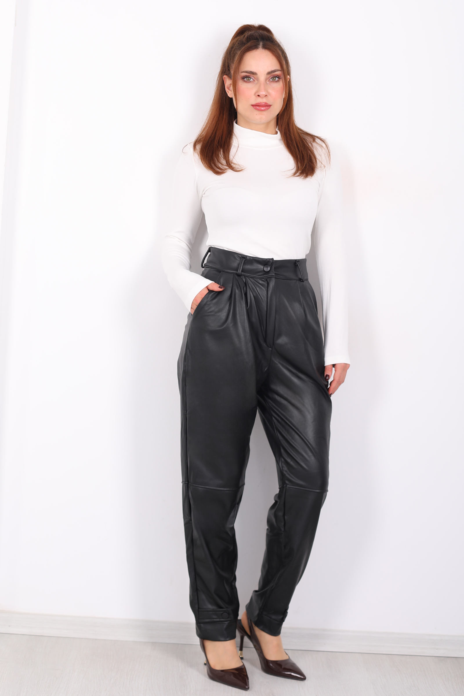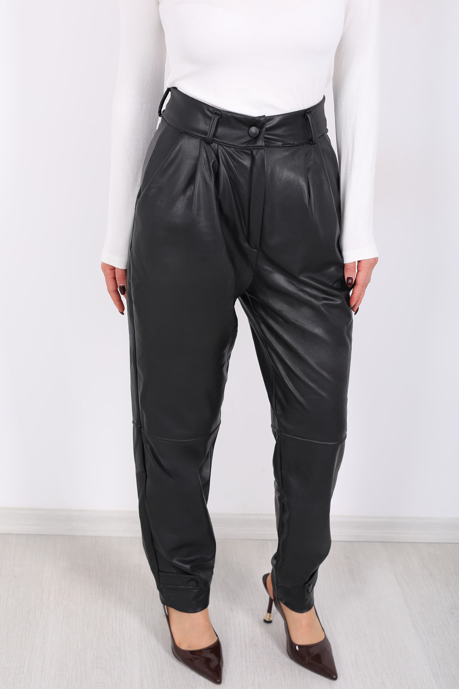 Modern detaylarıyla dikkat çeken bu siyah deri pantolon, şık apolet detayları ve pens kesimiyle zarif bir siluet sunuyor. Üç iplik şardonlu kumaşı, hafif esnek yapısıyla gün boyu konfor sağlar. Yüksek bel tasarımı, vücut hatlarınızı zarifçe sarar ve modern bir siluet oluşturur. Sade ve şık bir görünüm için ideal bir tercihtir.