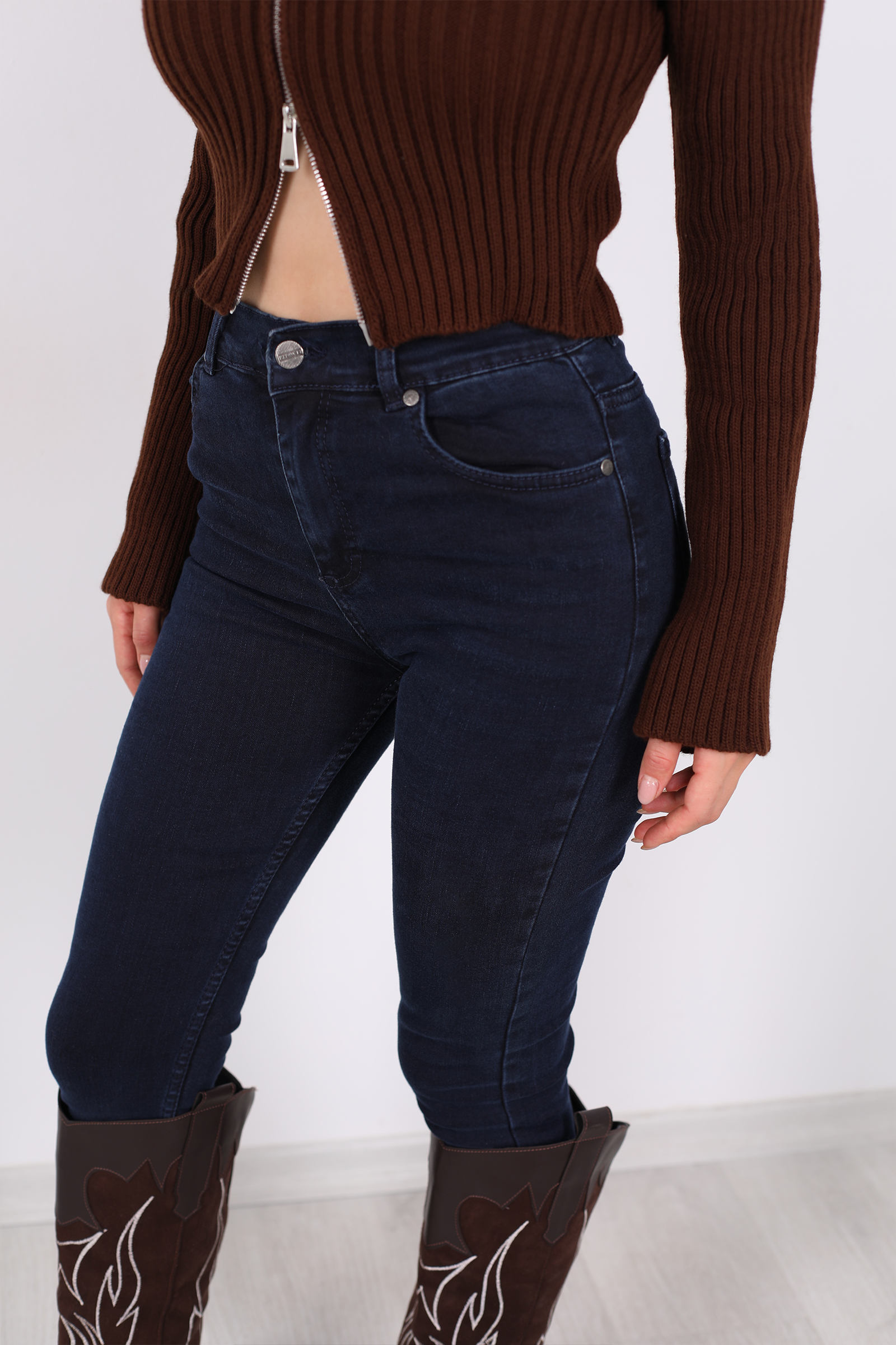 Bu dar paça lacivert pantolon, likralı kumaşı sayesinde vücudunuza esnek ve konforlu bir uyum sunuyor.Derin lacivert tonu, hem resmi hem de günlük kombinler için sofistike bir baz oluşturur. Bu renk, klasik kot görünümüne yakındır ancak likralı kumaş ile daha zarif ve akıcı bir duruş kazanır.Dar paça kesimi bacak çizgisini zarif bir şekilde vurgular. Ara beden yapısı sayesinde ne çok sıkı ne de gevşek bir duruş yakalanmıştır; likra ile birleşen bu form, hem şık hem konforlu bir kombin sağlar.