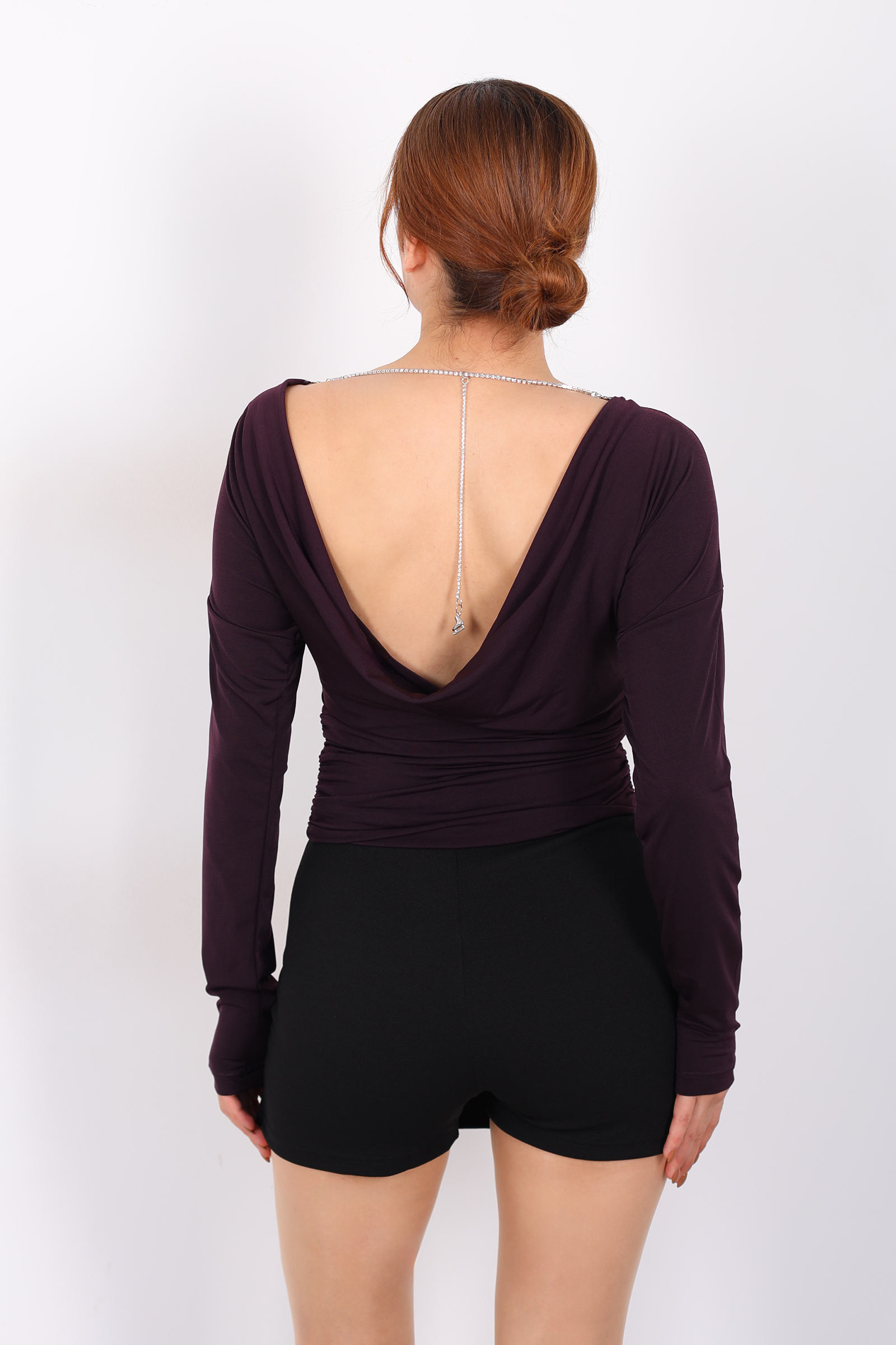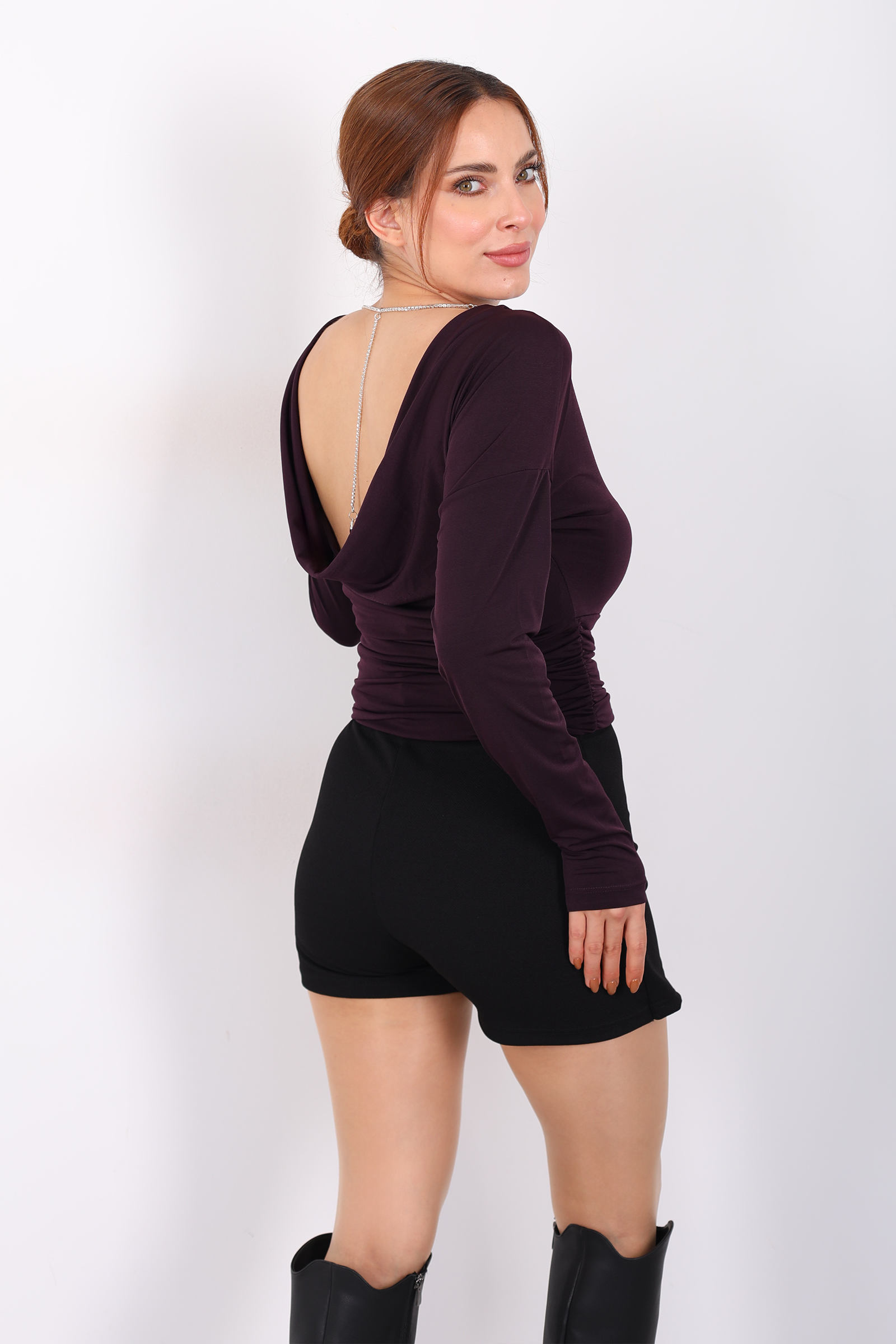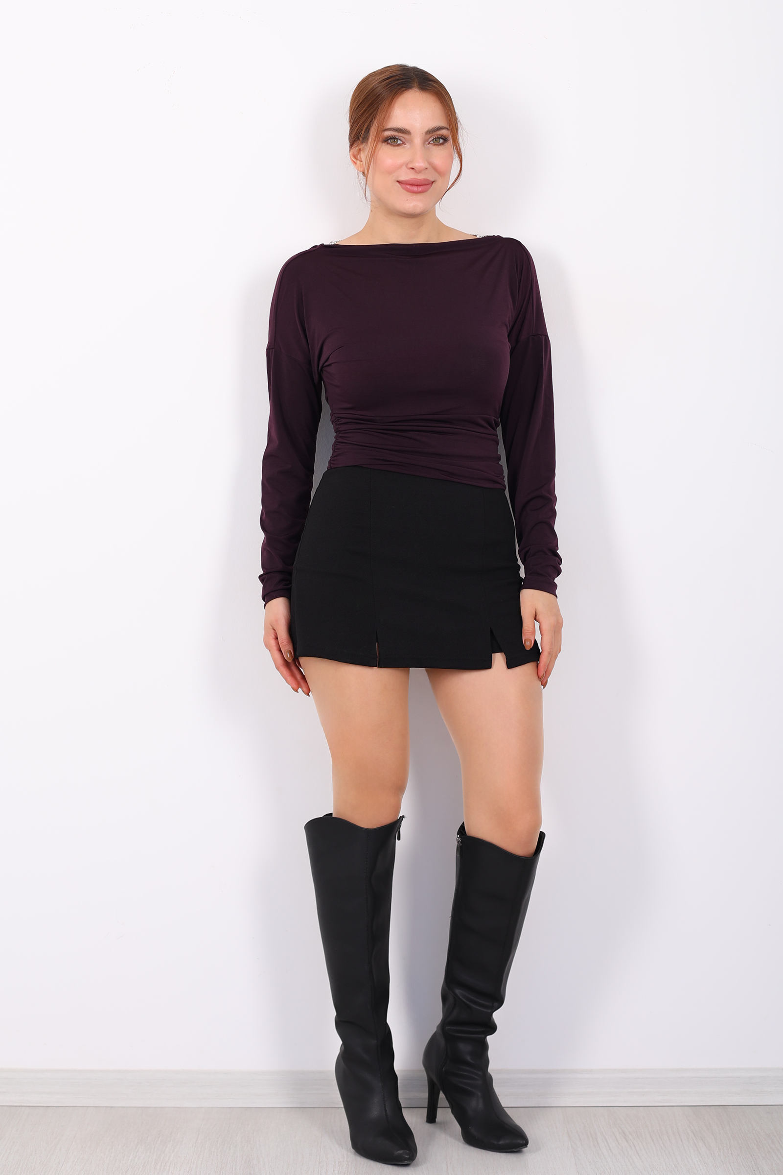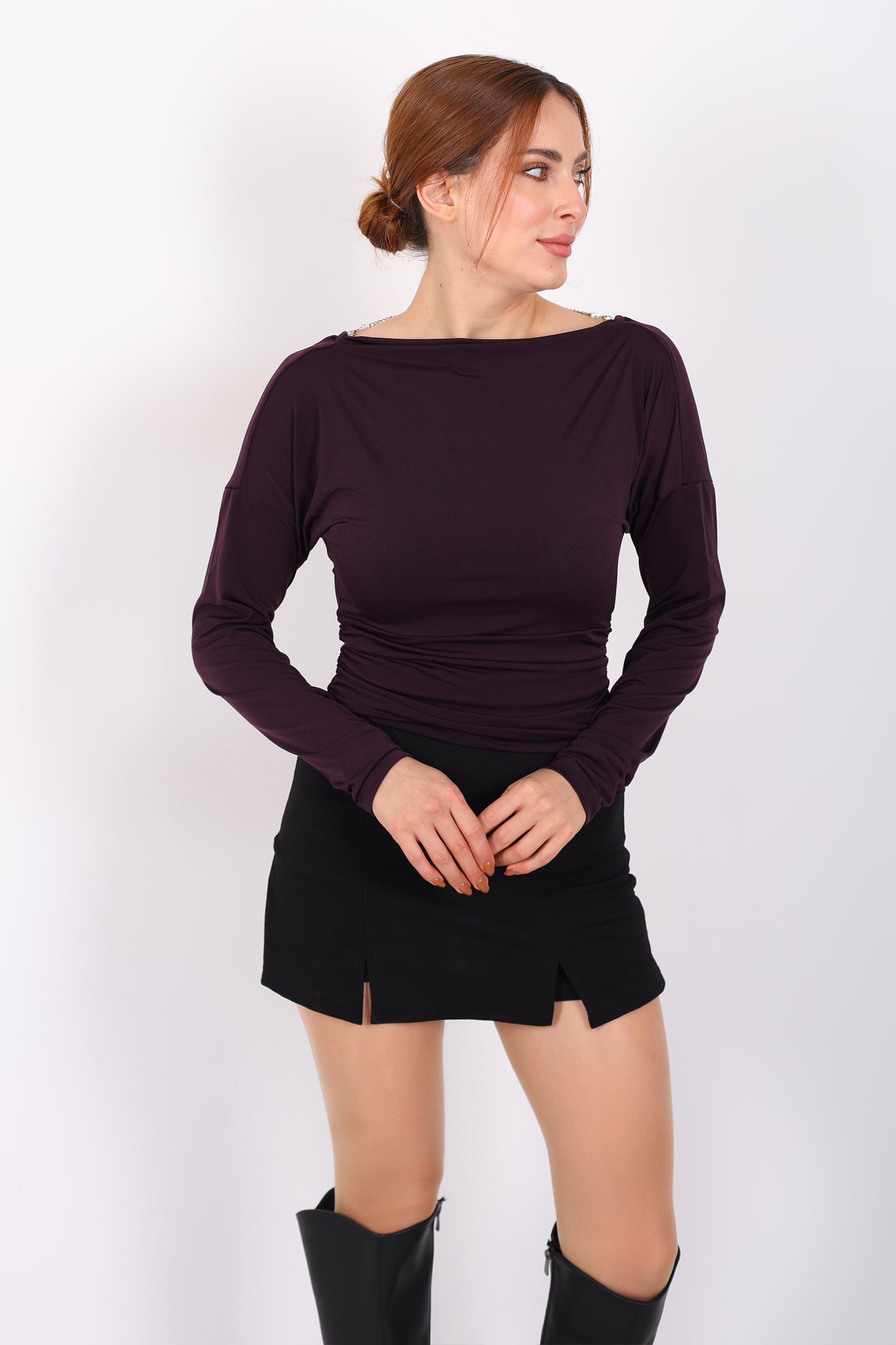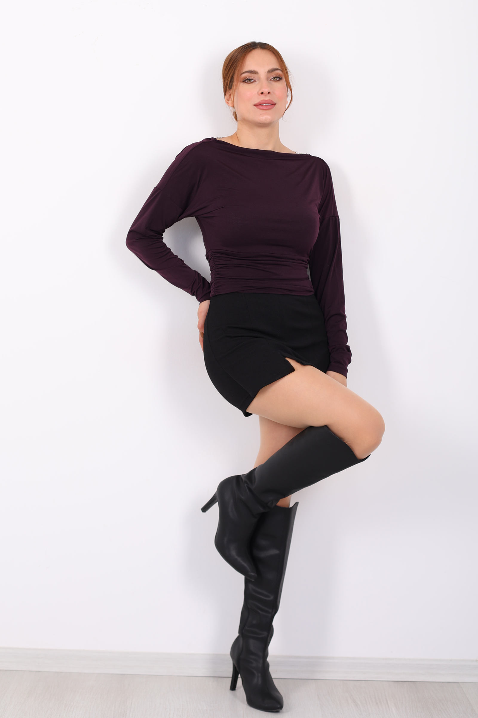 Kayık Yaka Drapeli Sandy Bordo Kadın Bluz