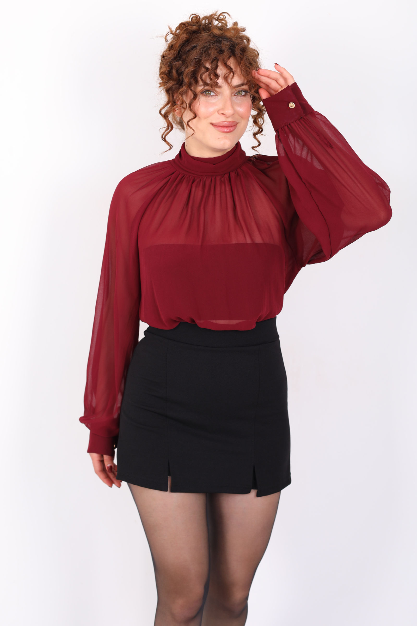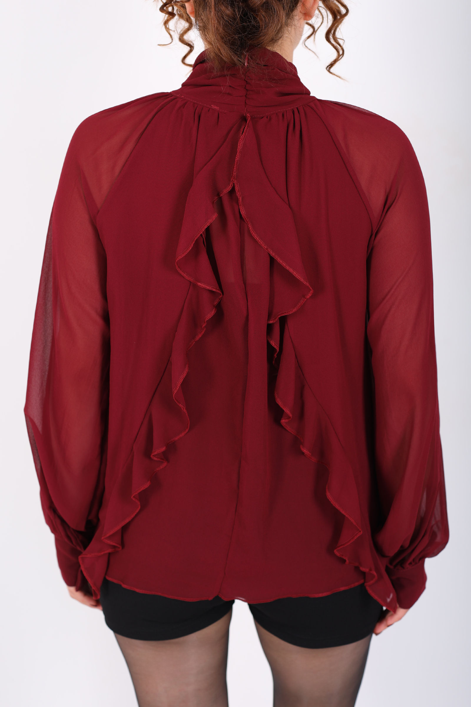 Arkası Fırfırlı Pelerin Kesim Kadın Bordo Şifon Bluz