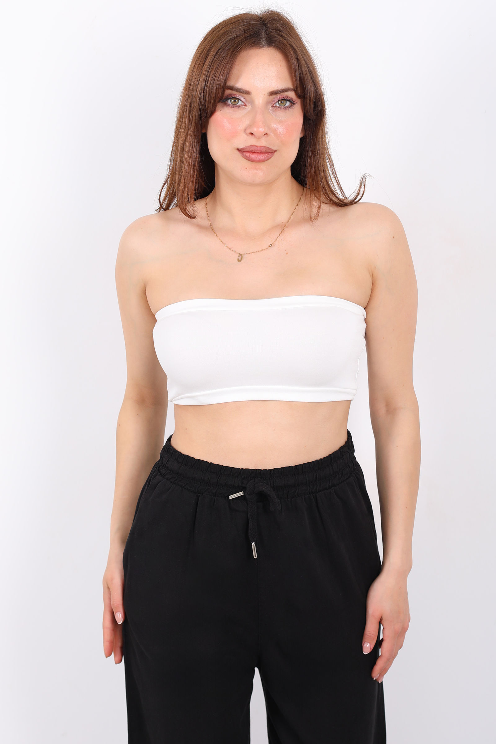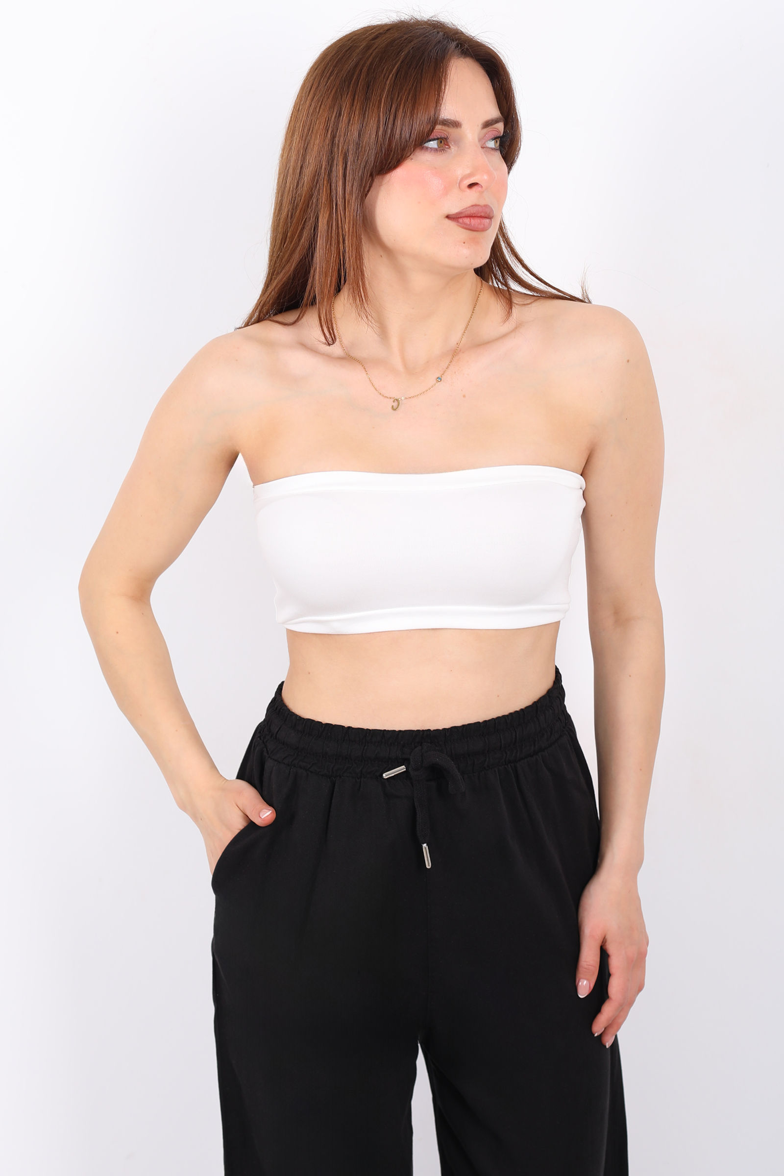 Arkası Lastikli Straplez Kadın Beyaz Mini Crop