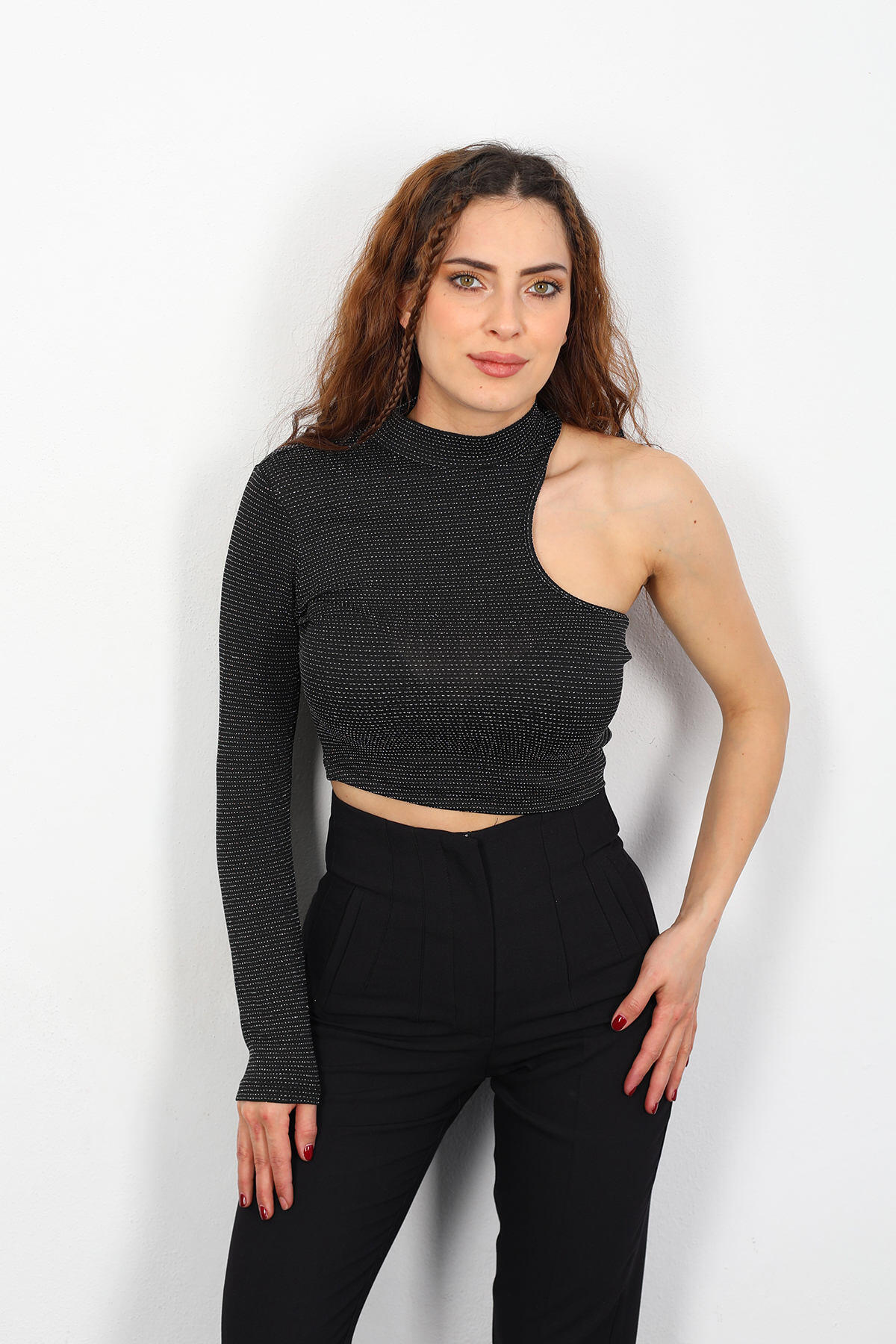 Asimetrik tasarımın modern dokunuşuyla şıklığınızı zirveye taşıyın. Bu siyah crop bluz, tek omuz detayı ve simli dokusuyla gece davetlerinden özel etkinliklere kadar her anınıza ışıltı katacak. Esnek kumaşı ve vücuda oturan kesimiyle hem rahat hem de şık bir görünüm sunar. Minimalist detaylarıyla sade şıklığı tercih edenler için ideal bir parça. Berox’un zarif dokunuşuyla tasarlanan bu bluz, stilinizi tamamlamak için mükemmel bir seçenek.
