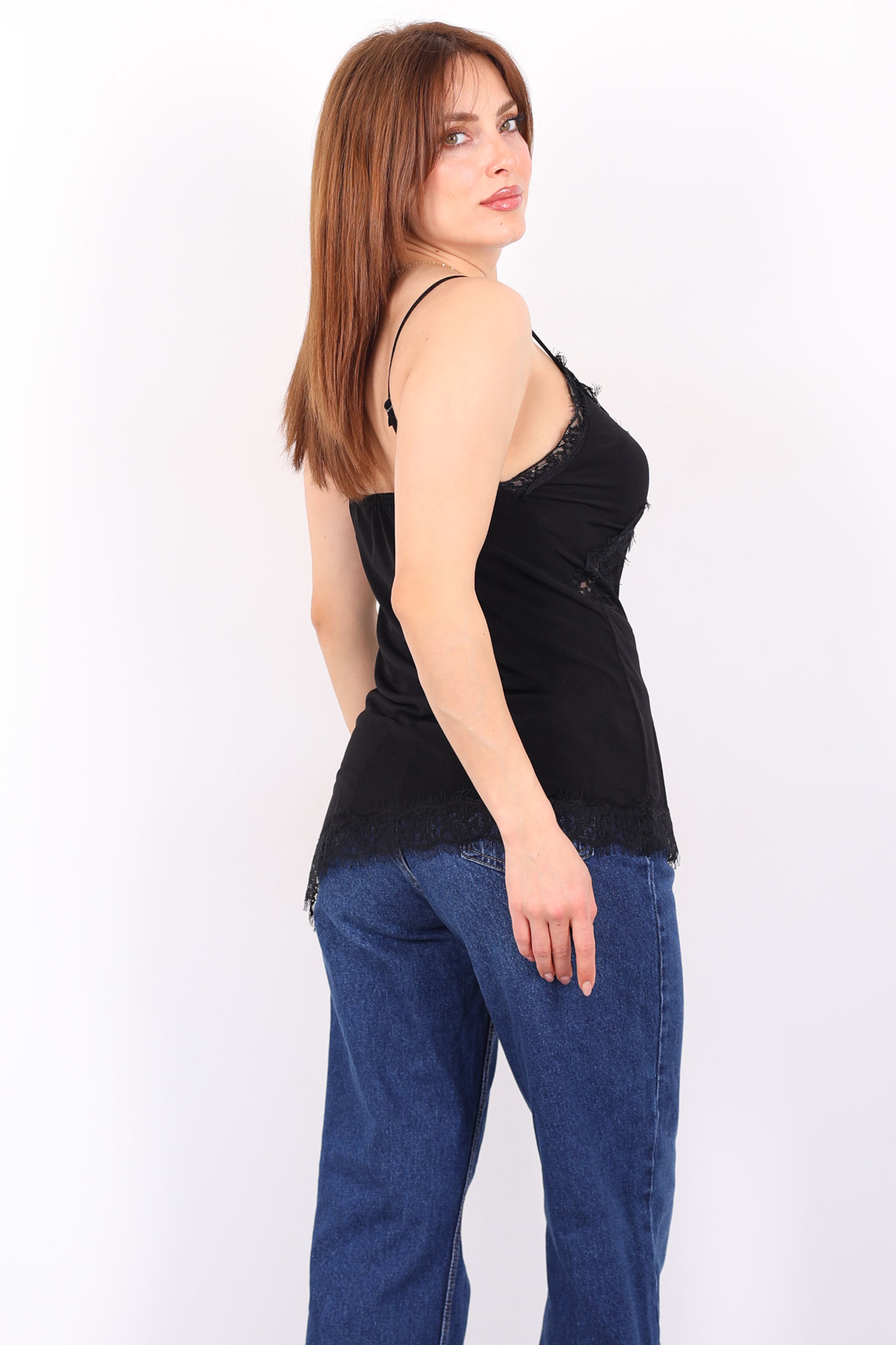 Bu asimetrik dantel detaylı askılı siyah kadın bluz, feminen ve dikkat çekici tasarımıyla kombinlerinize zarafet katar. İnce askılar ve dantel işçiliği, üst kısmın narin bir dokunuşla öne çıkmasını sağlar. Asimetrik kesim hem modern hem de dinamik bir siluet oluşturur; ister jean ister etekle kombinleyerek gündüzden geceye stilinizi tamamlayabilirsiniz. Siyah renk derinliği sayesinde minimal ya da iddialı tüm aksesuarlarla uyum sağlar.