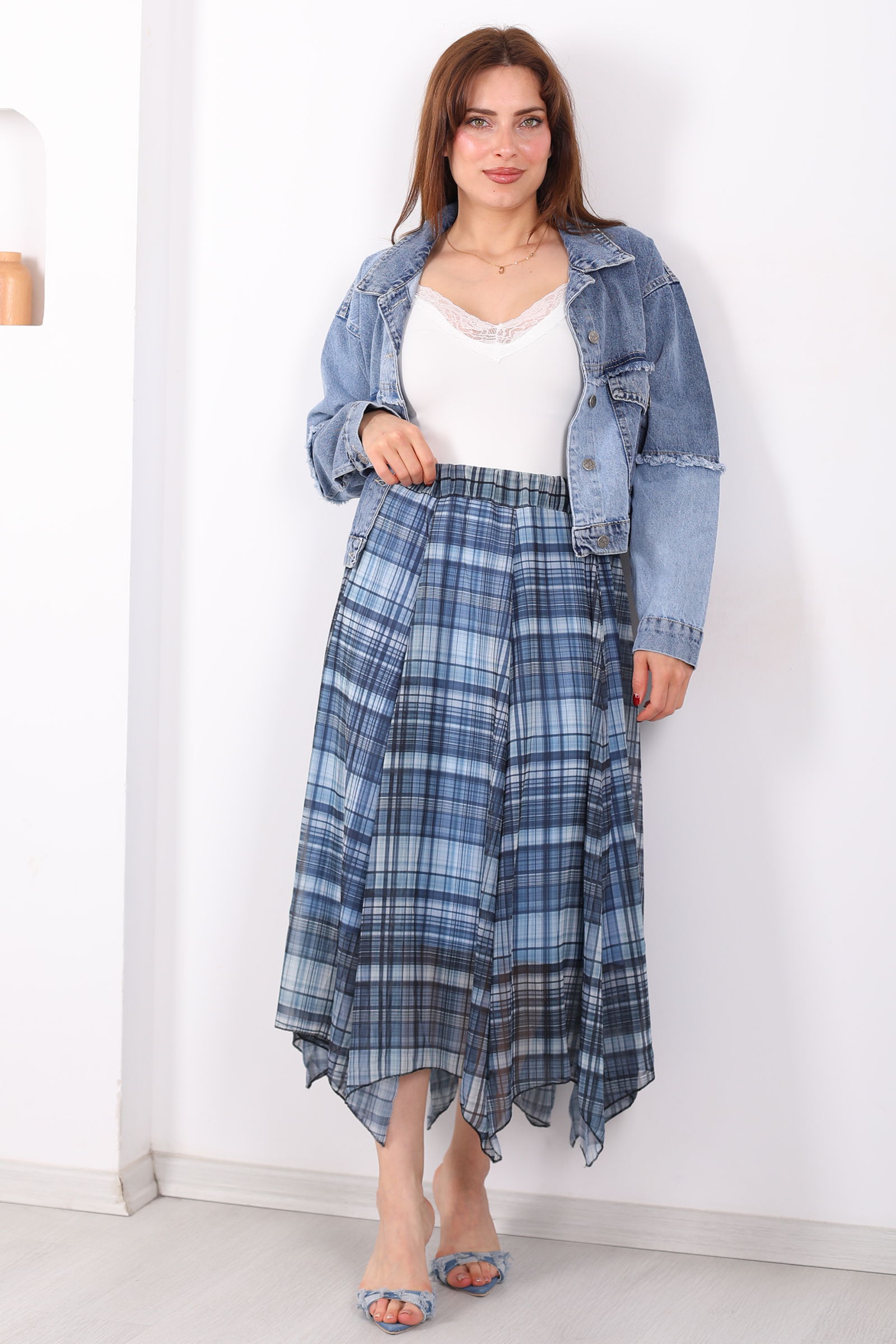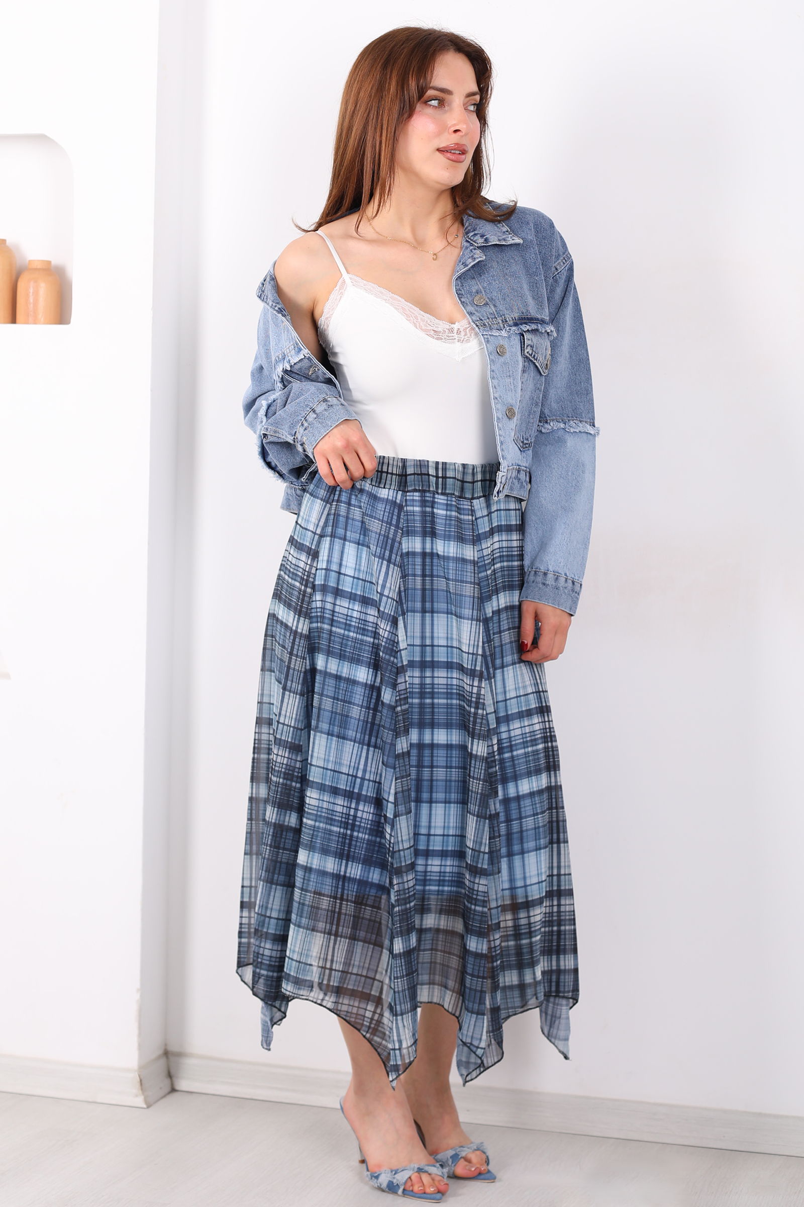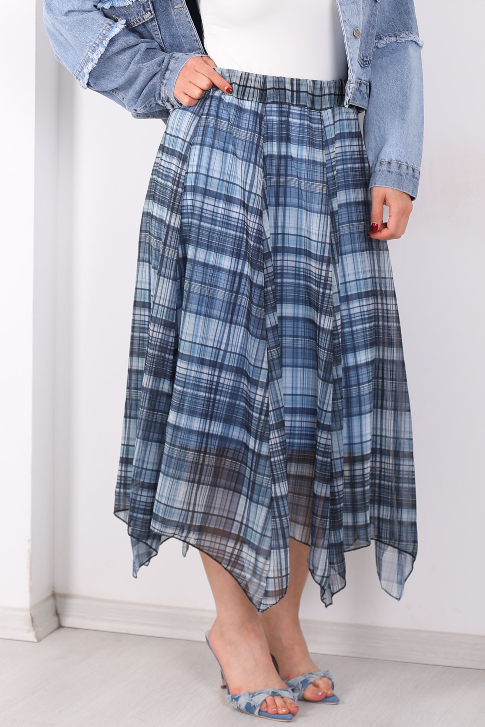 Asimetrik Kesim Ekose Desen Marin Kadın Şifon Etek