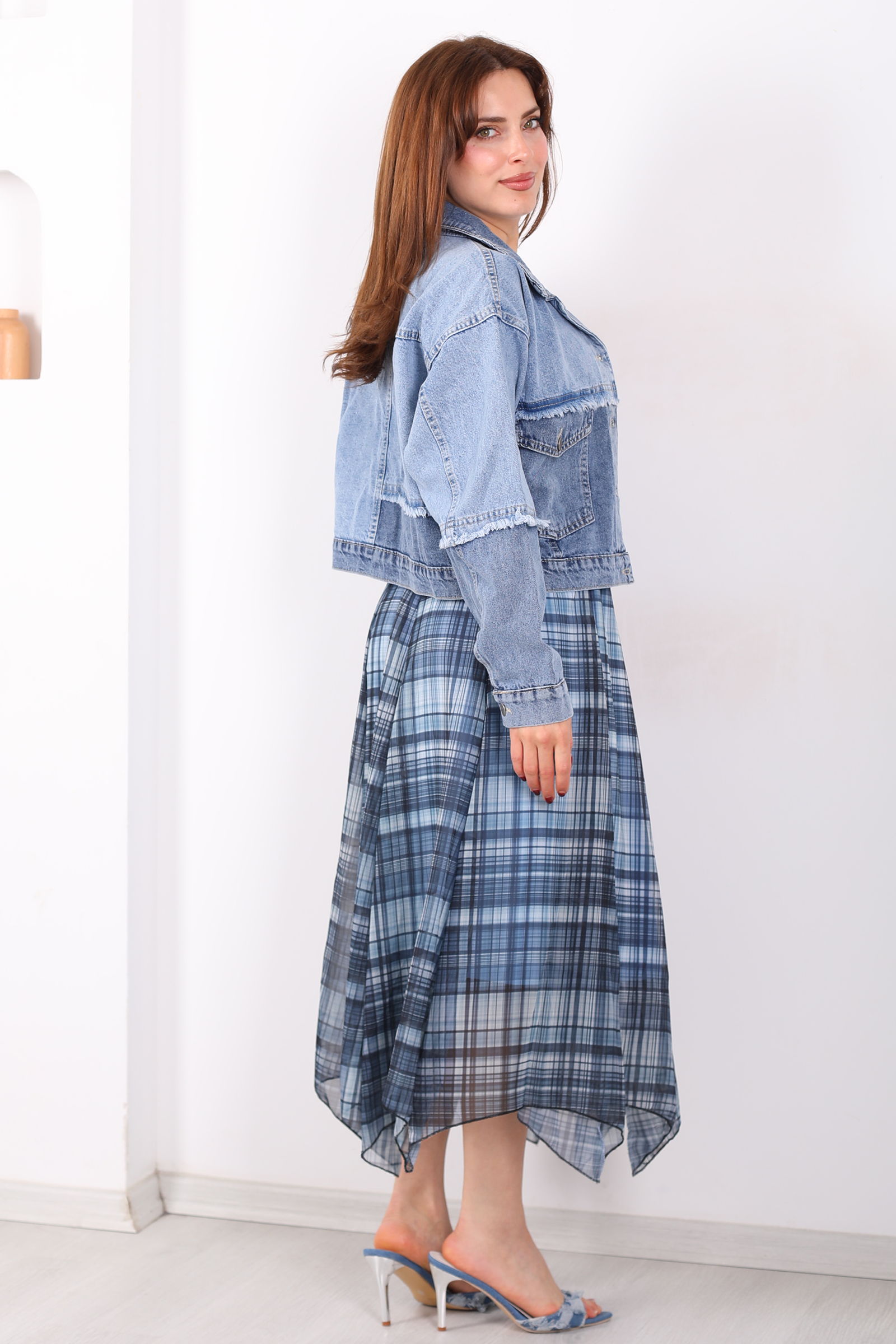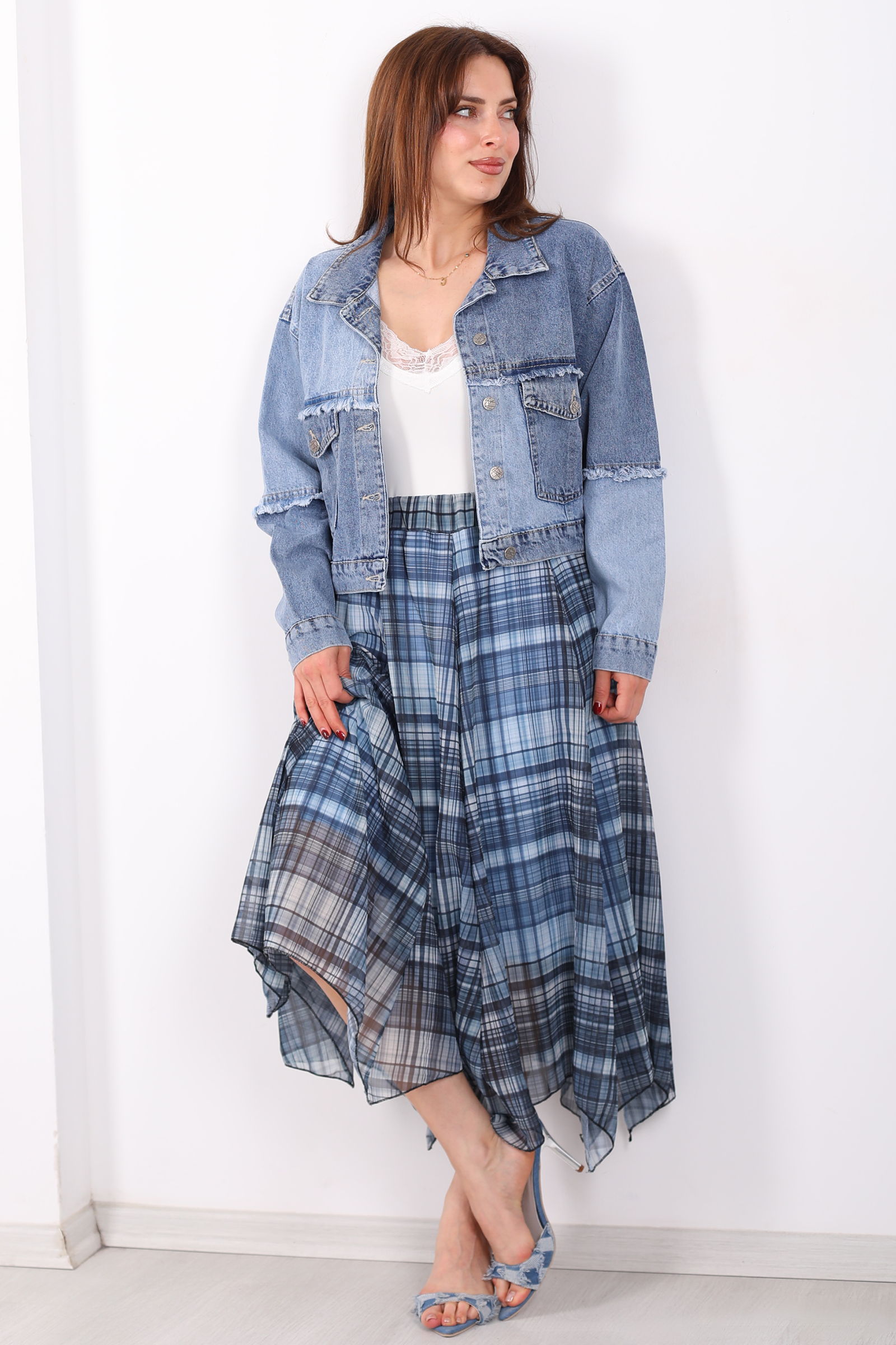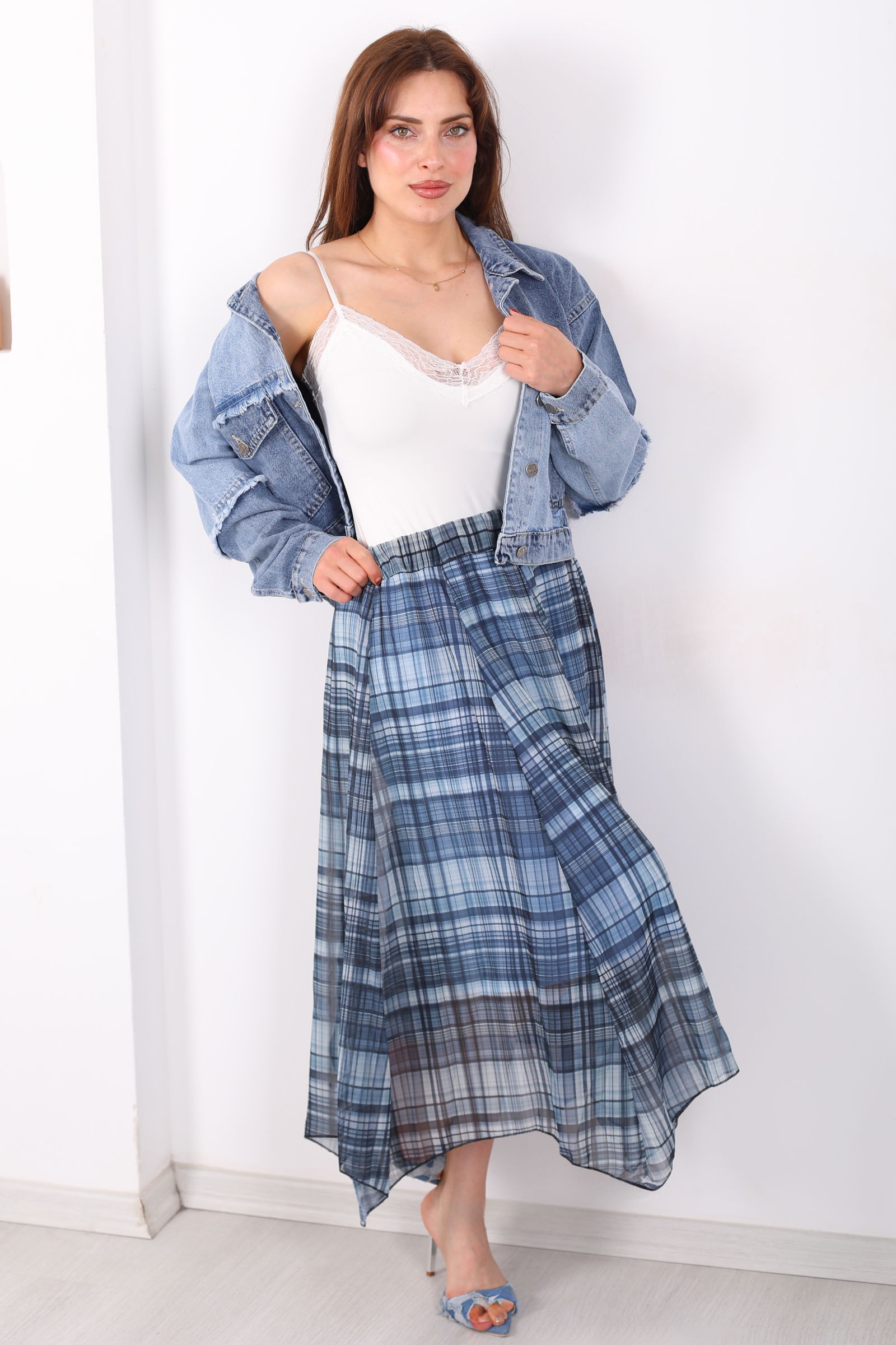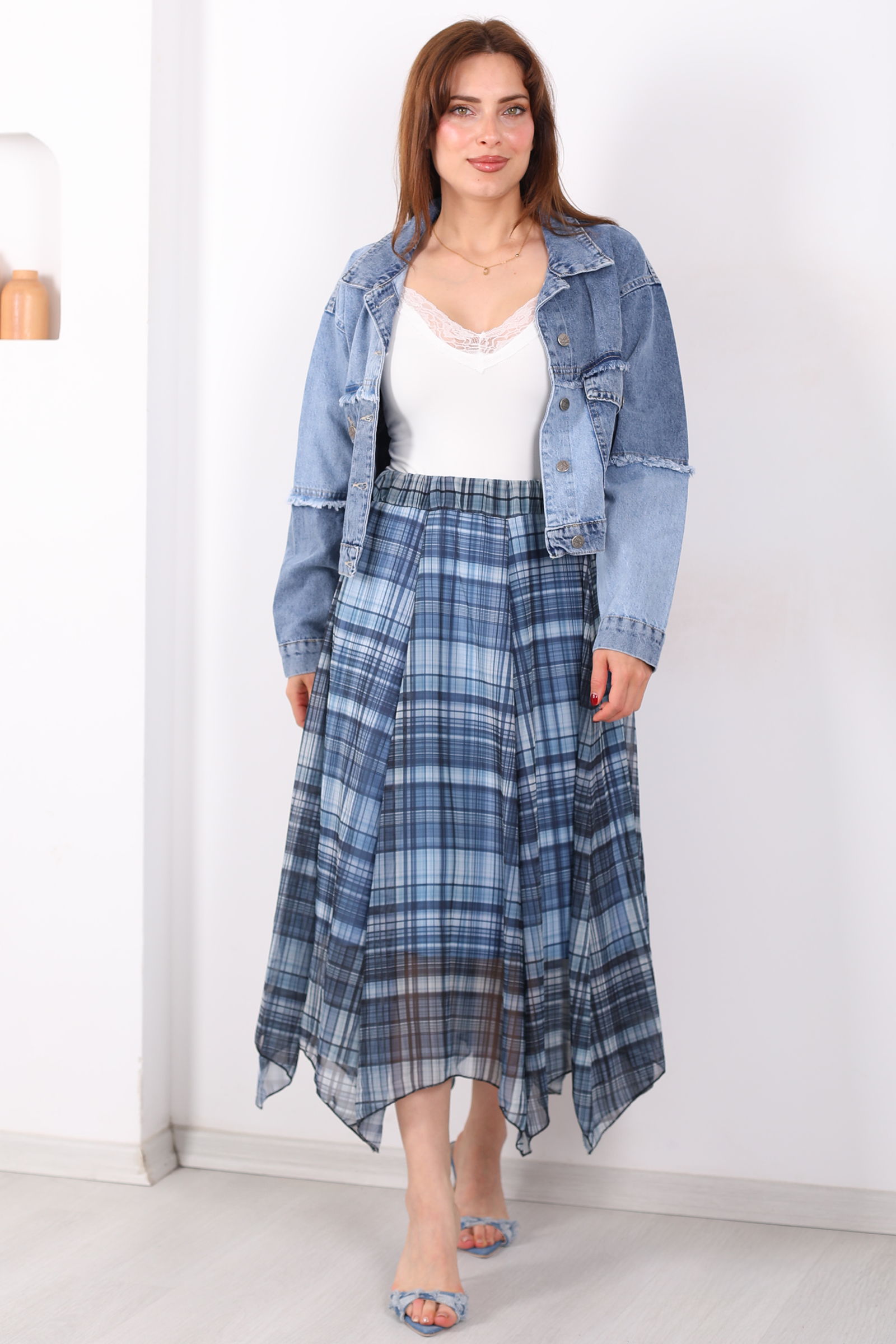 Asimetrik Kesim Ekose Desen Marin Kadın Şifon Etek