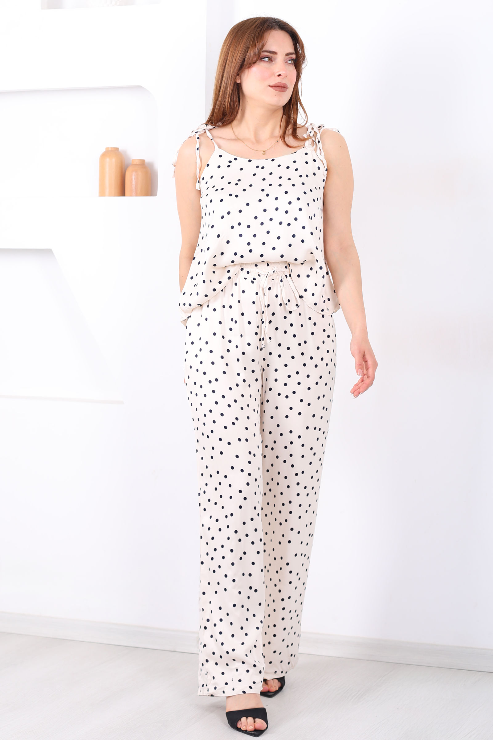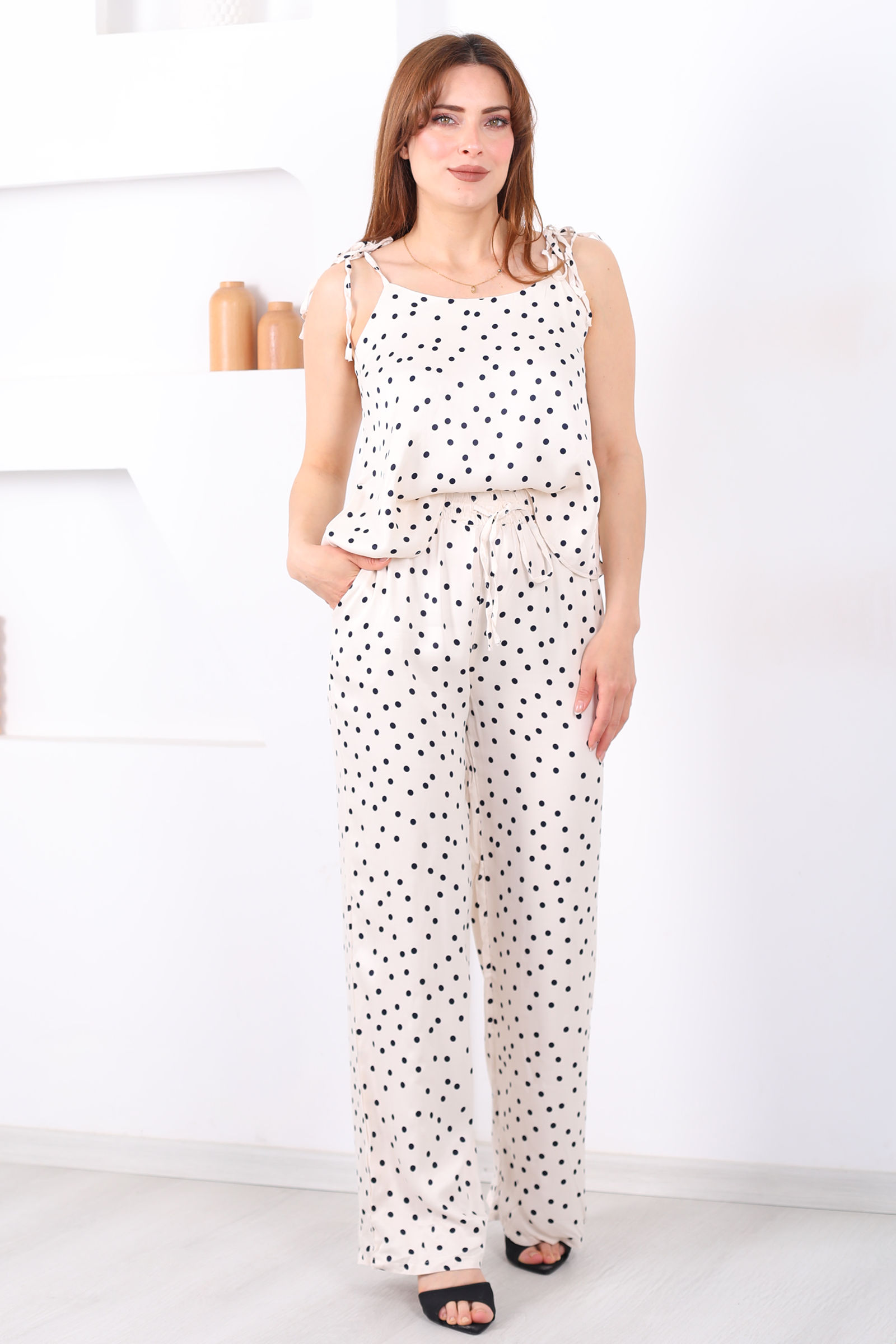 Askıları Bağlamalı Puantiyeli Krem Kadın Saten Takım