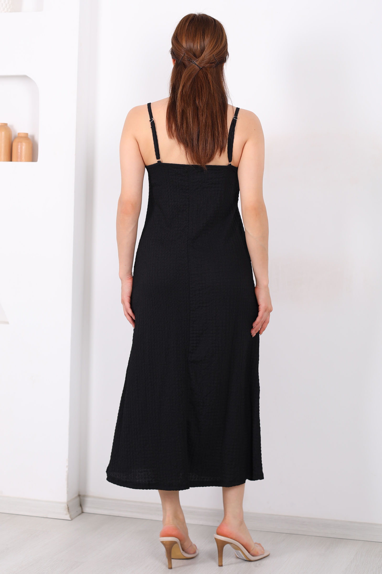 Göğüs Pileli Kemerli Önü Yırtmaçlı Siyah Kadın Elbise