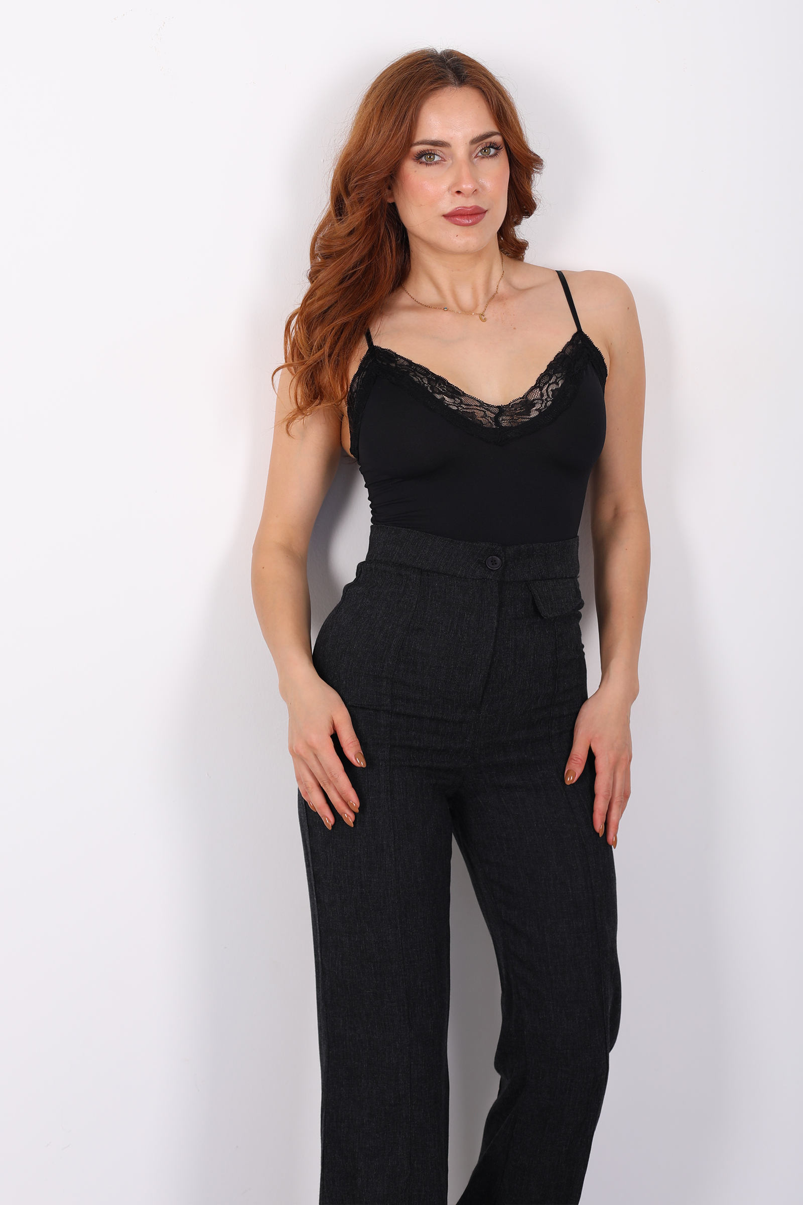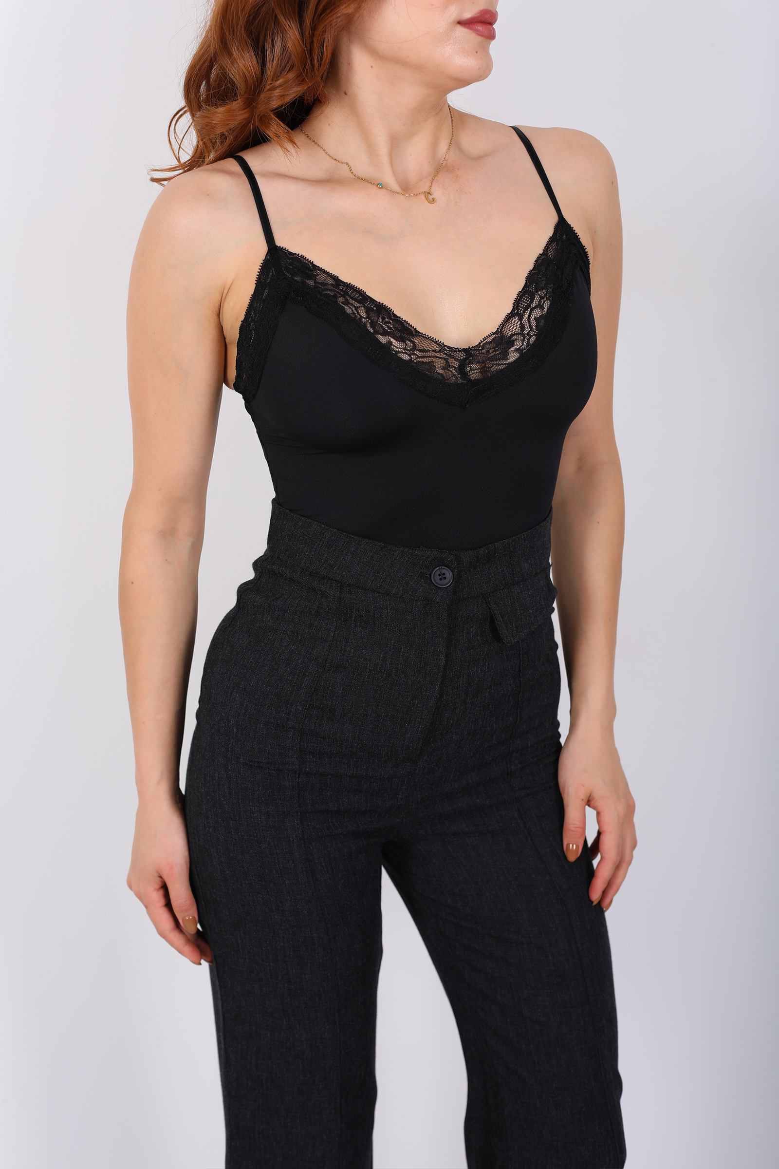 Askılı Dantel Detaylı Siyah Kadın Çıtçıtlı Body