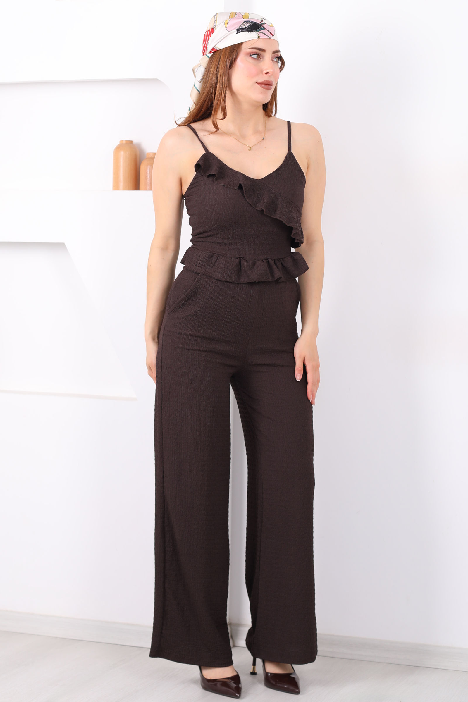 Askılı Fırfırlı Kadın Acı Kahve Bürümcük Pantolon Takım
