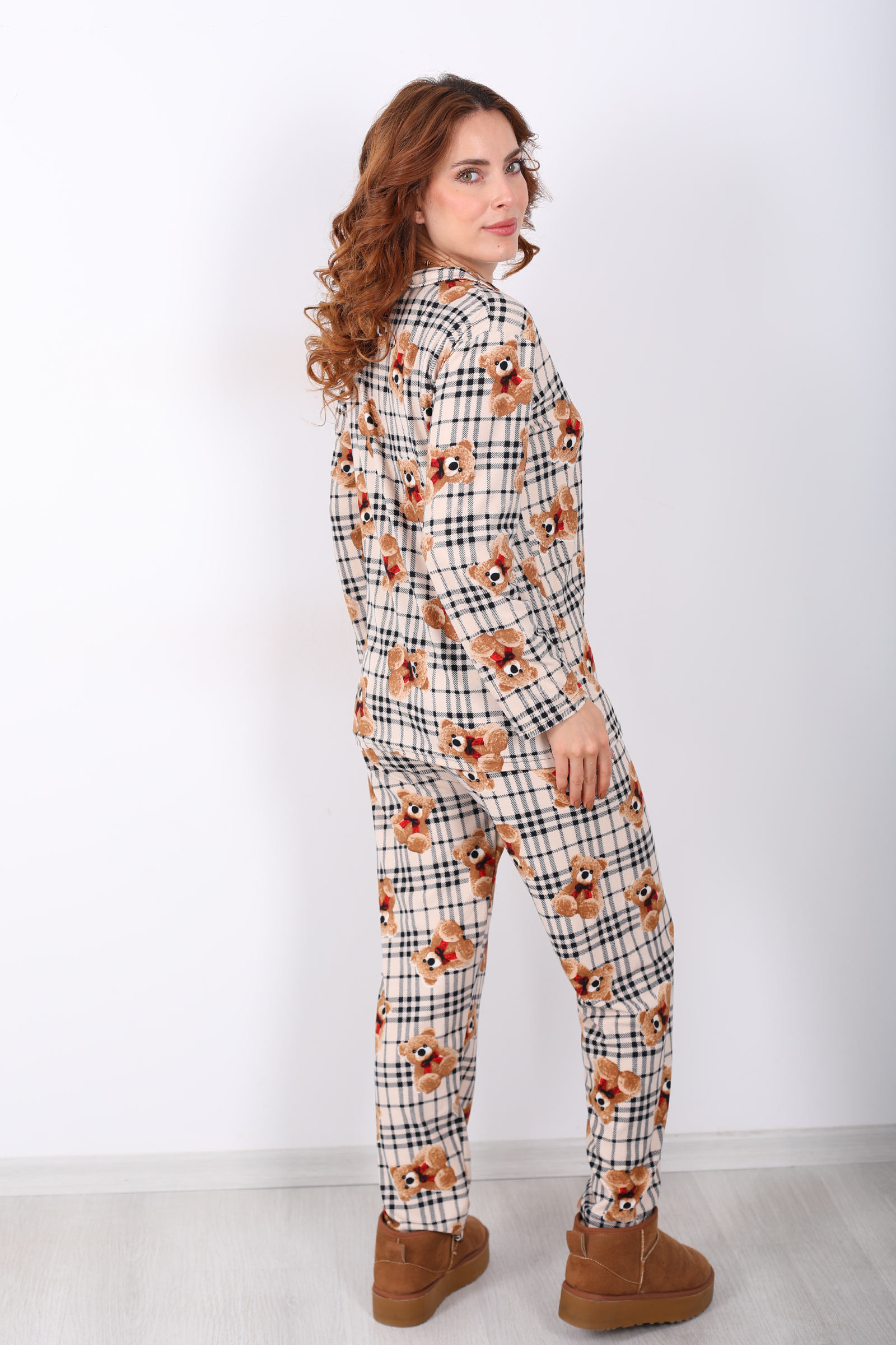 Ayıcık Ekose Desenli Krem Kadın Yumoş Pijama Takım