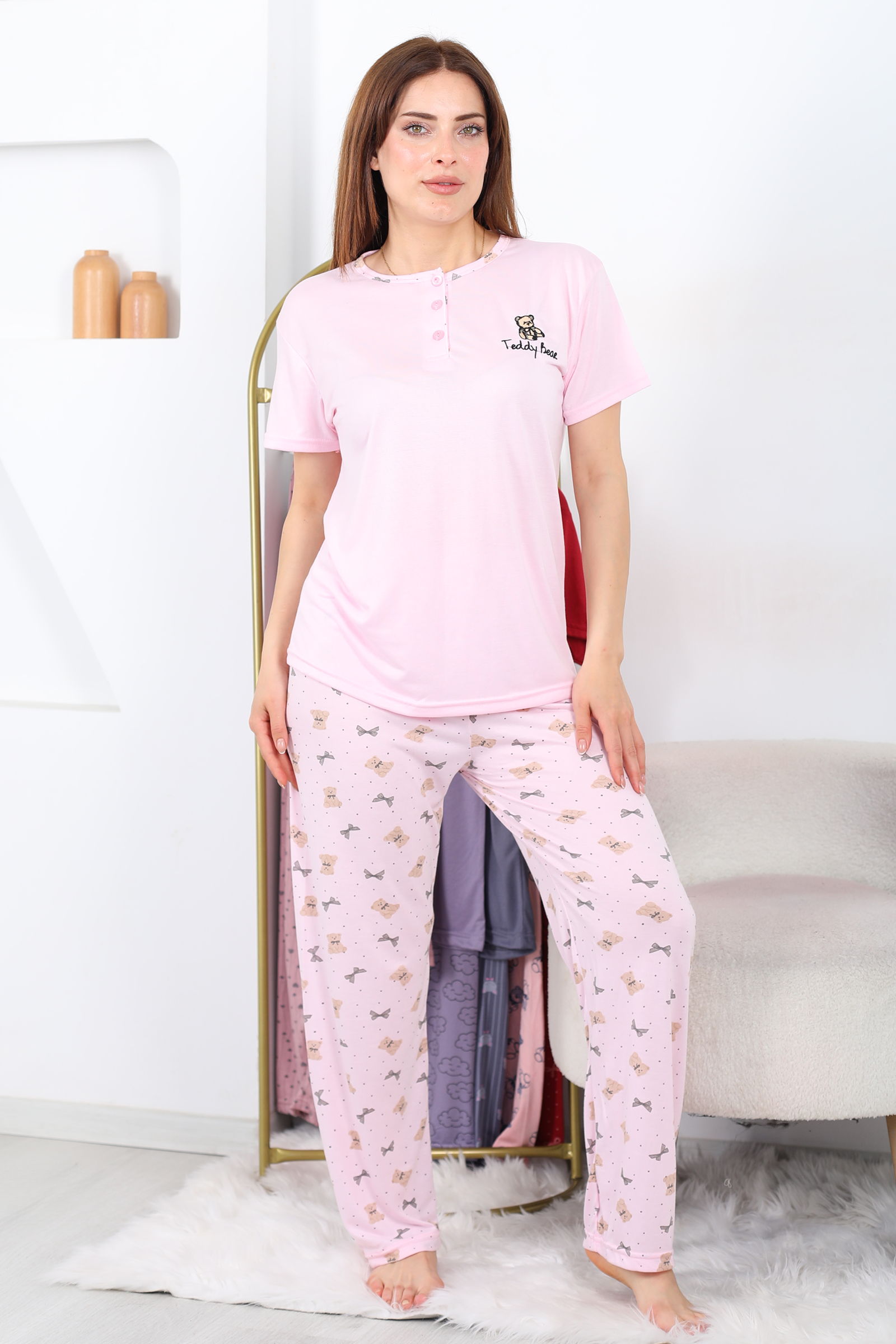 Ayıcık Desenli Pembe Kadın Yarım Düğmeli Pijama Takımı