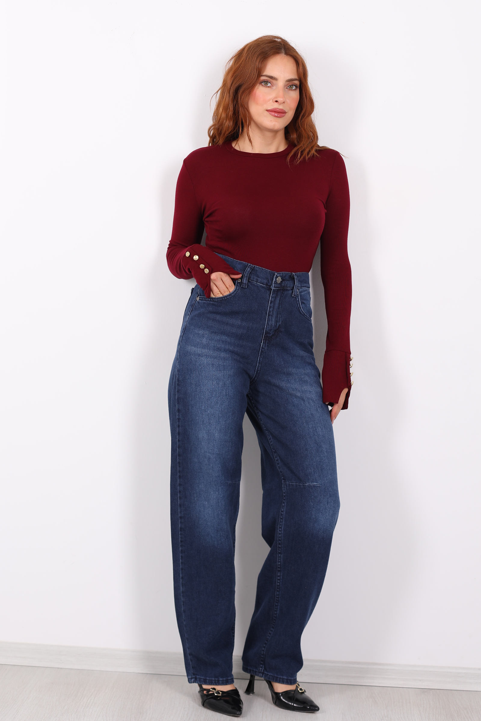 Baggy arka tokalı koyu mavi kar yıkama pantolon, geniş paça siluetiyle 90’lar ruhunu yeniden yorumluyor. Kar yıkama efekti, koyu mavi denim kumaşına derinlik ve hafif eskitilmiş bir görünüm kazandırıyor klasik kotlara göre daha yumuşak bir kontrast sunuyor.Arka tokalı detayı, sıradan bir baggy kesimi sıradışılıkla buluşturuyor. Tokalar bele ekstra vurgu yaparak hem estetik hem fonksiyonel bir dokunuş katıyor.