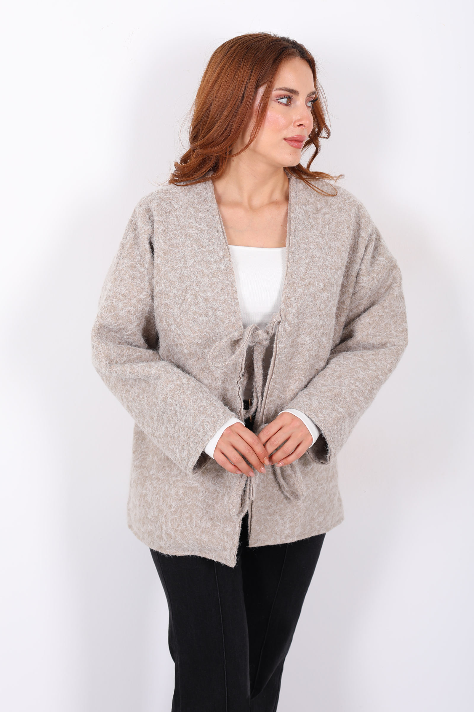 Bağlamalı Bej Kadın Sakallı Oversize Ceket