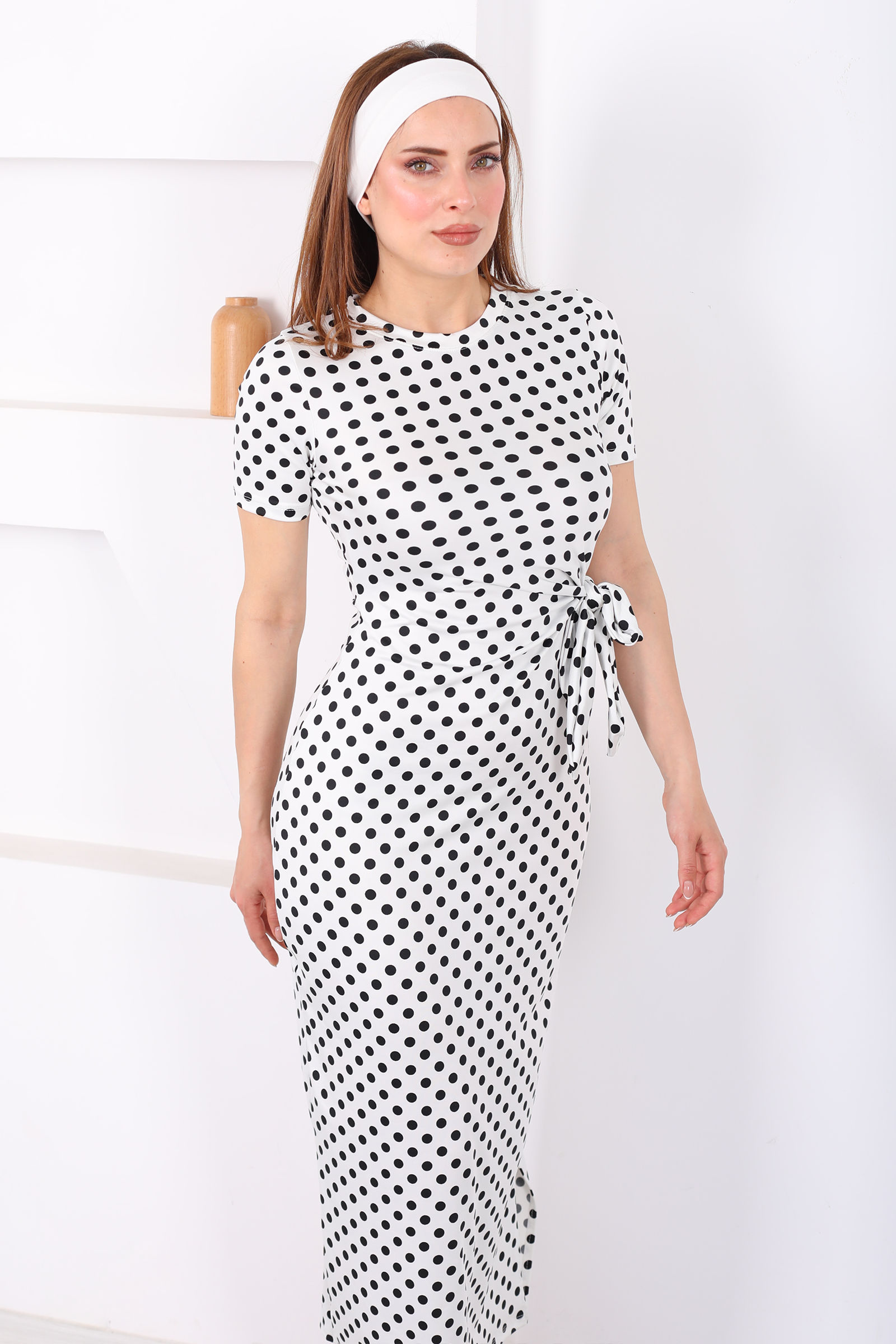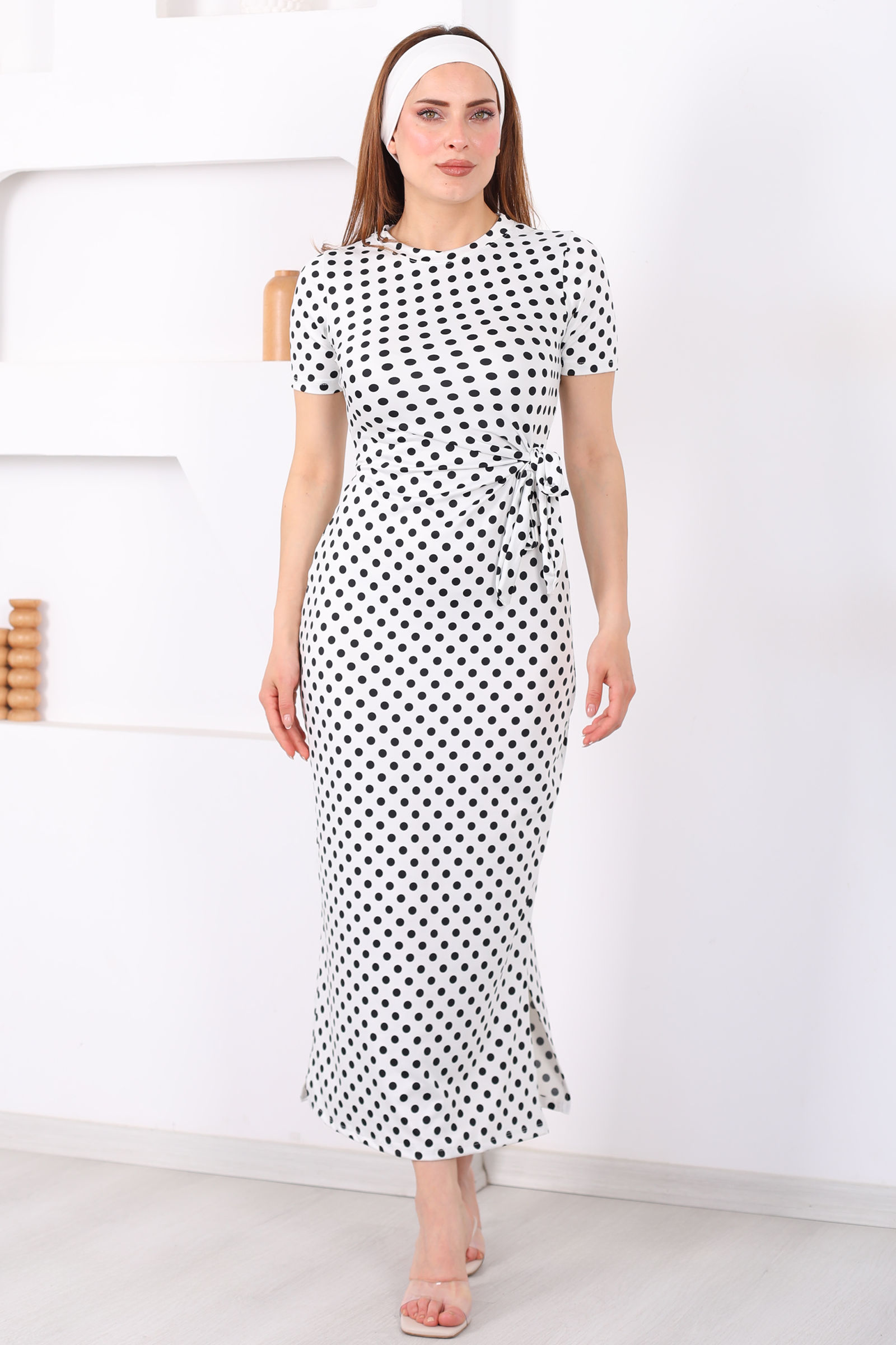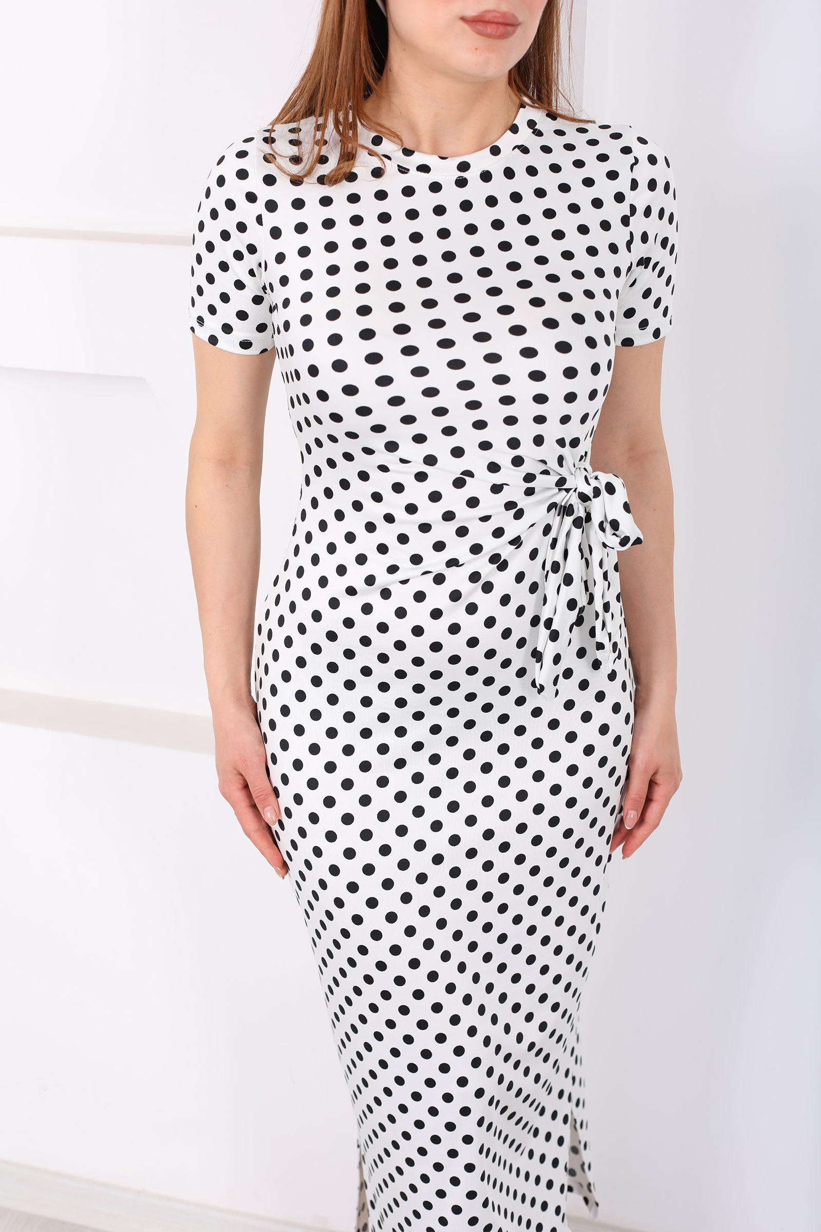 Bağlamalı Yırtmaçlı Puantiyeli Kadın Beyaz Midi Elbise