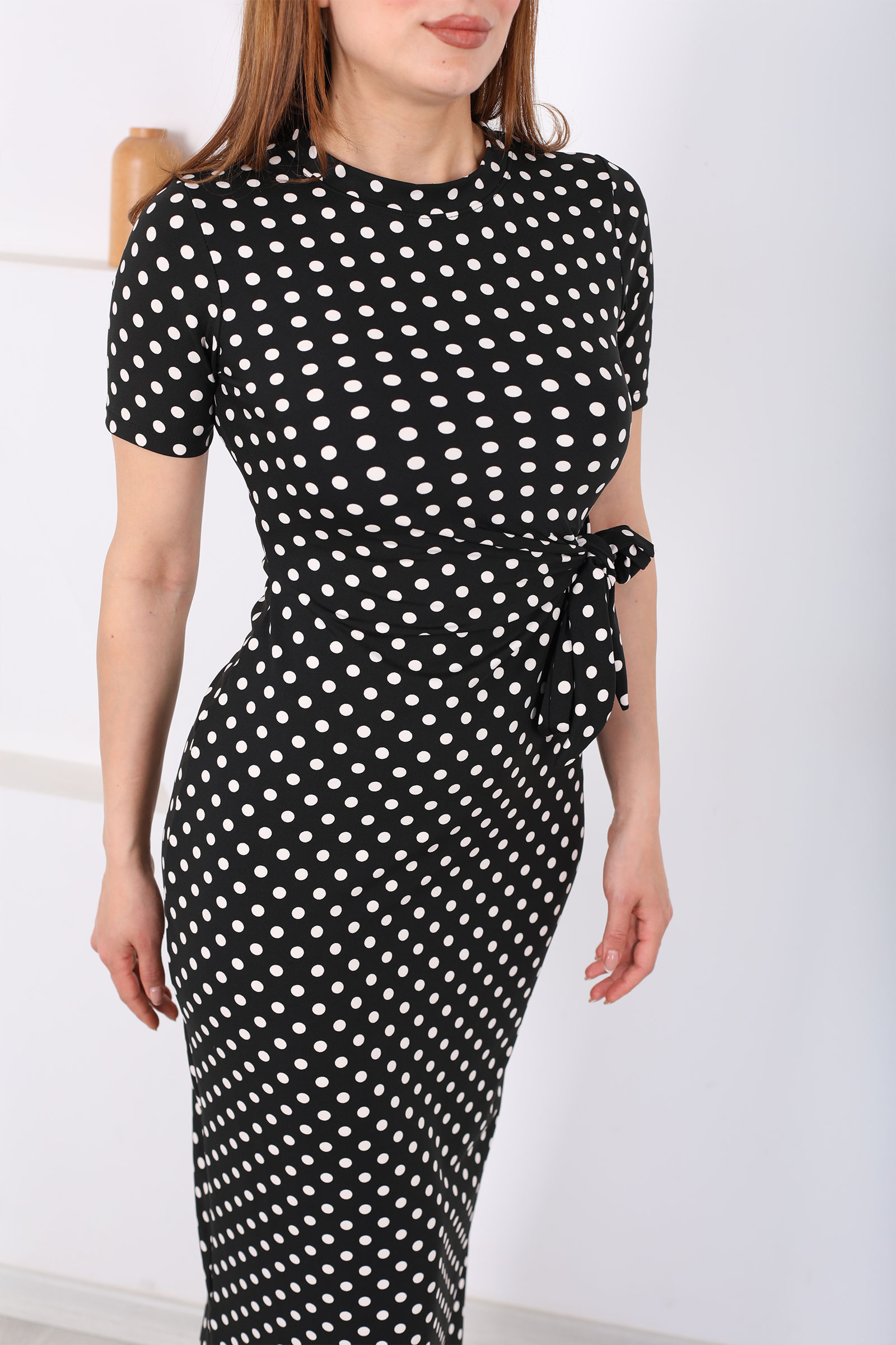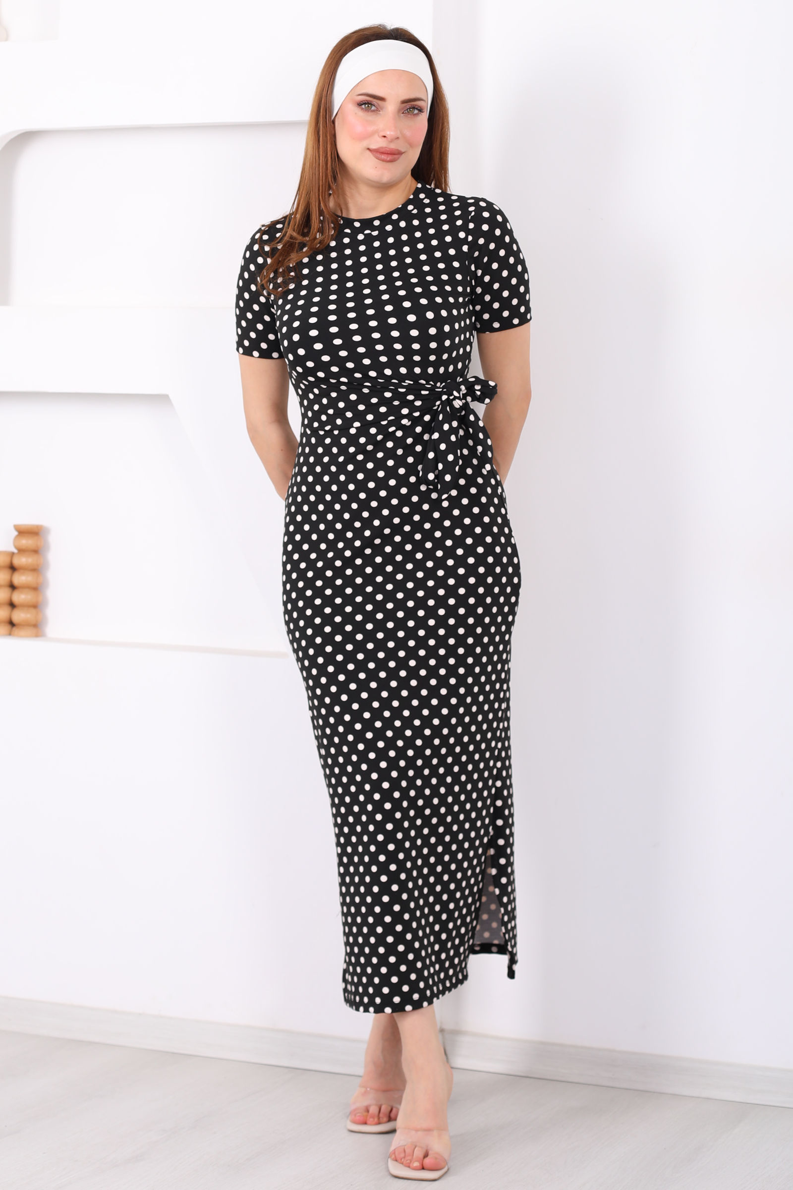 Bağlamalı Yırtmaçlı Puantiyeli Kadın Siyah Midi Elbise