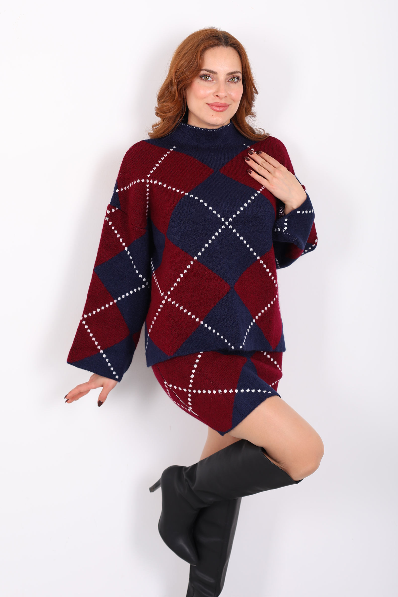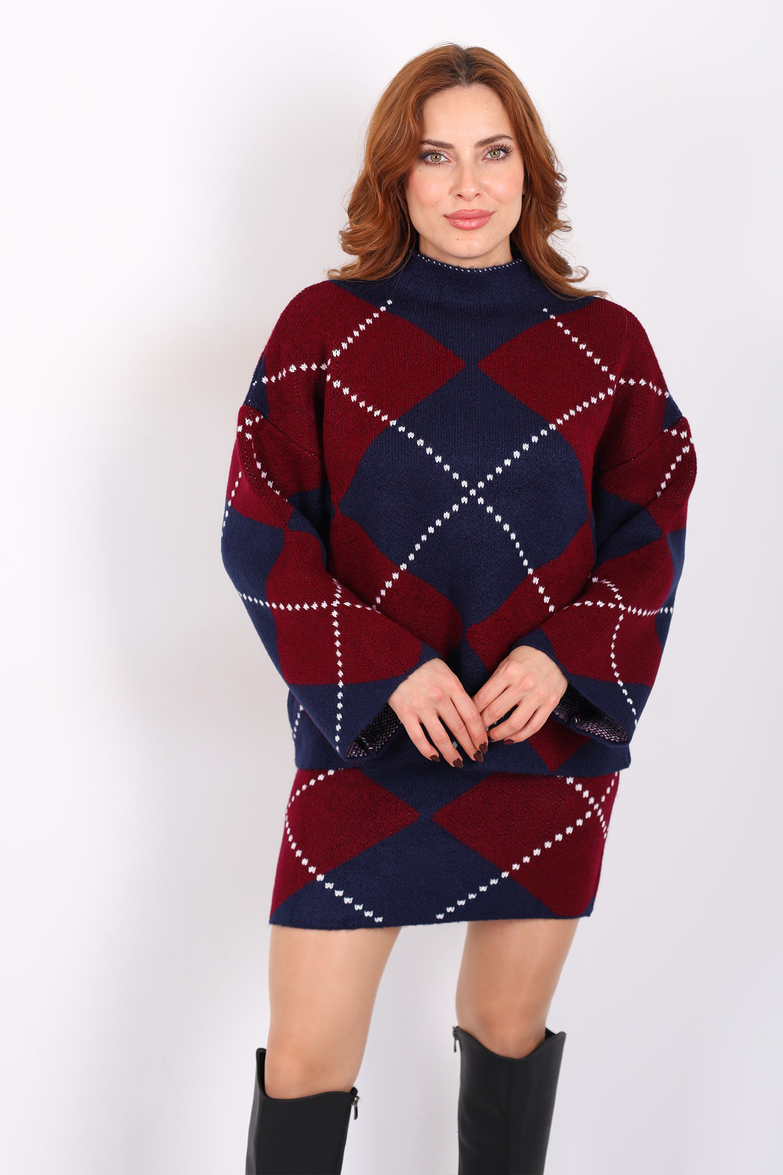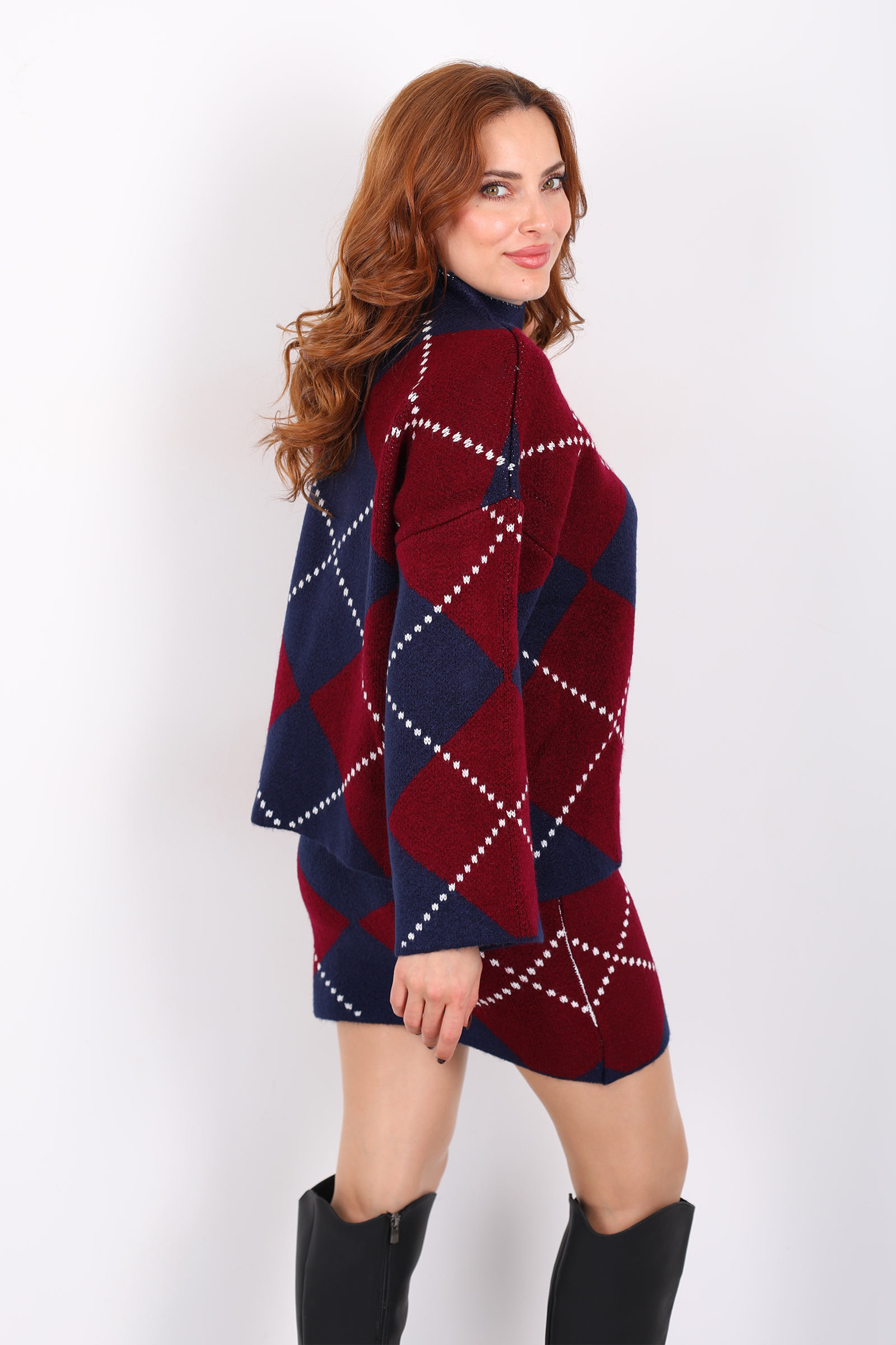 Baklava Desenli Etekli Bordo Kadın Triko Takım
