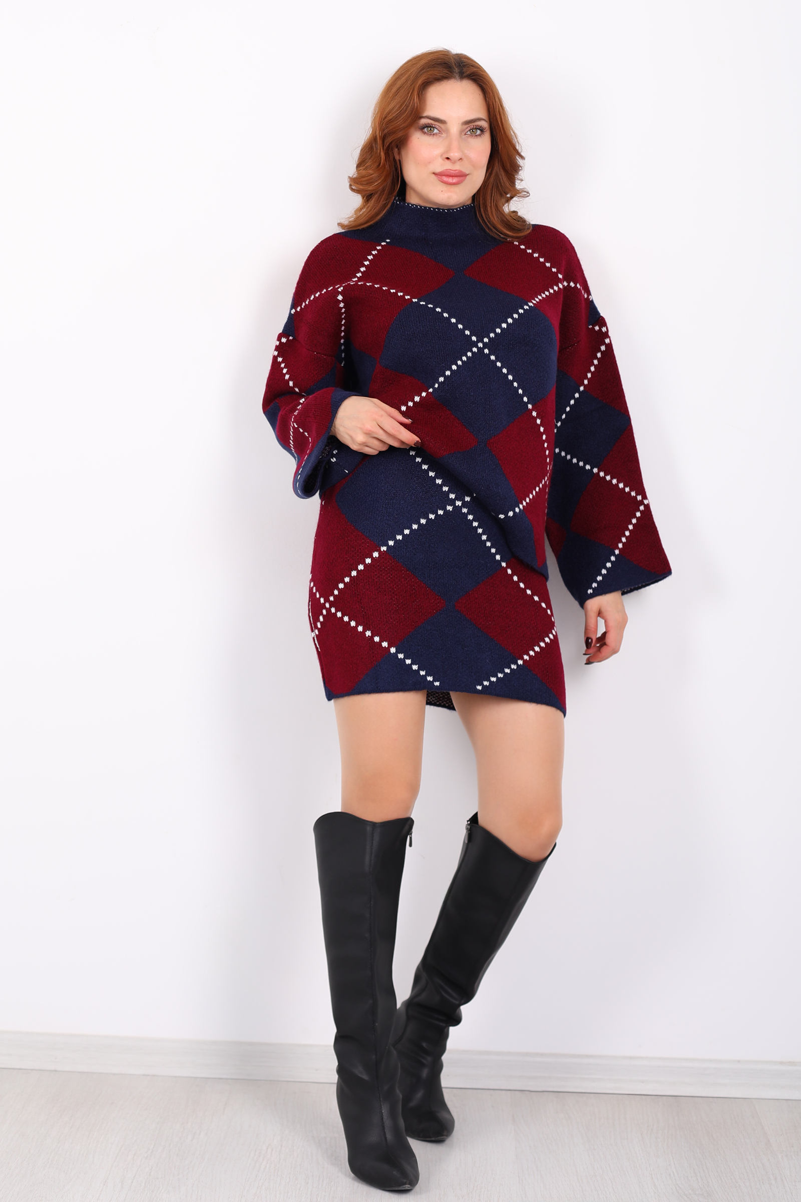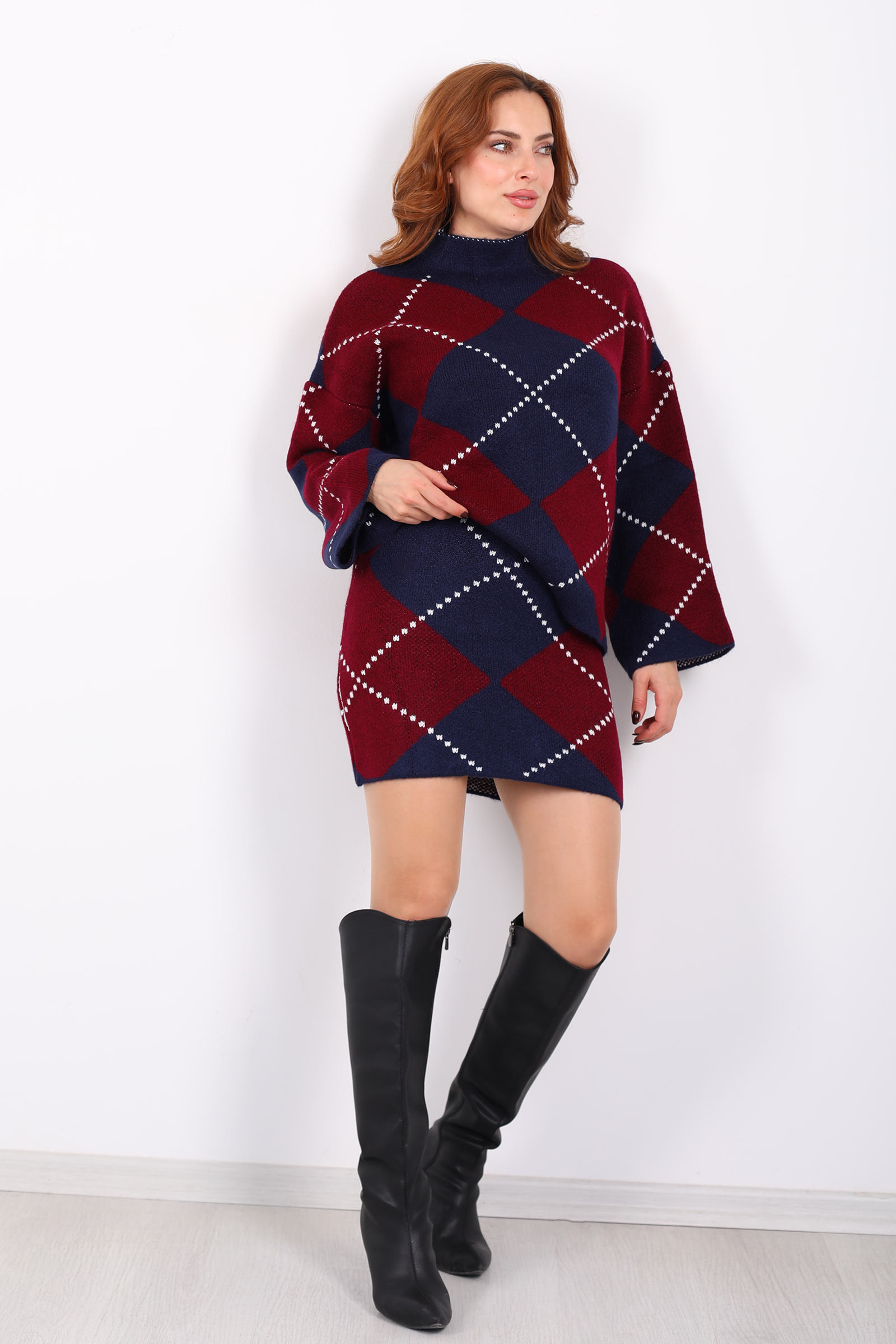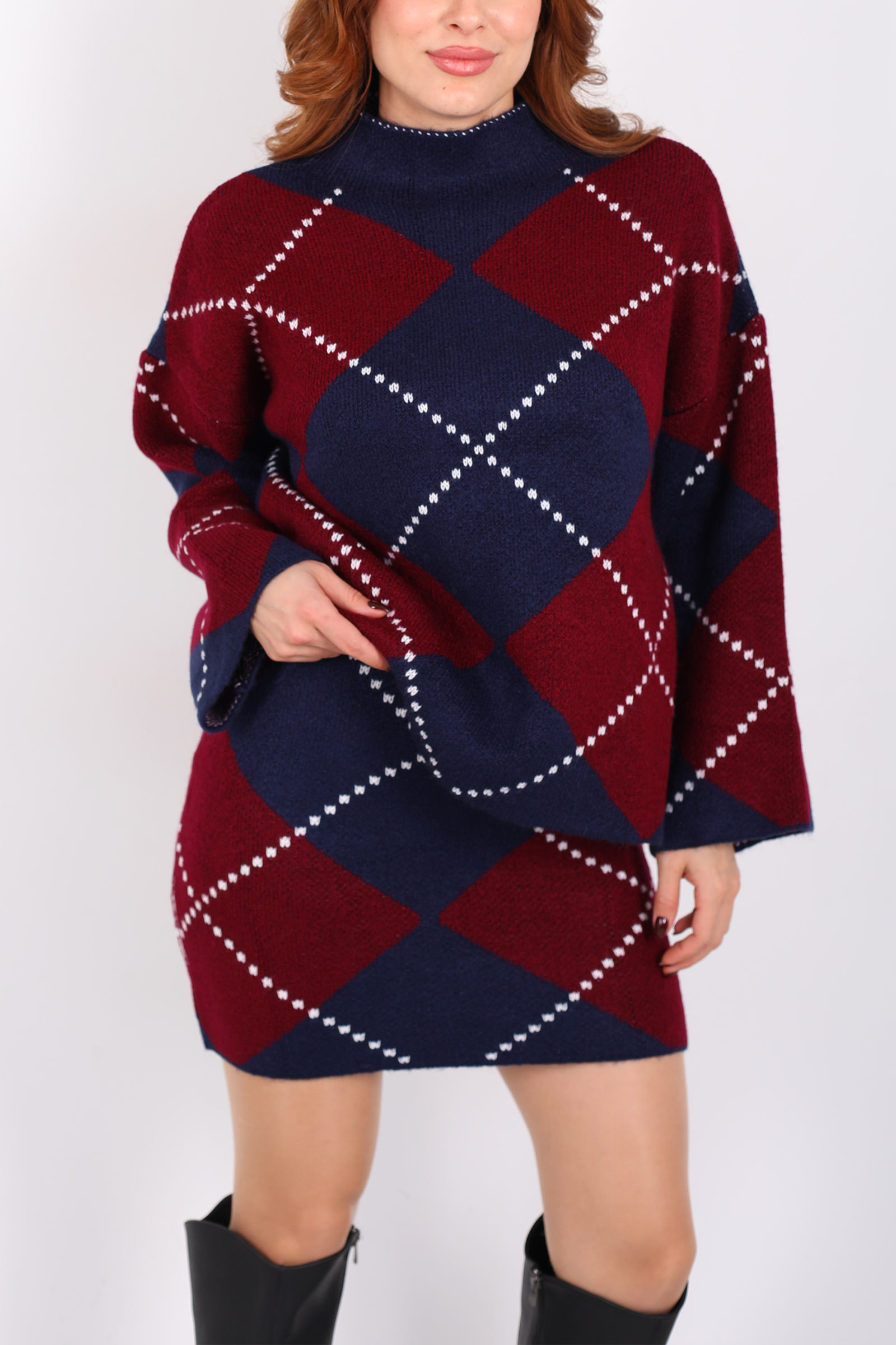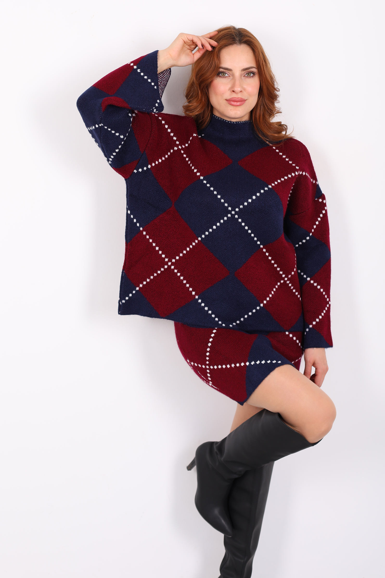Baklava Desenli Etekli Bordo Kadın Triko Takım