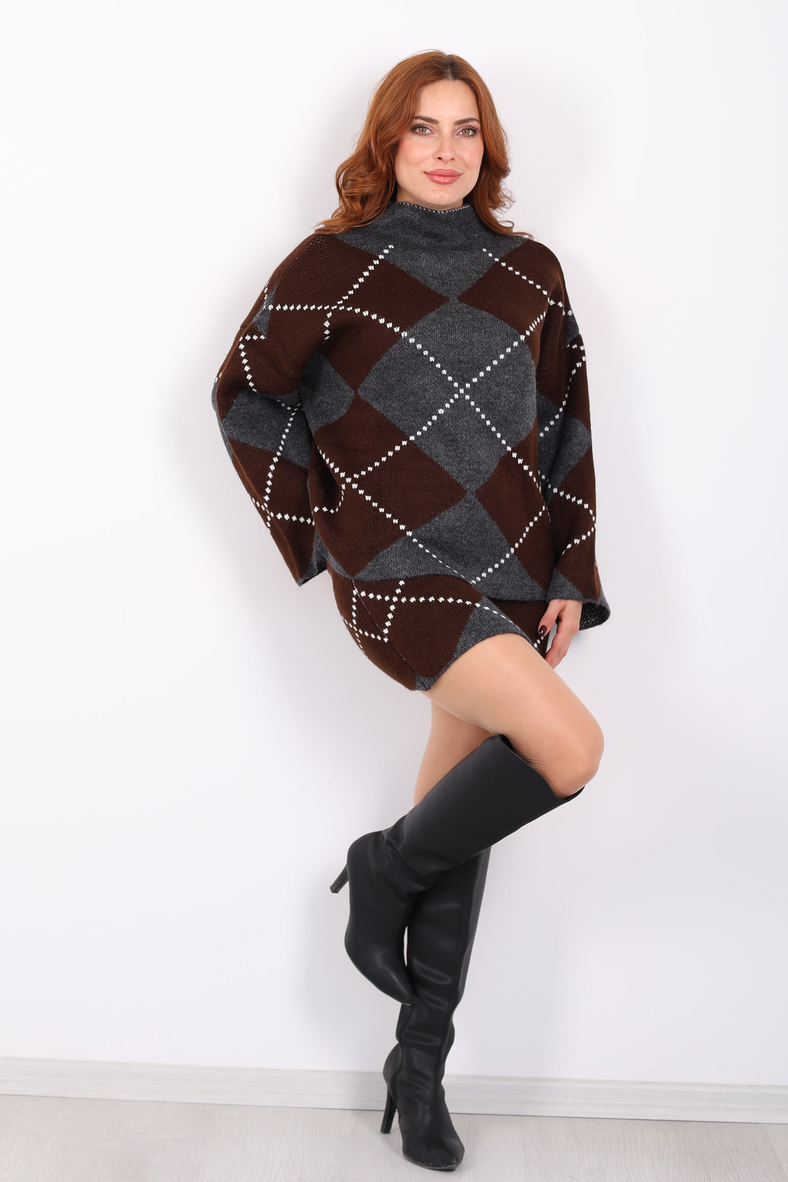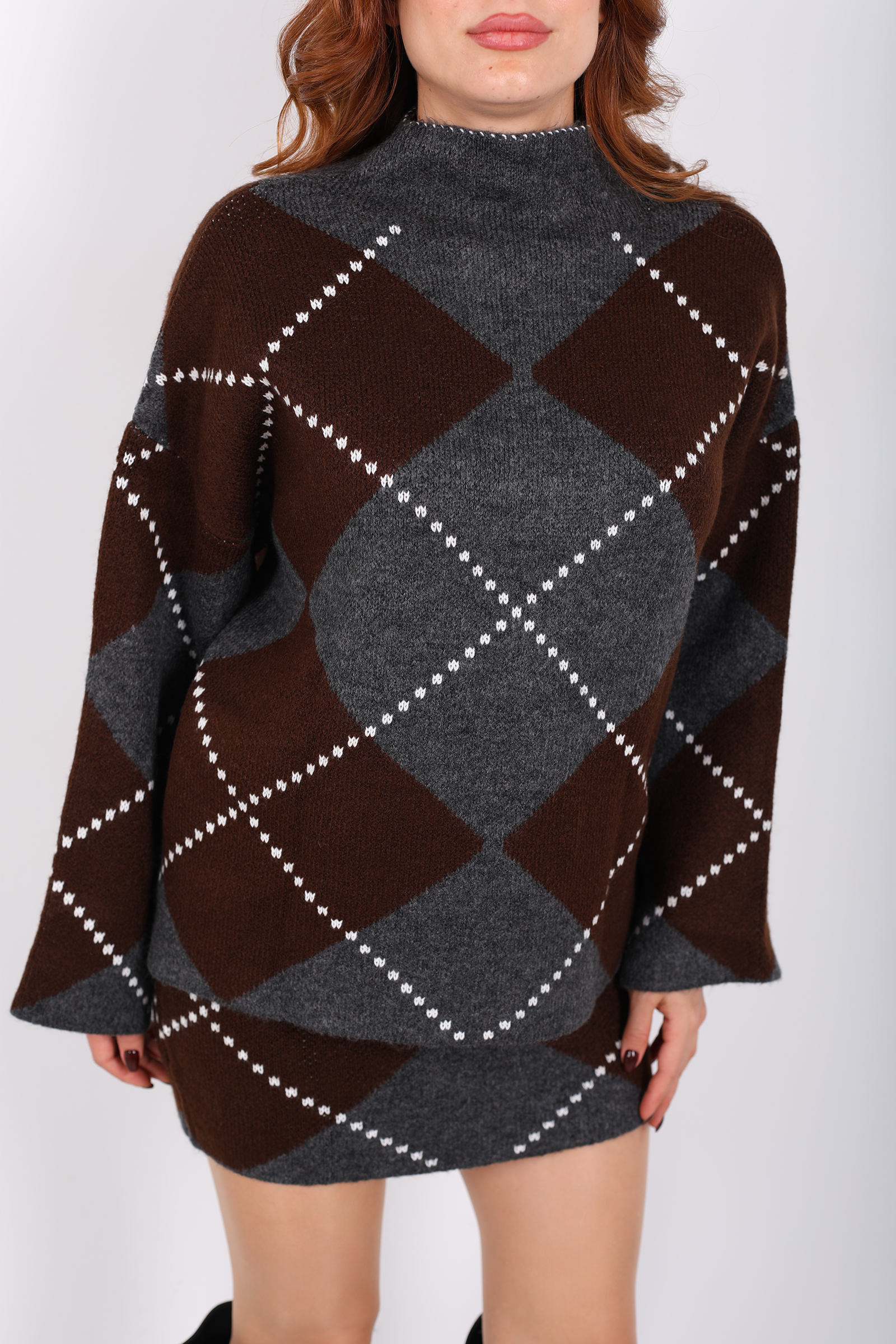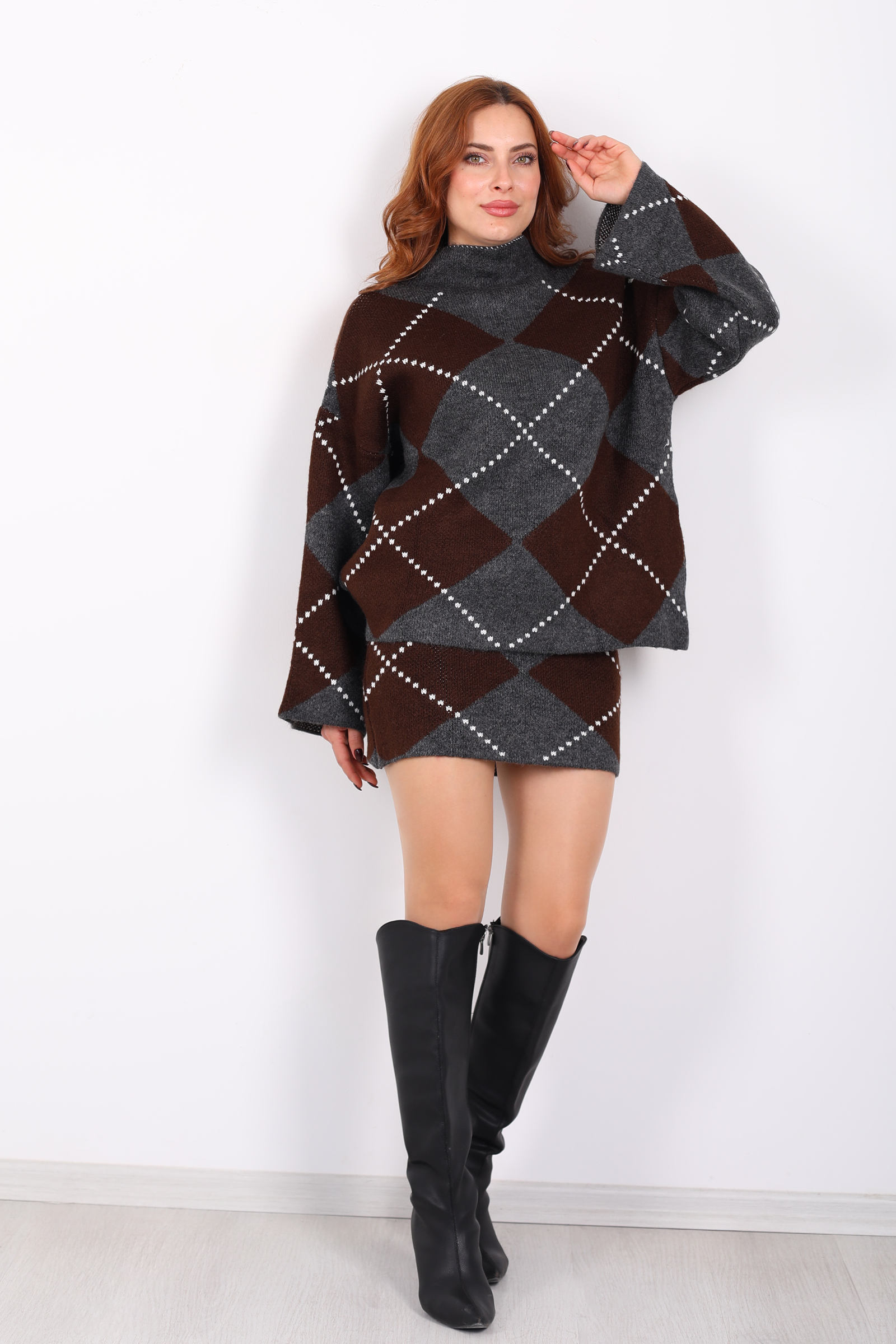 Baklava Desenli Etekli Kahverengi Kadın Triko Takım