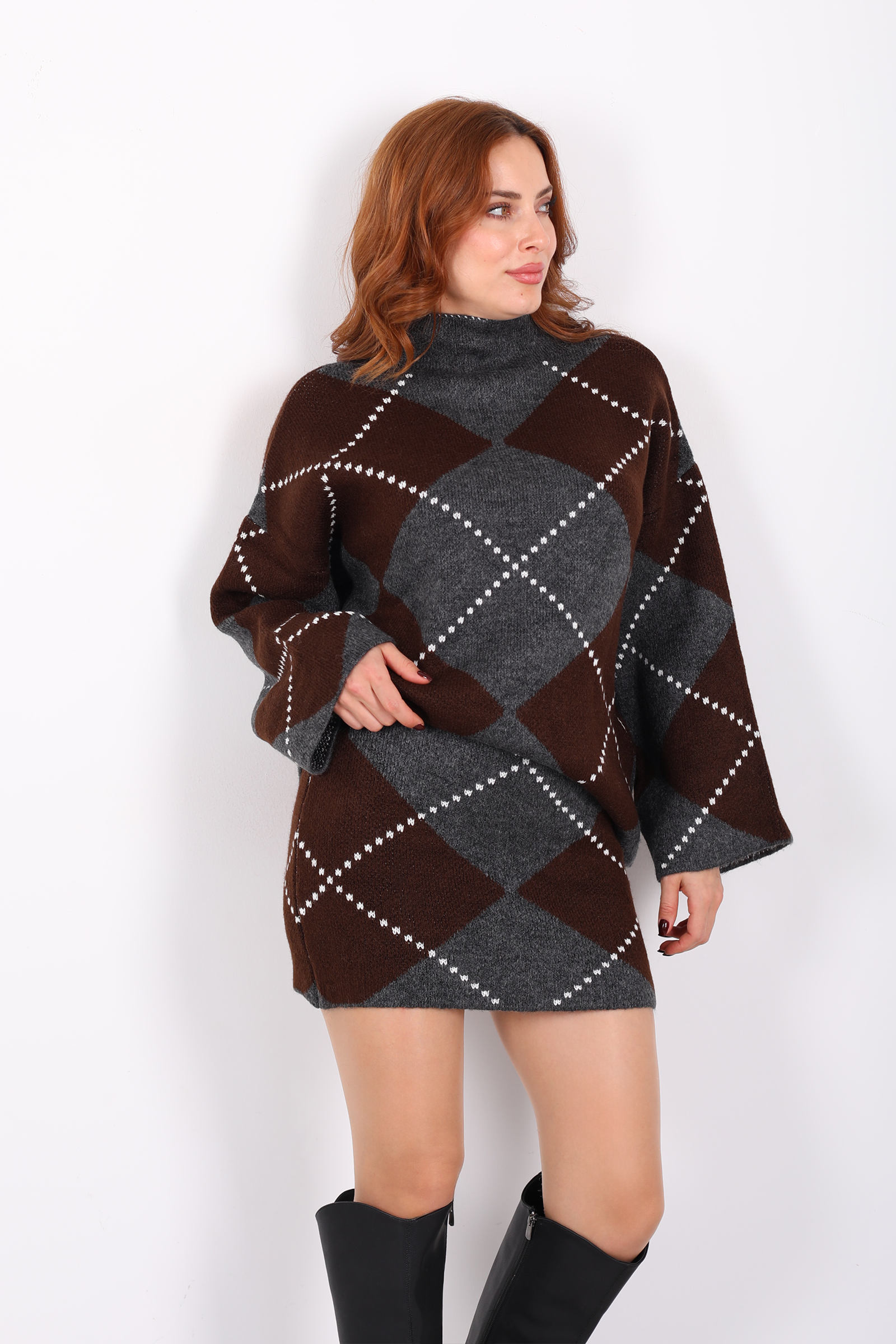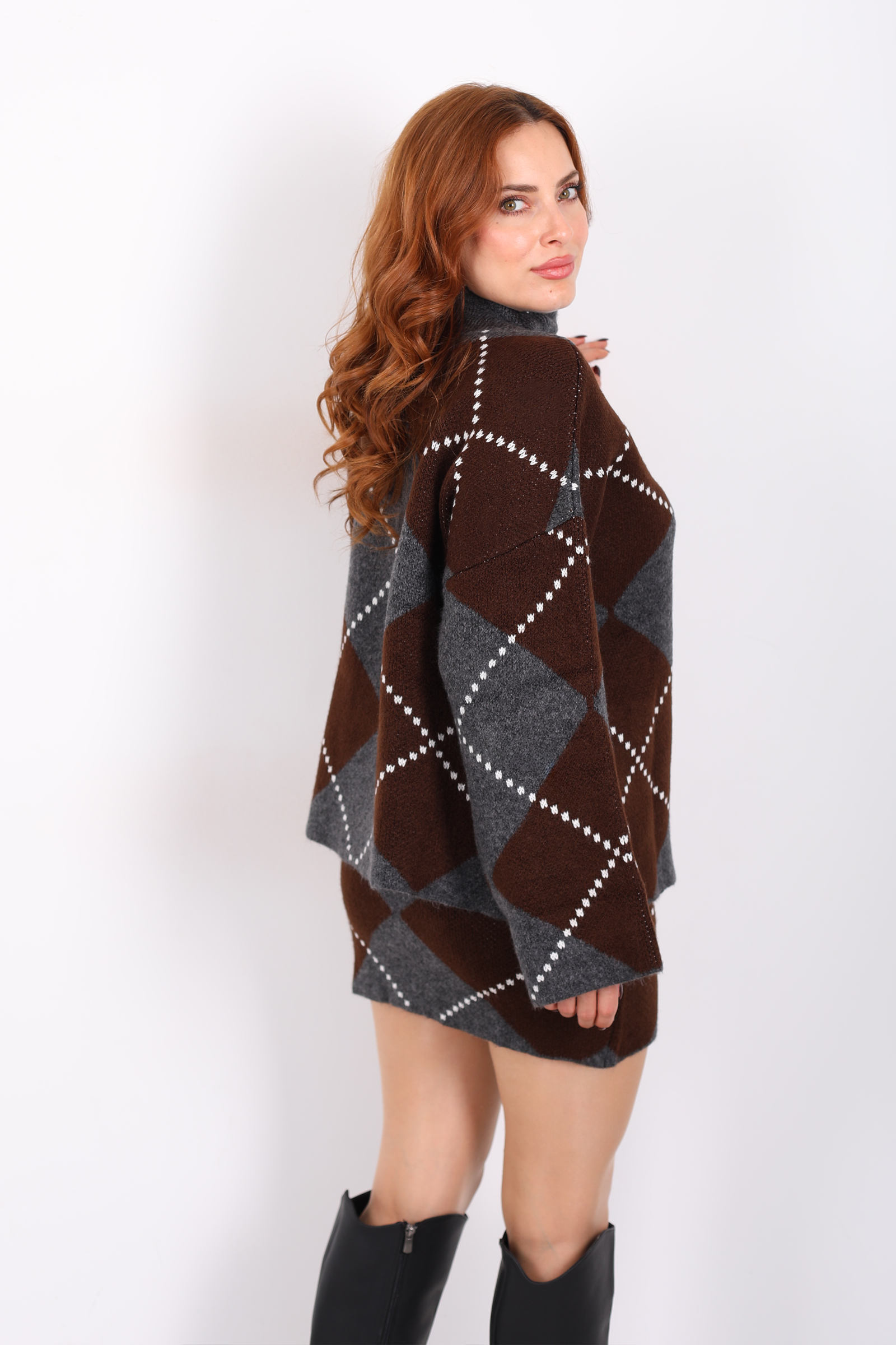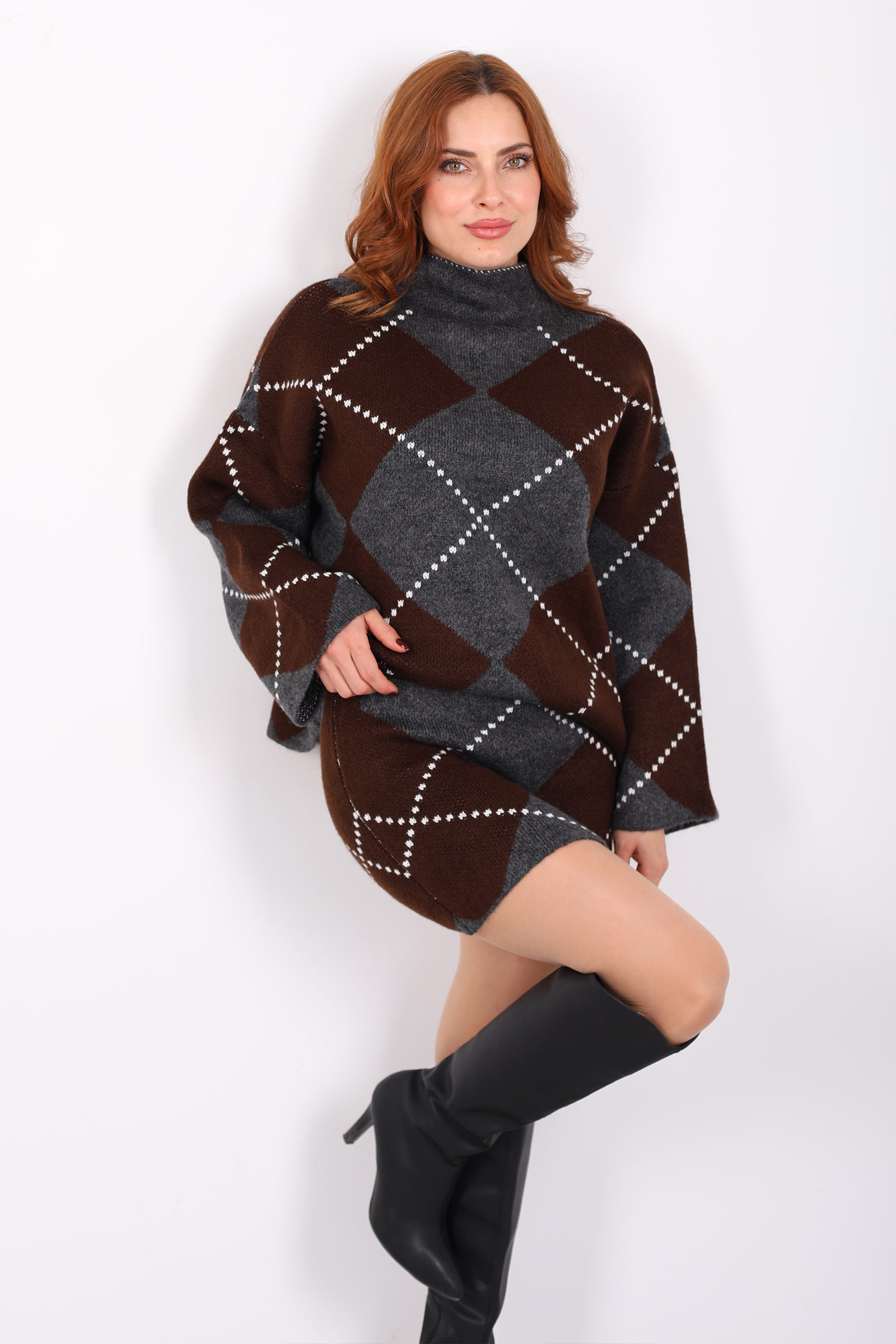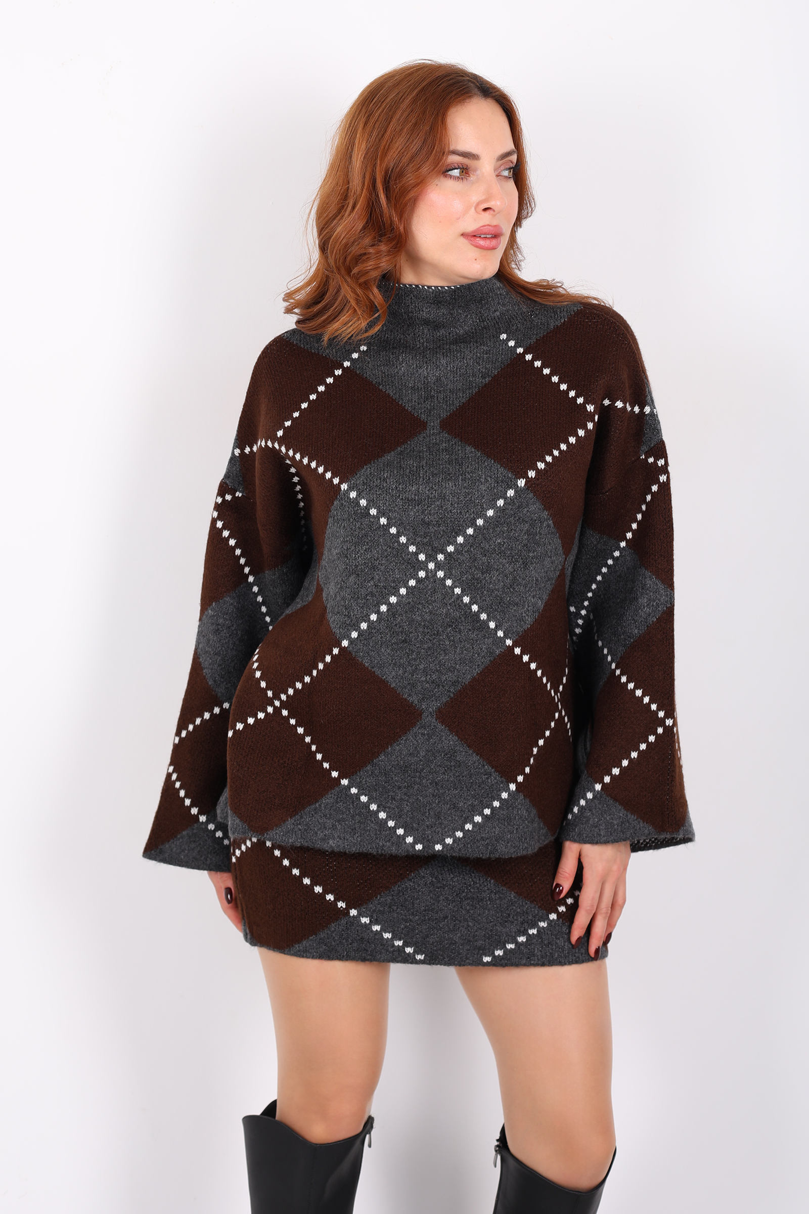 Baklava Desenli Etekli Kahverengi Kadın Triko Takım