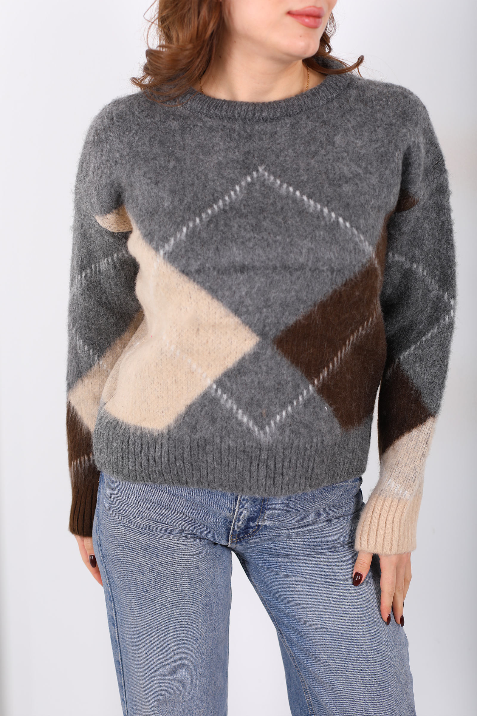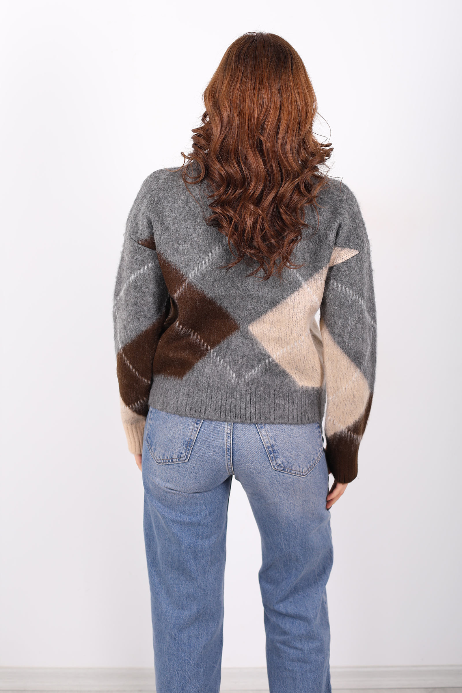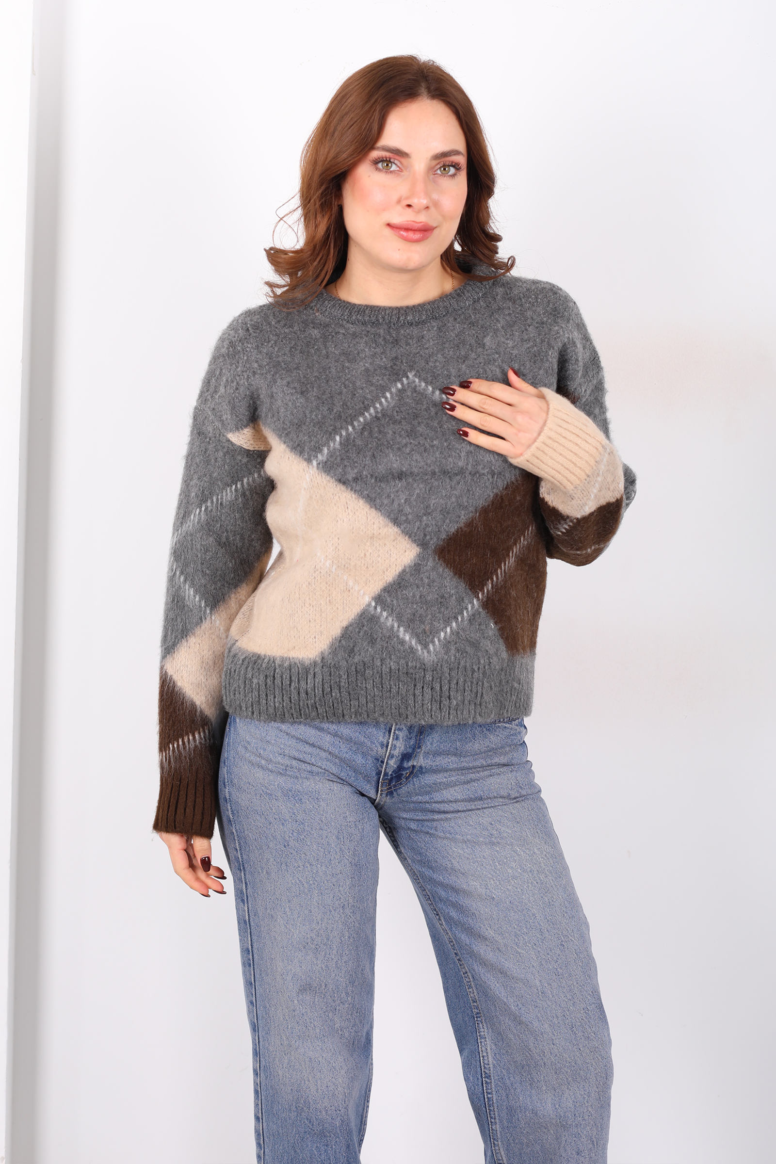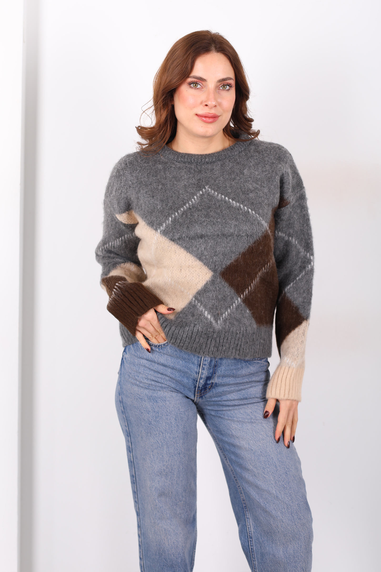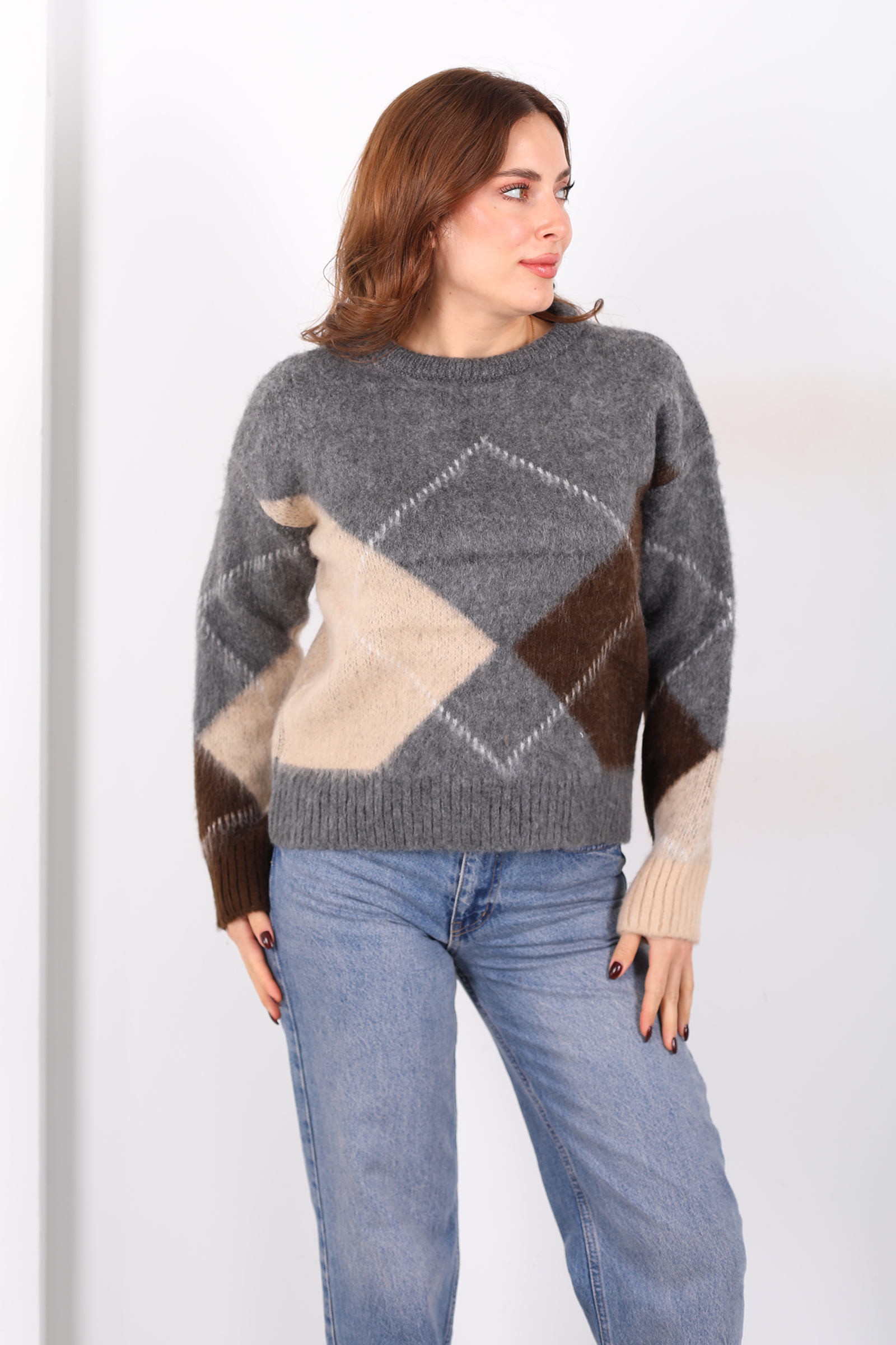 Baklava Desenli Uzun Kol Antrasit Kadın Triko Kazak