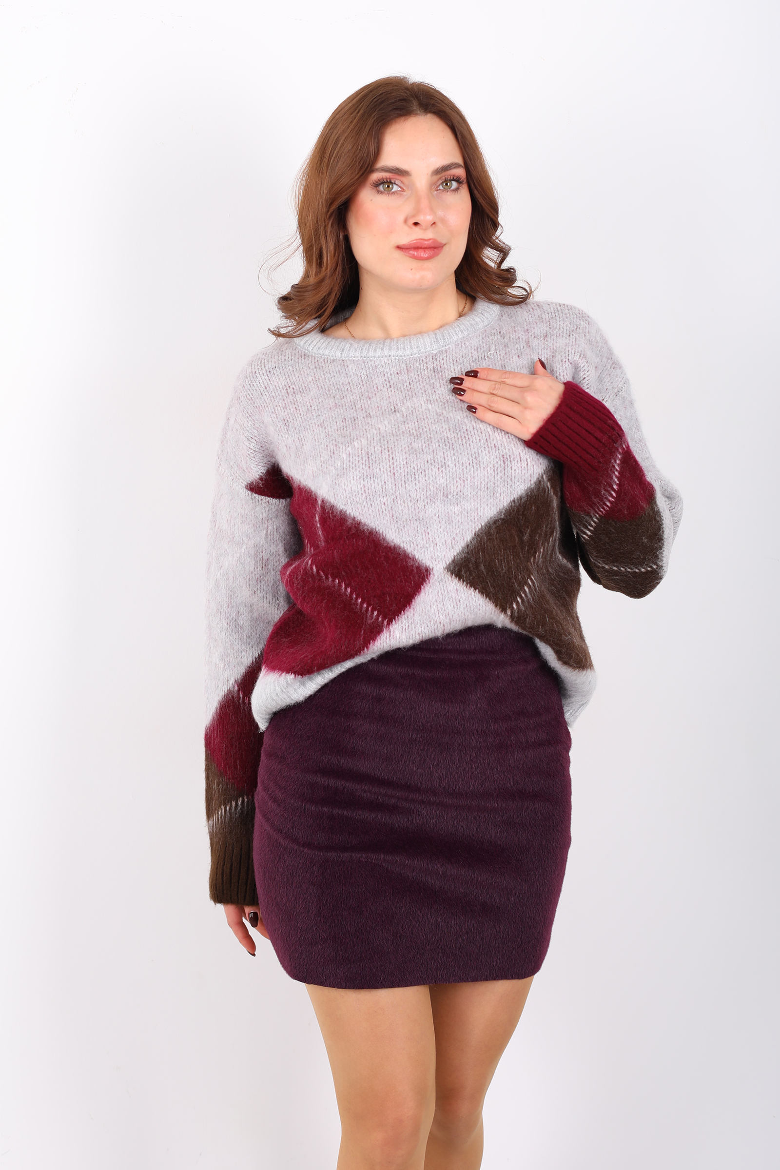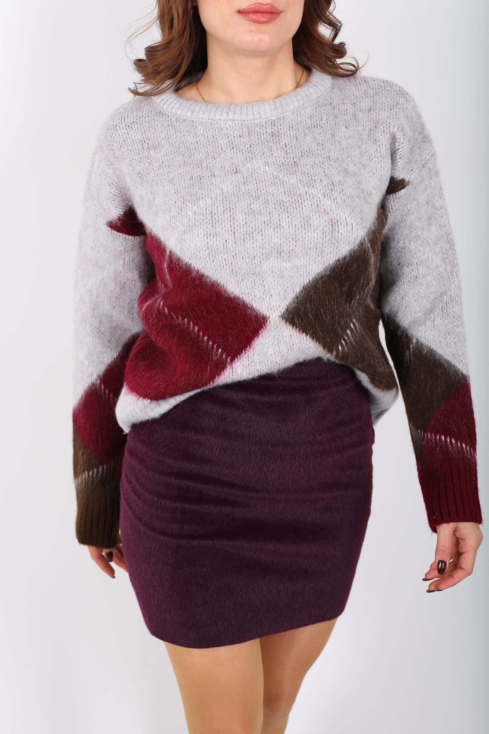 Baklava Desenli Uzun Kol Gri Kadın Triko Kazak