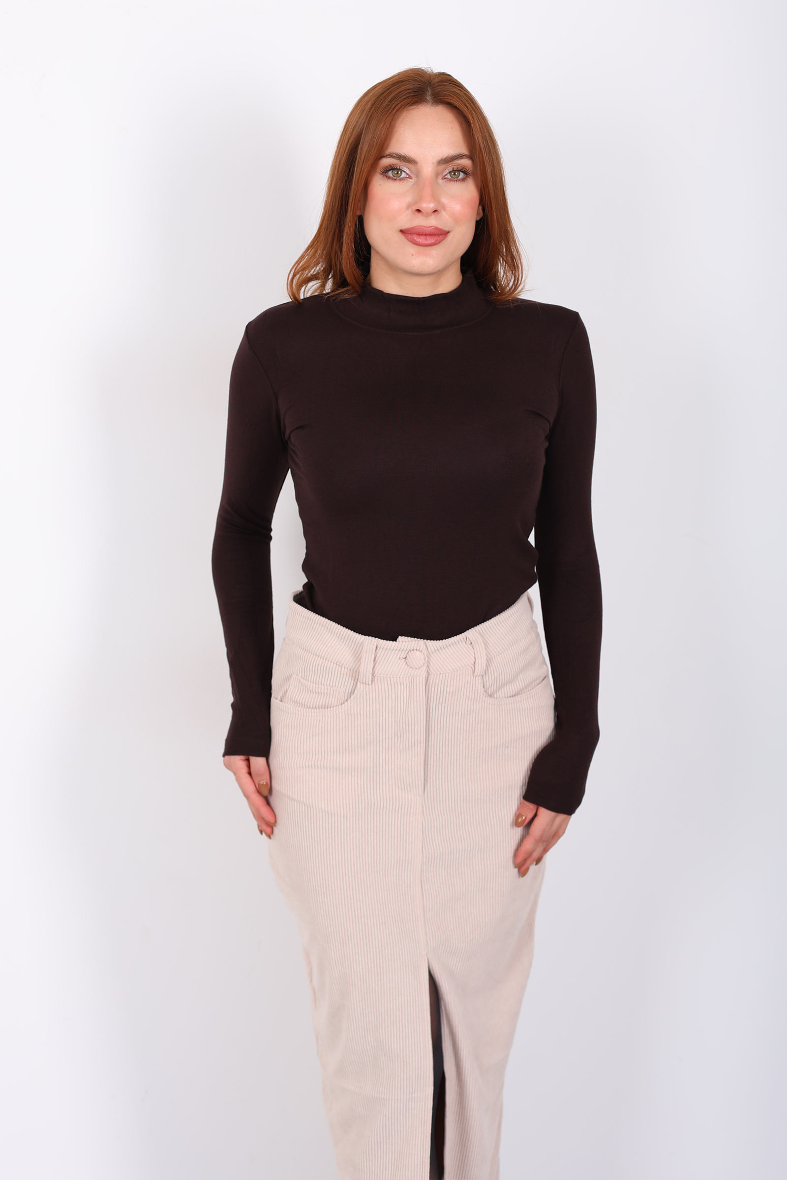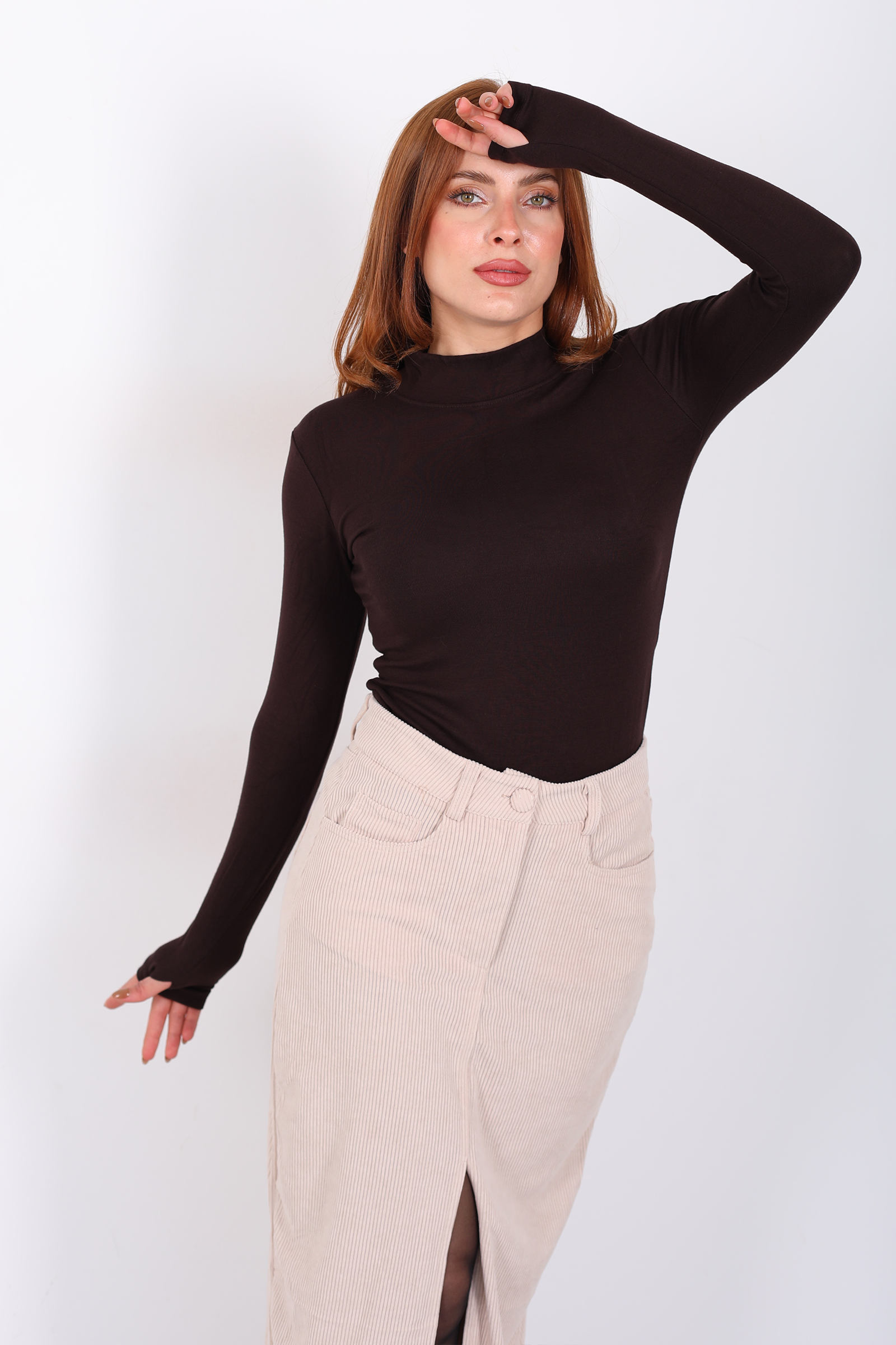 Uzun Kol Bisiklet Yaka Kahverengi Çıtçıtlı Kadın Body