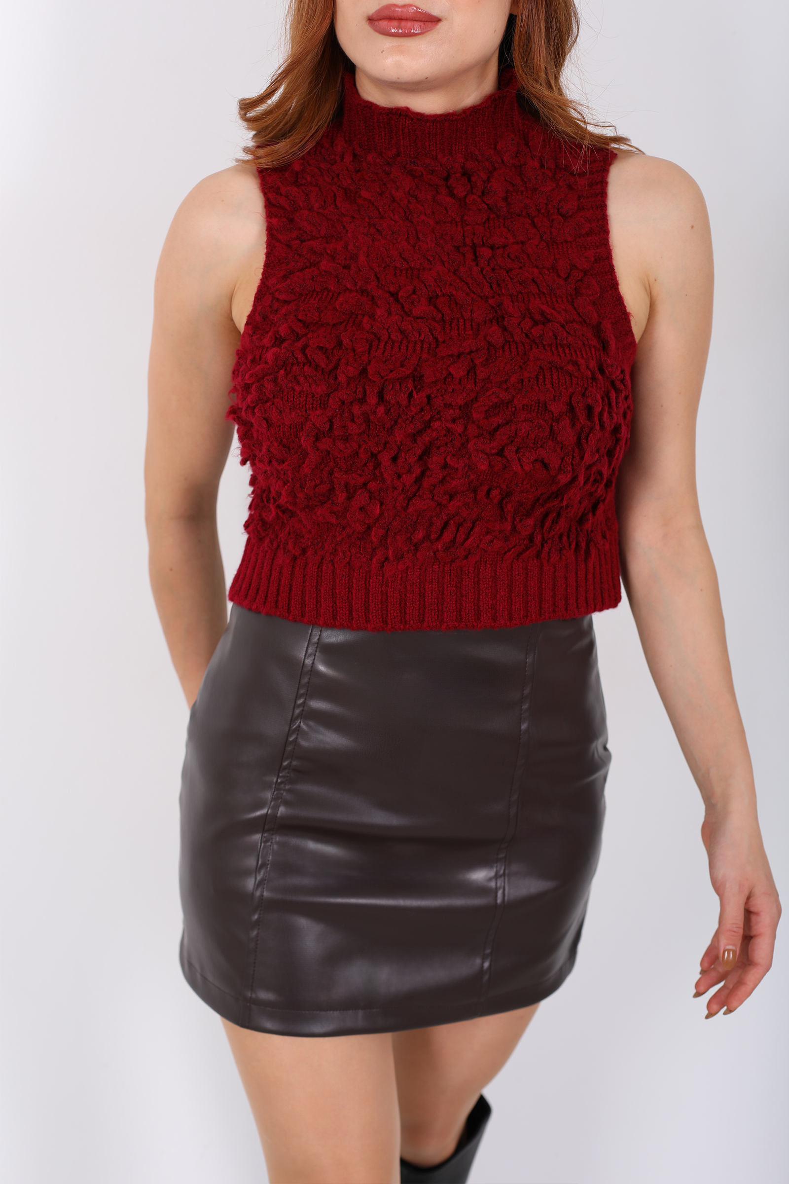 Balıkçı Yaka Püskül Detaylı Bordo Kadın Triko Kazak
