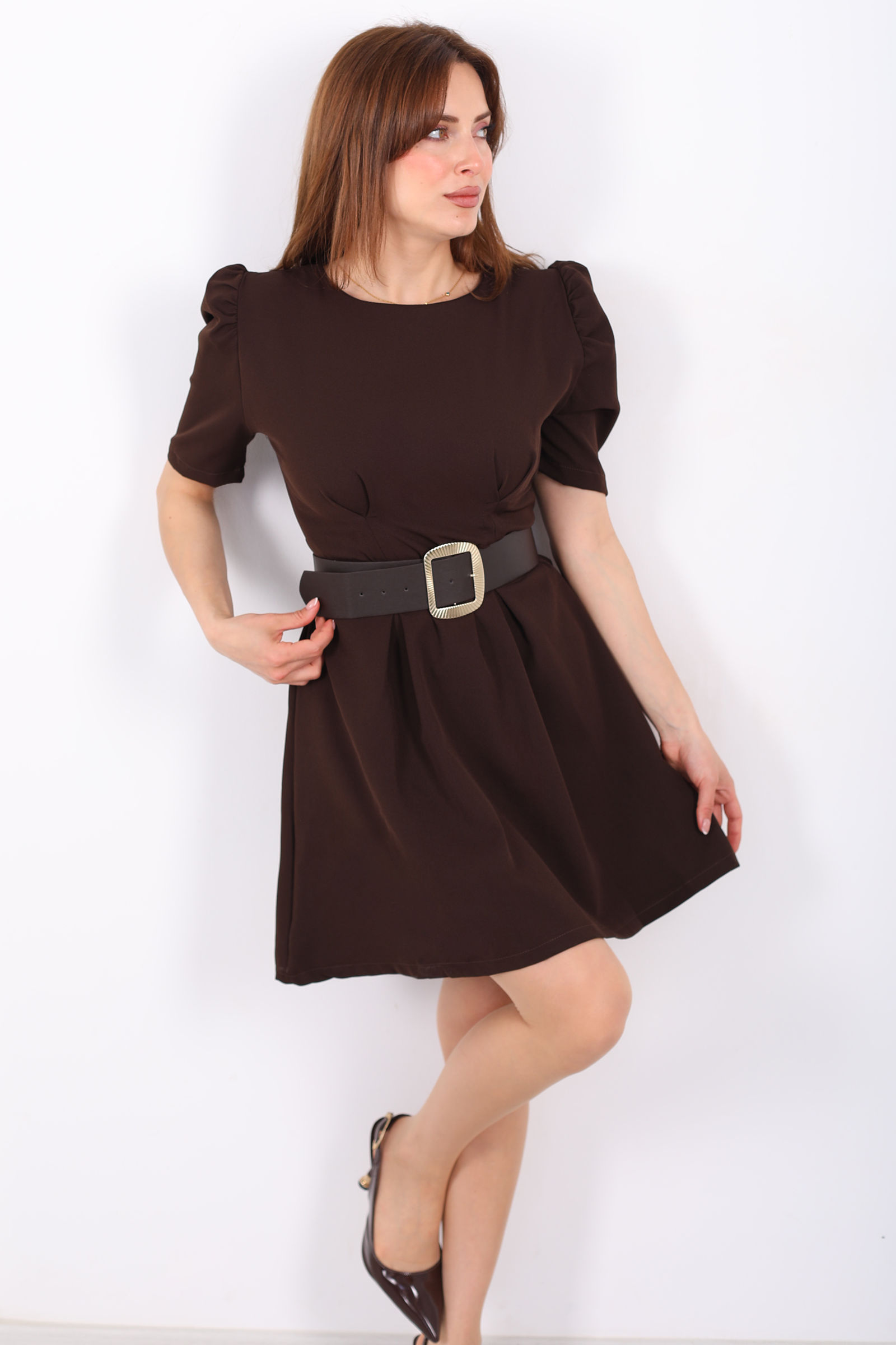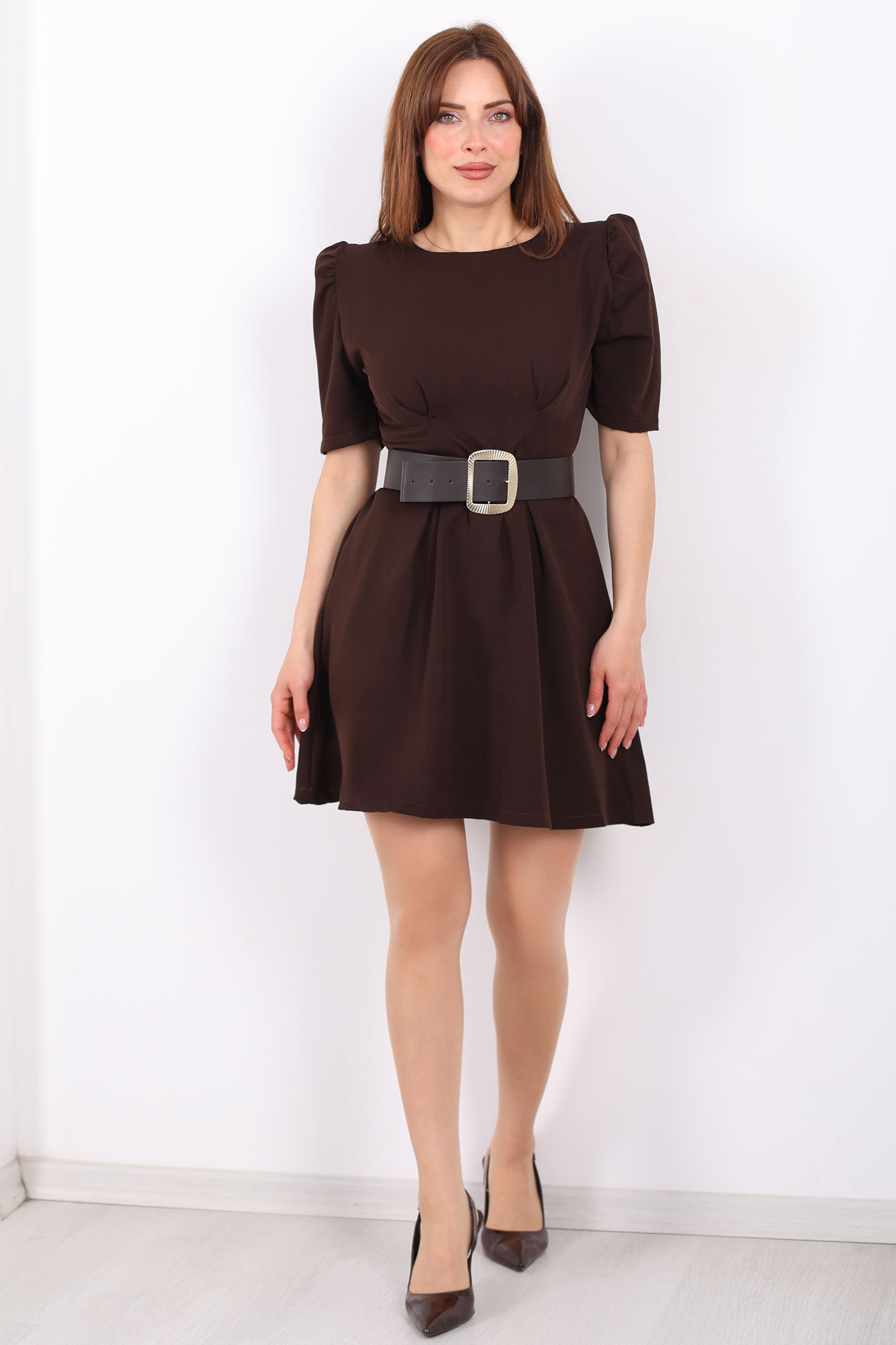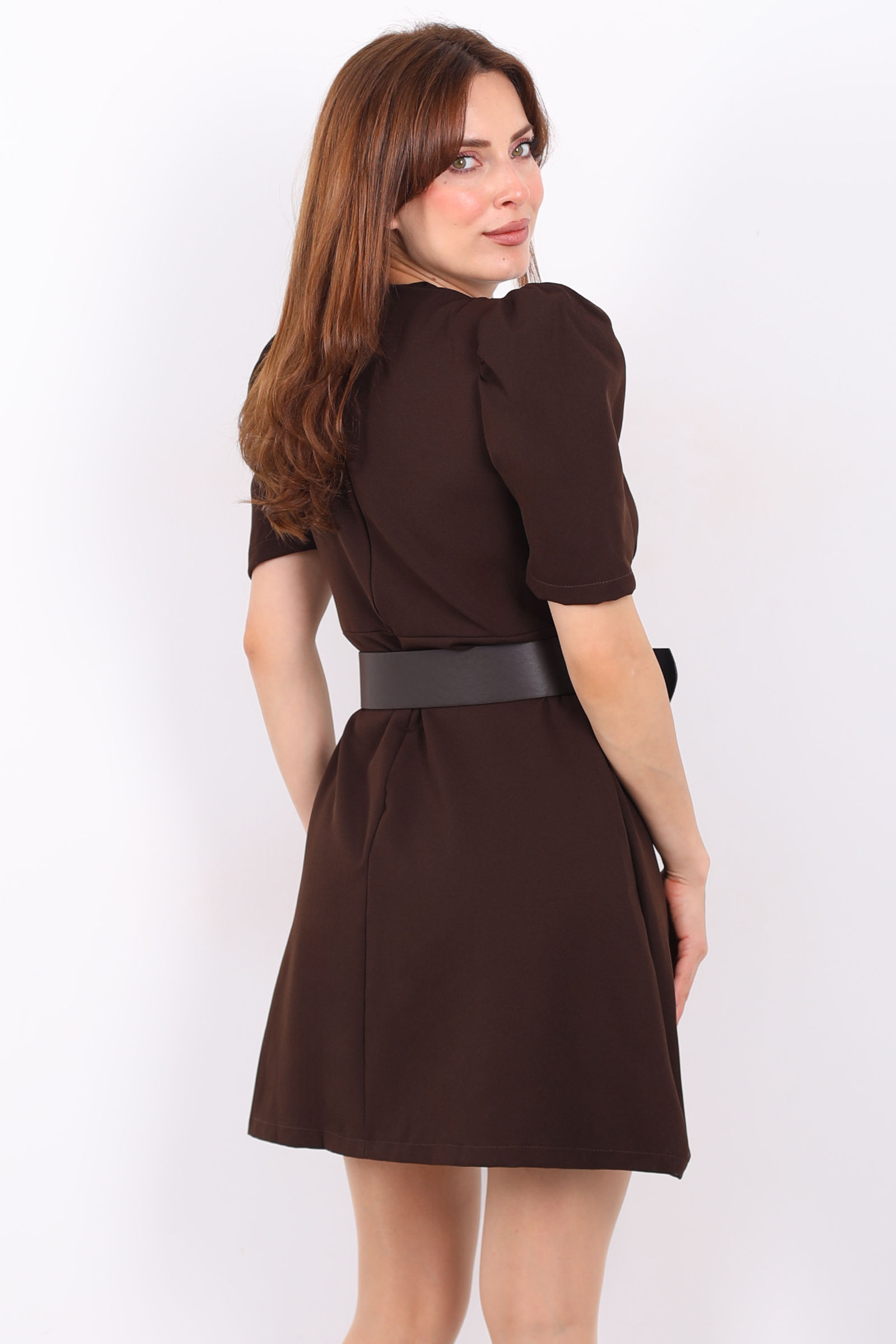Balon Kol Kemerli Kadın Kahverengi Mini Elbise