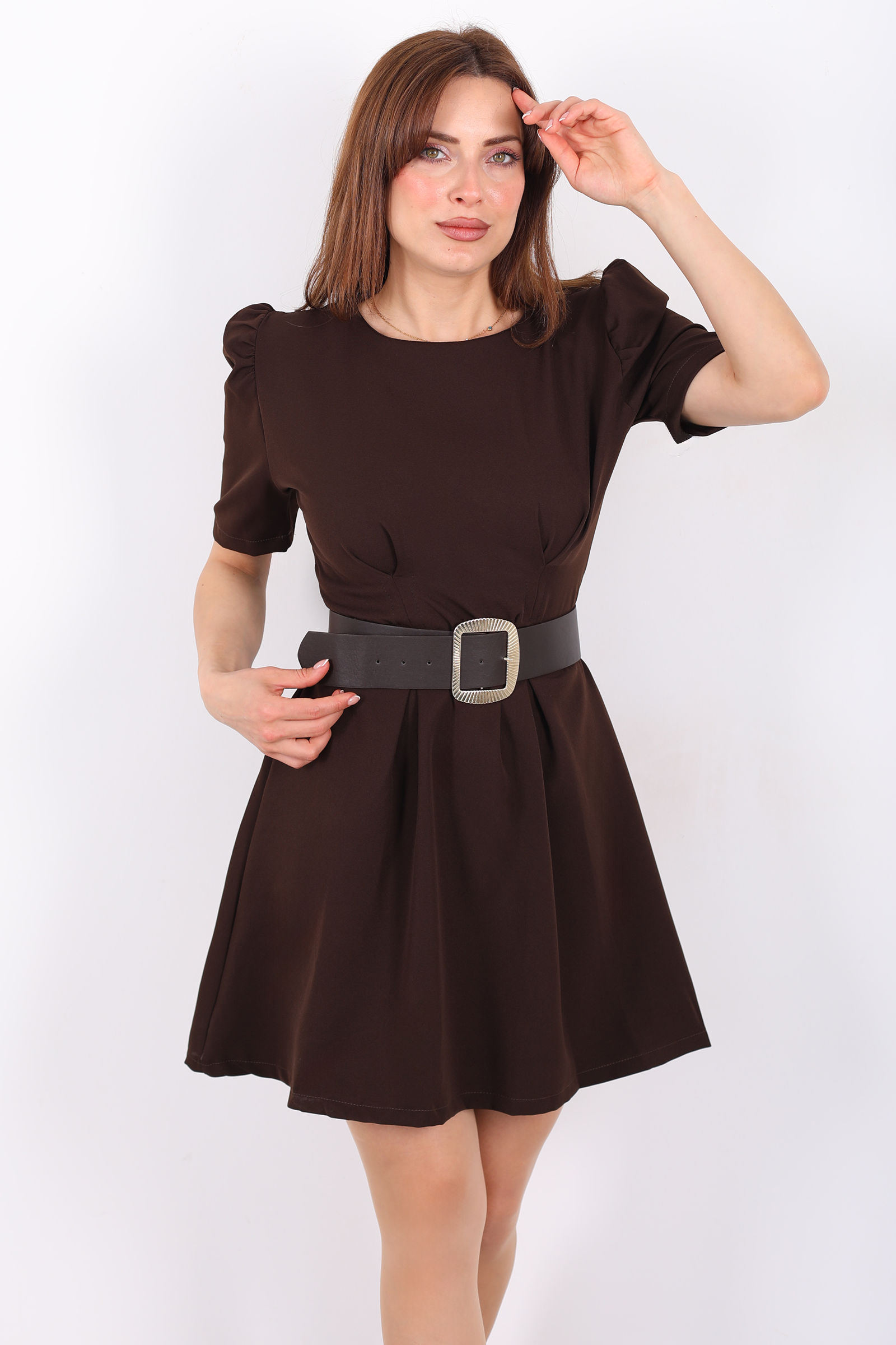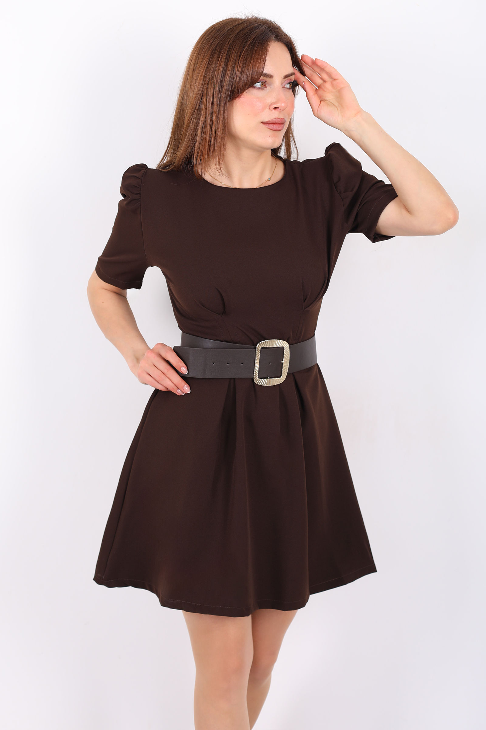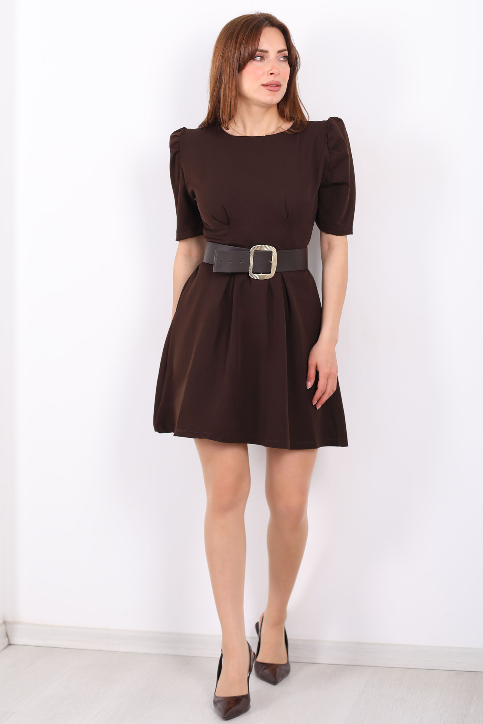 Balon Kol Kemerli Kadın Kahverengi Mini Elbise