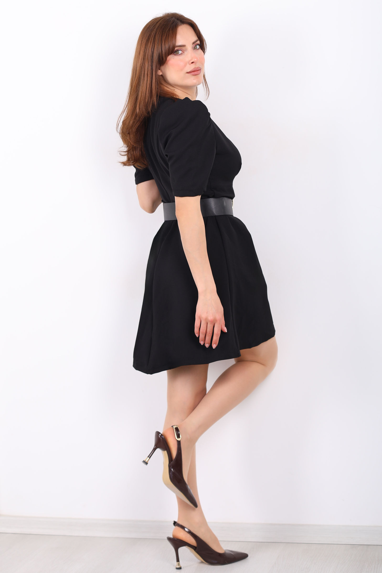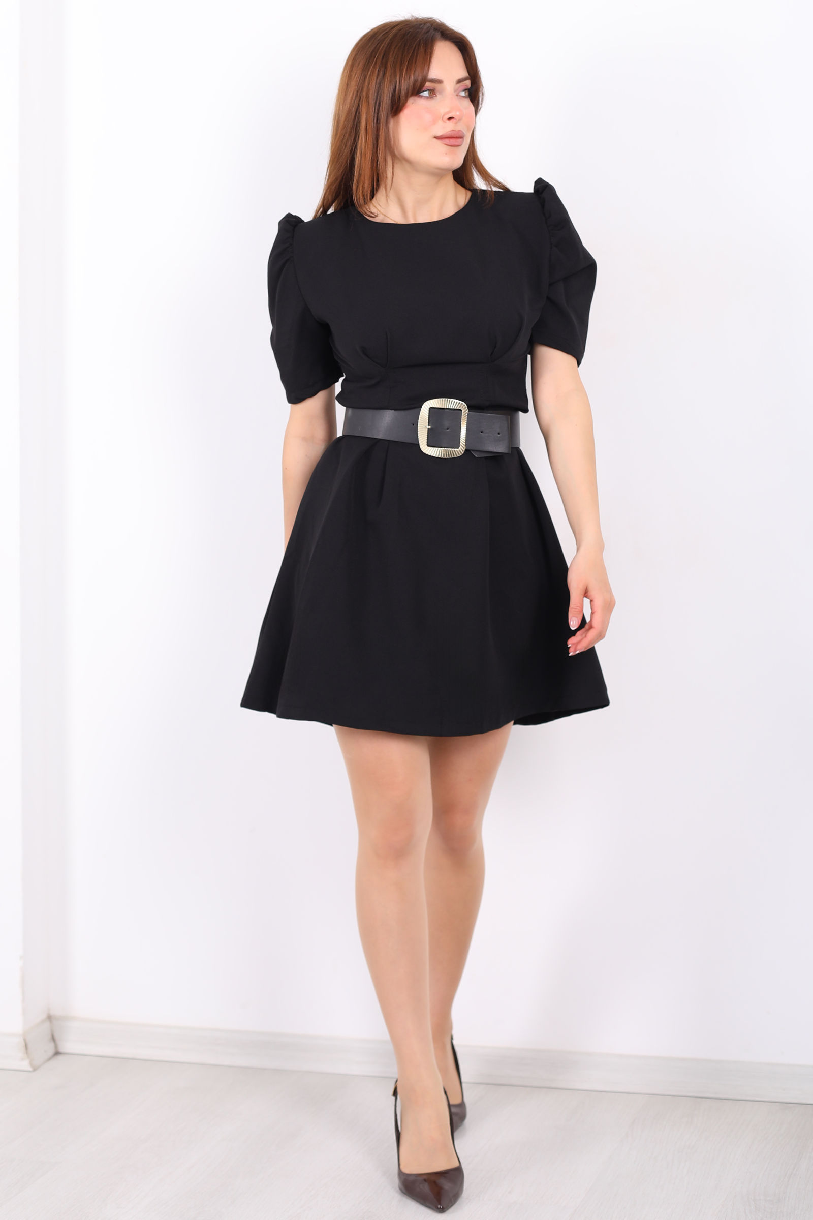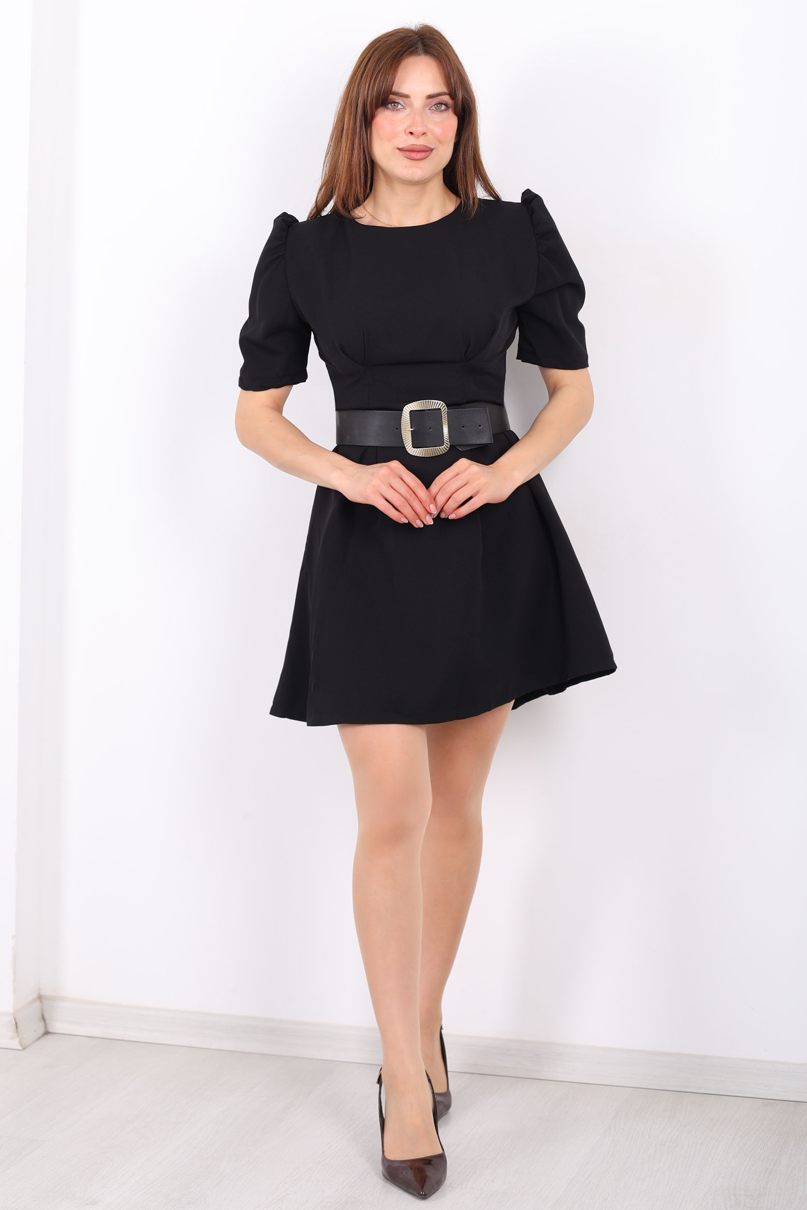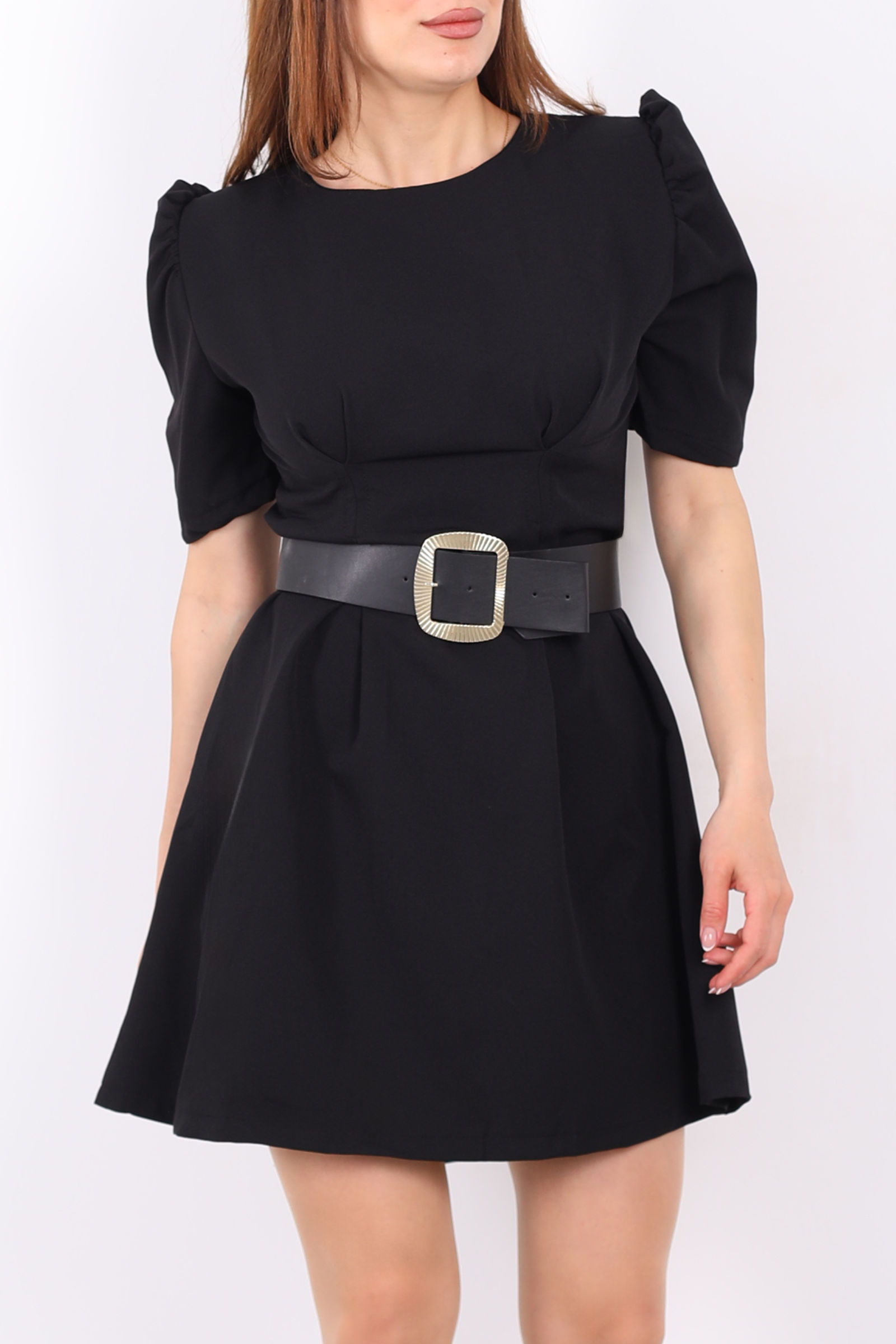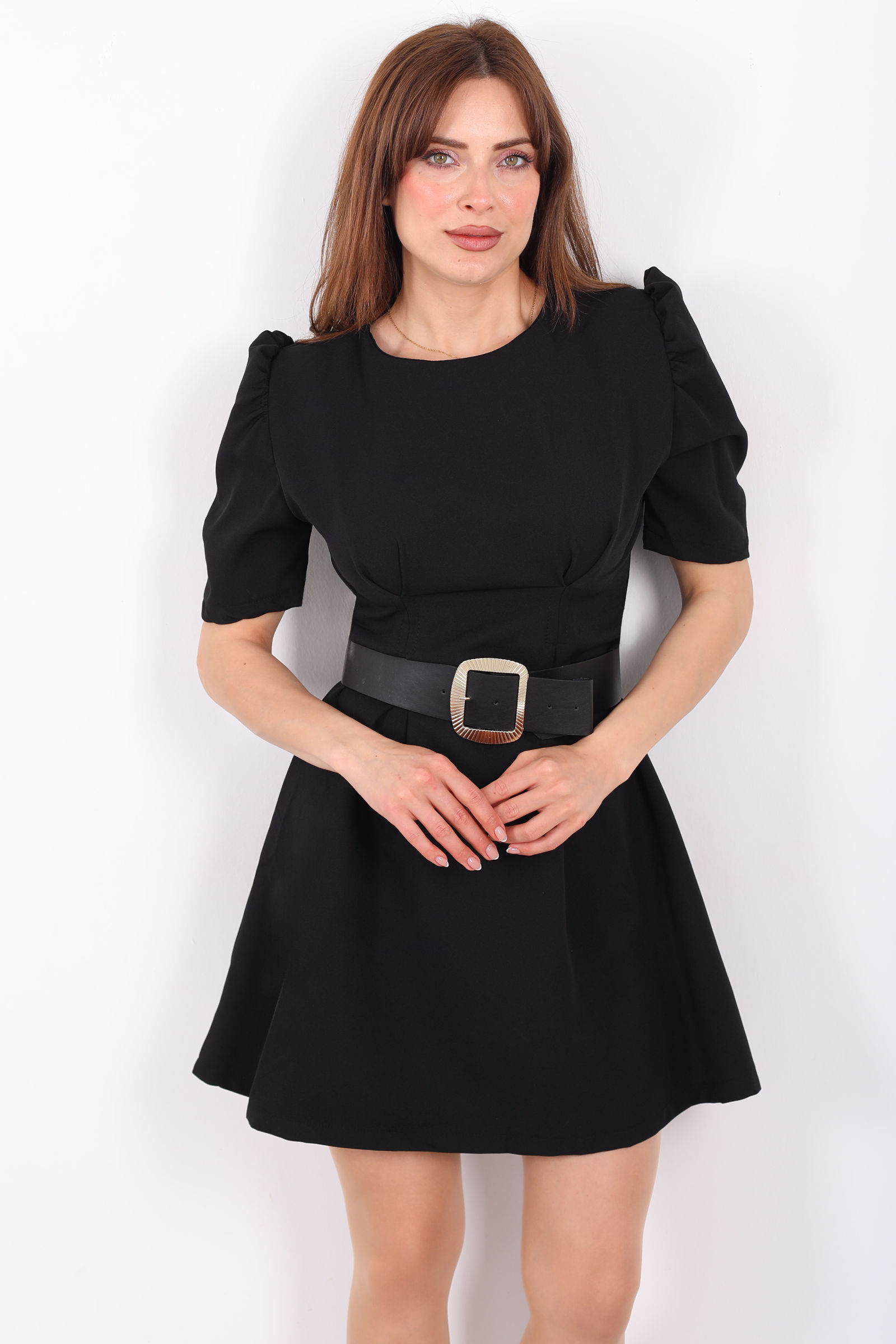 Balon Kol Kemerli Kadın Siyah Mini Elbise