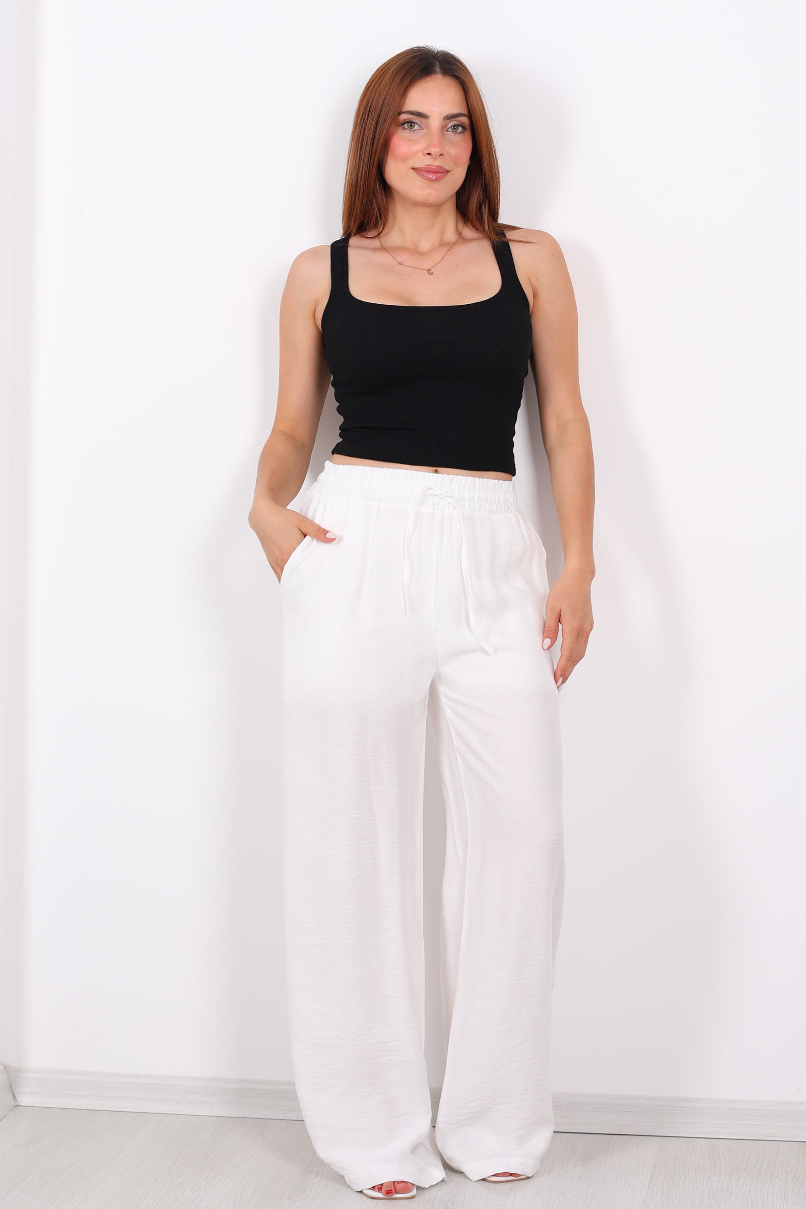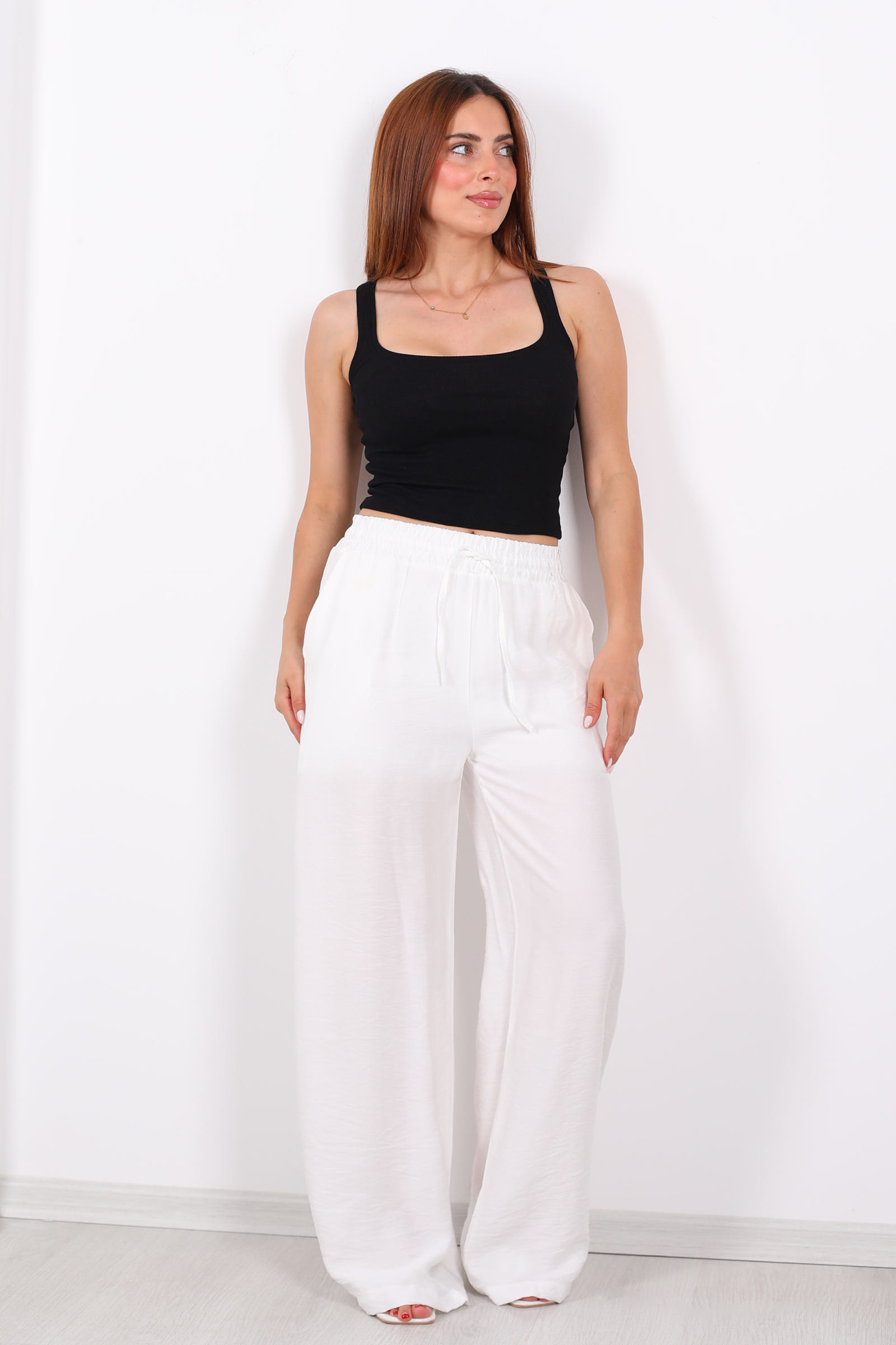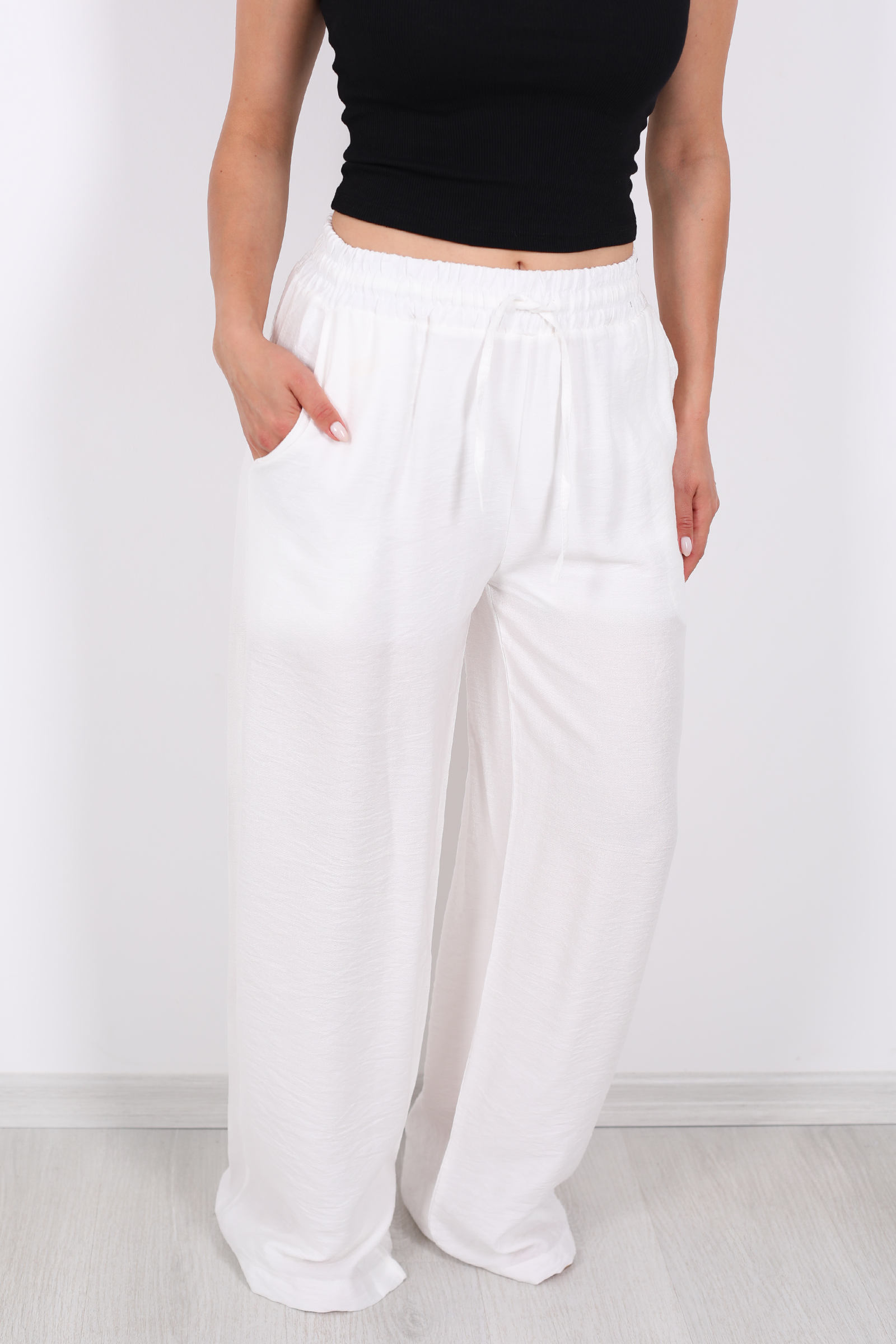 Berox'un beli bağcıklı beyaz salaş pantolonu, rahatlığı ve şıklığı bir arada sunmak isteyenler için ideal bir tercih. Ferah beyaz rengi ve salaş kesimiyle özellikle yaz aylarında serin ve konforlu bir kullanım sağlar. Beli bağcıklı tasarımı sayesinde bele hoş bir vurgu yaparken, geniş paça kesimi gün boyu hareket özgürlüğü sunar. %100 pamuk kumaşı cildinizin nefes almasına olanak tanır, böylece hem rahat hem de şık hissedersiniz. Bu pantolonu sade bir bluzla ya da rahat bir tişörtle kombinleyerek günlük stilinizi kolayca tamamlayabilirsiniz.