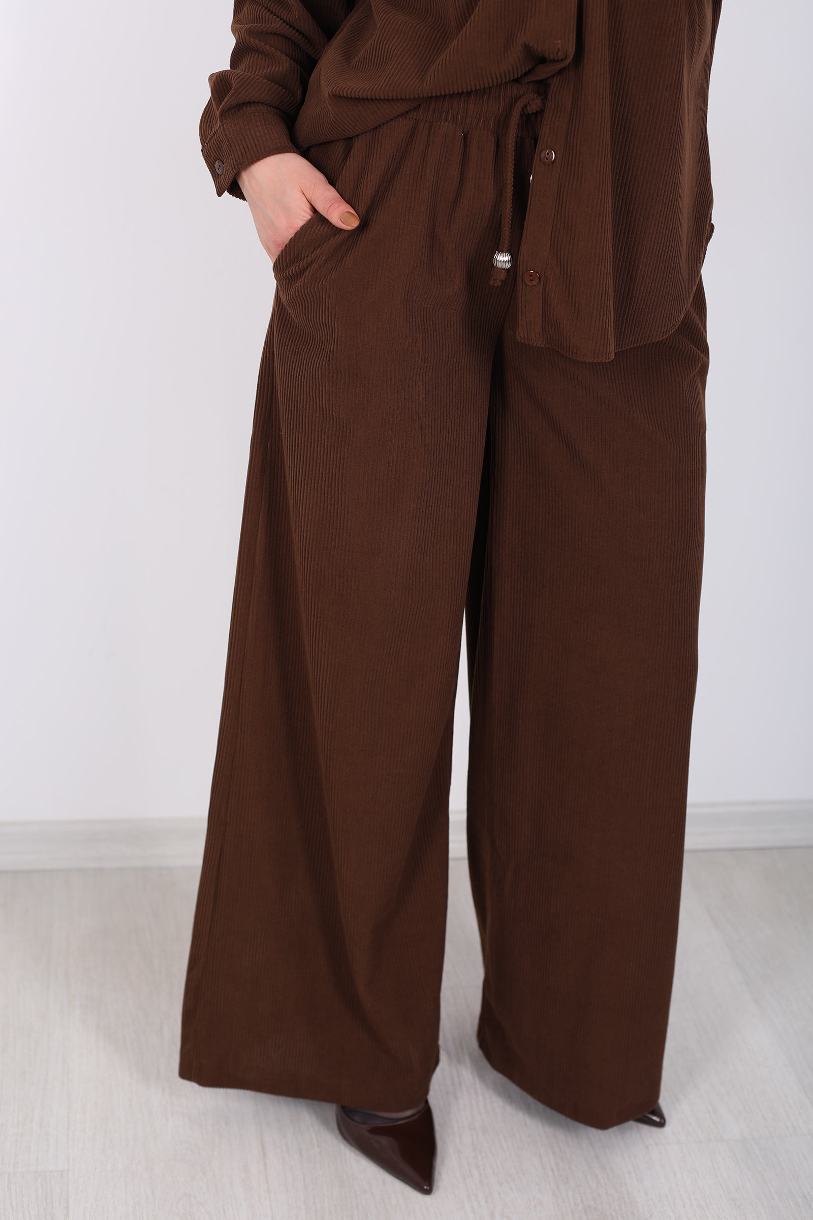 Beli Bağlamalı Bol Paça Acı Kahve Kadın Kadife Pantolon