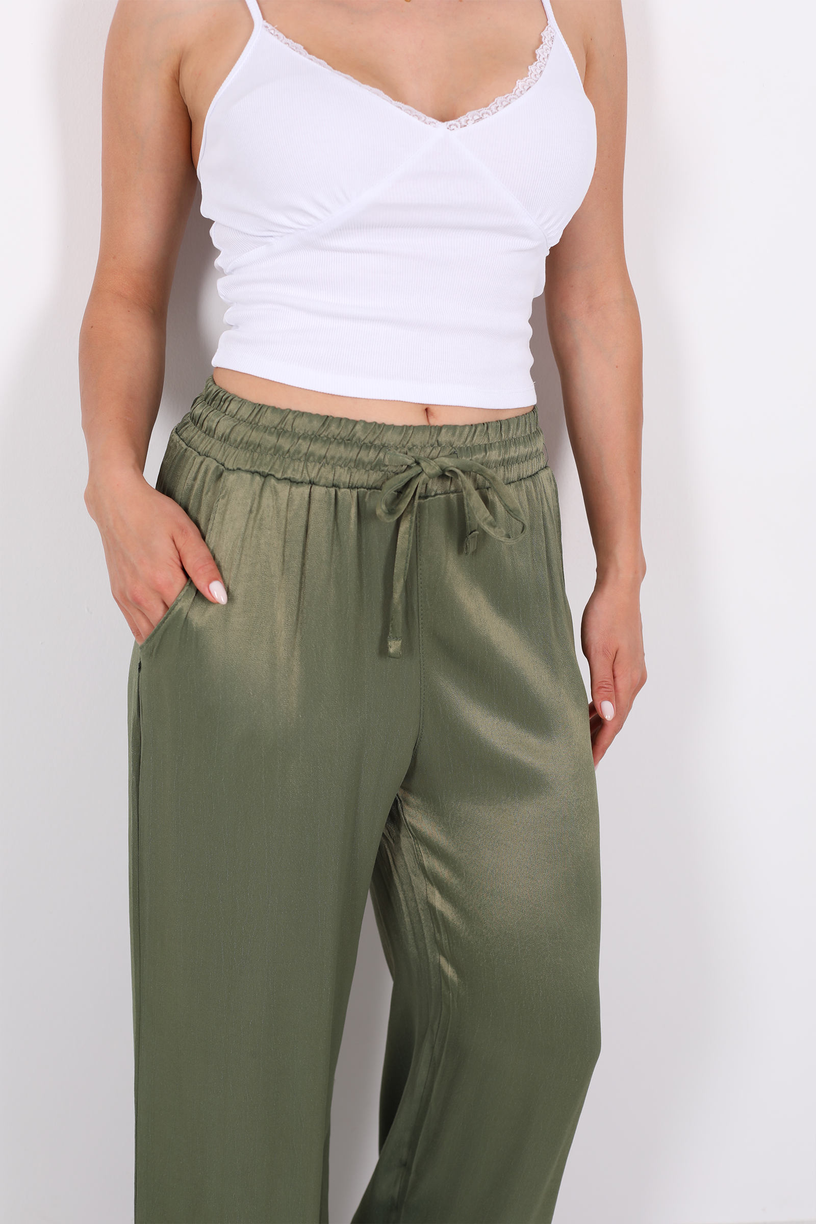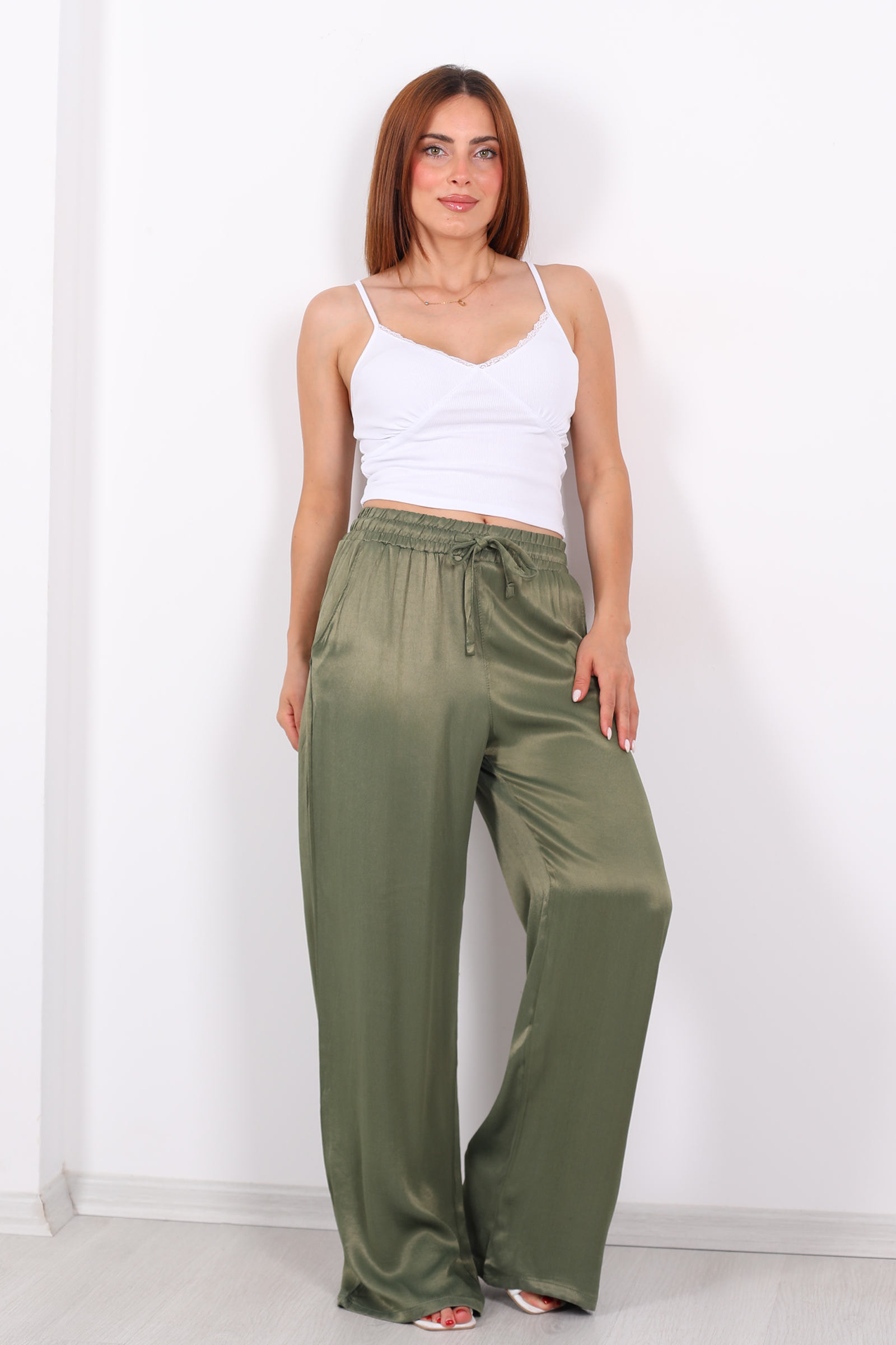 Doğanın sakin tonlarından ilham alan haki rengiyle bu palazzo pantolon, ışıltılı bürümcük saten kumaşıyla her adımda hafif bir parıltı yayar. İnce kemer bağı, beli zarifçe çerçevelerken silüetinize eşsiz bir zarafet katıyor. Geniş paçaları, sizi hem rahatlatan hem de akıcı bir hareket hissi sunan bir görünüme kavuşturur. Bu pantolon, sadece bir kıyafet değil gündüzden geceye stilinizin en ışıltılı temsilcisi olmayı taçlandıran bir detay.Özelllikle unutulmaz günlerde ya da gündelik şıklığınıza sofistike bir dokunuş eklemek istediğiniz zamanlar için birebir.