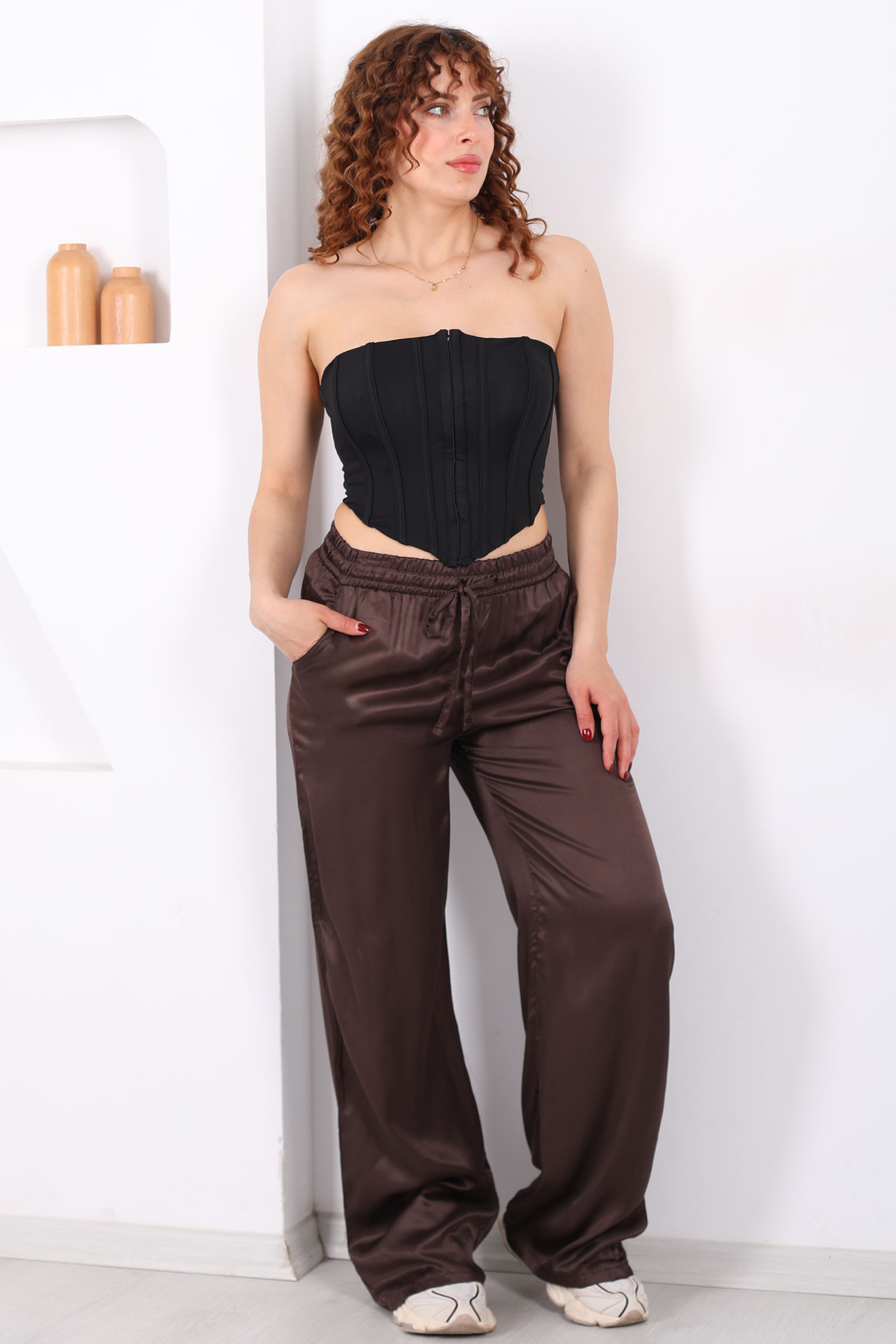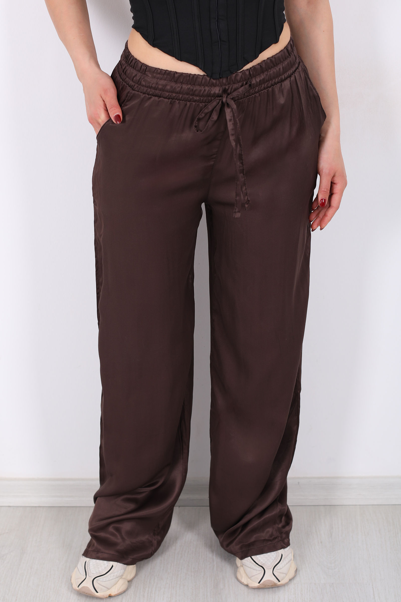 Beli Bağlamalı Bol Paça Işıltılı Saten Kahverengi Kadın Pantolon