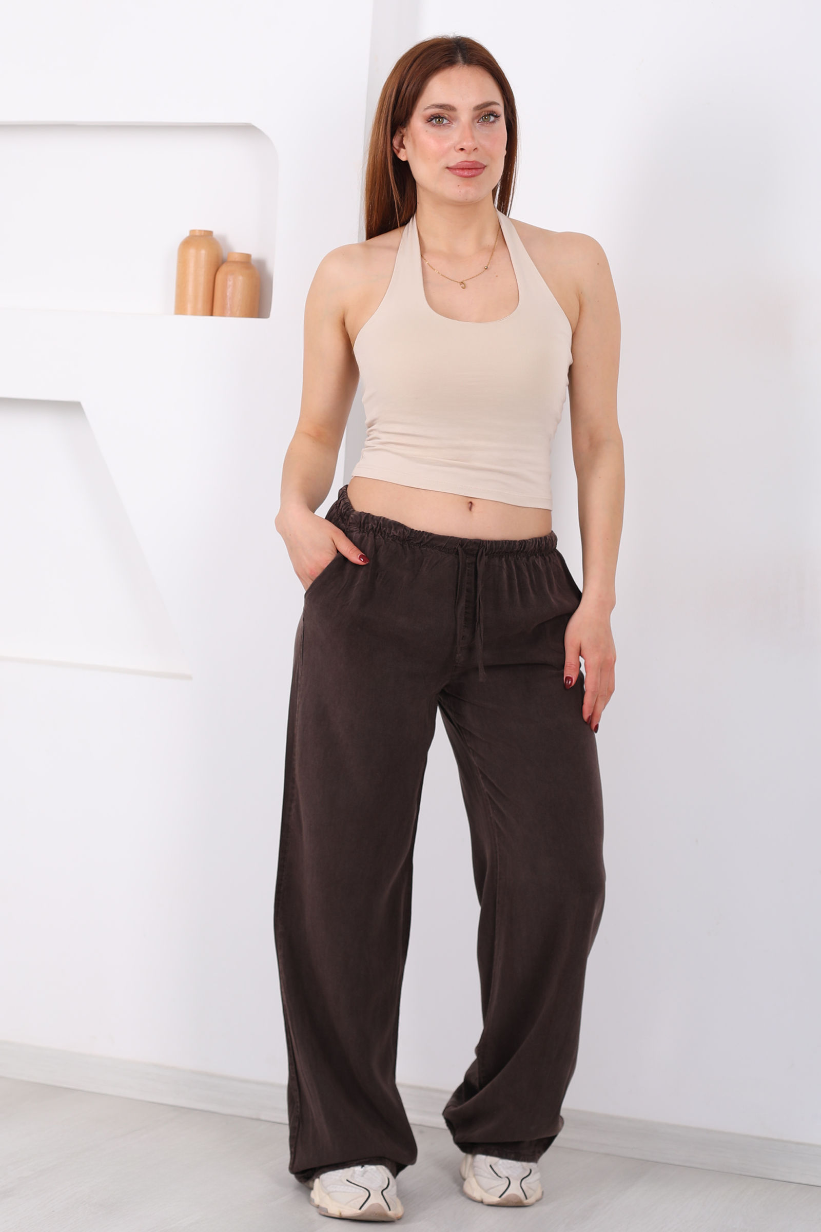 Doğal tonların sıcak etkisini modern kesimle buluşturan bu bol paça pantolon, sade ama stil sahibi kombinler oluşturmak isteyenler için ideal bir seçenektir. Hafif ve yumuşak dokulu tensel kumaş gün içinde rahat hareket etmeyi desteklerken akıcı yapısı sayesinde dengeli bir siluet oluşturur.
