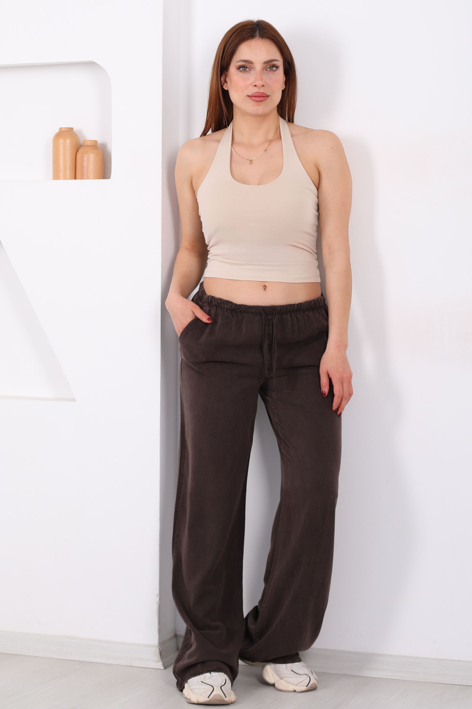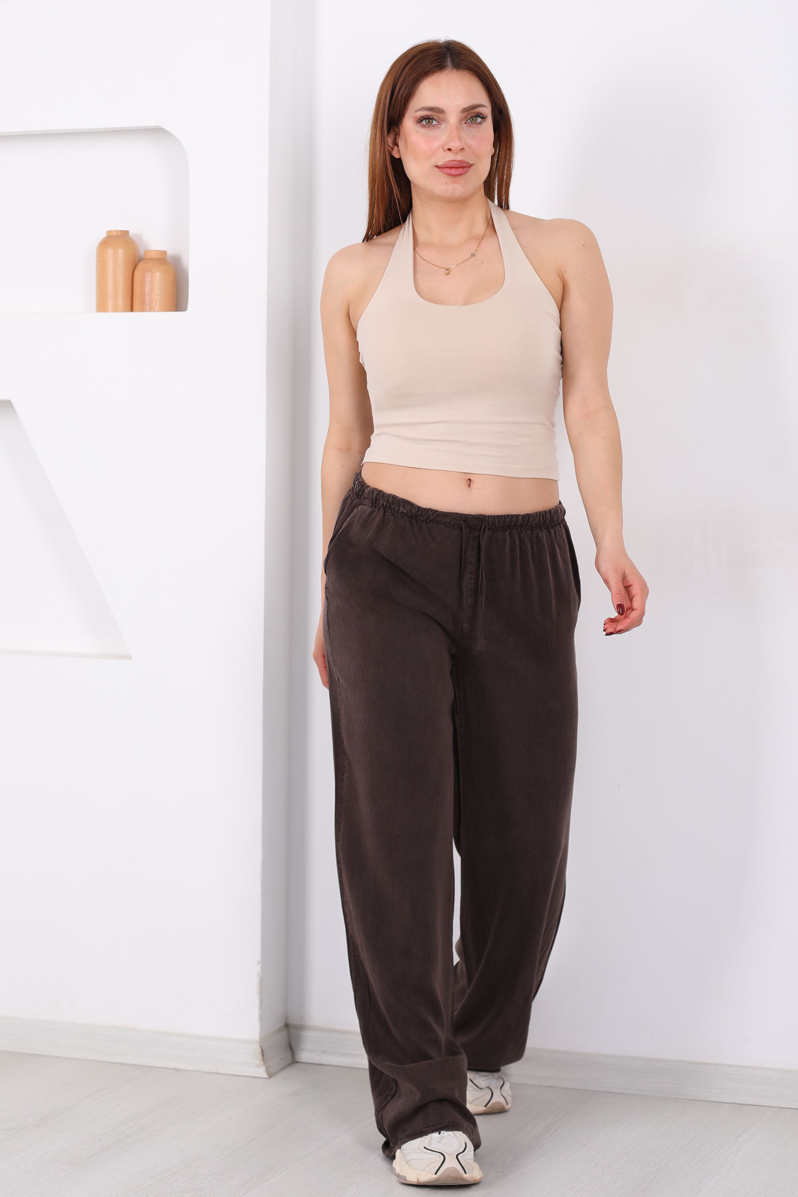 Acı kahve rengin toprak tonlarından ilham alan görünümü, özellikle açık renk üstlerle güçlü bir uyum yakalayarak kombinlere sofistike bir hava katar. Bel kısmındaki bağlama detayı hem kullanım kolaylığı sağlar hem de modele casual bir karakter kazandırır.