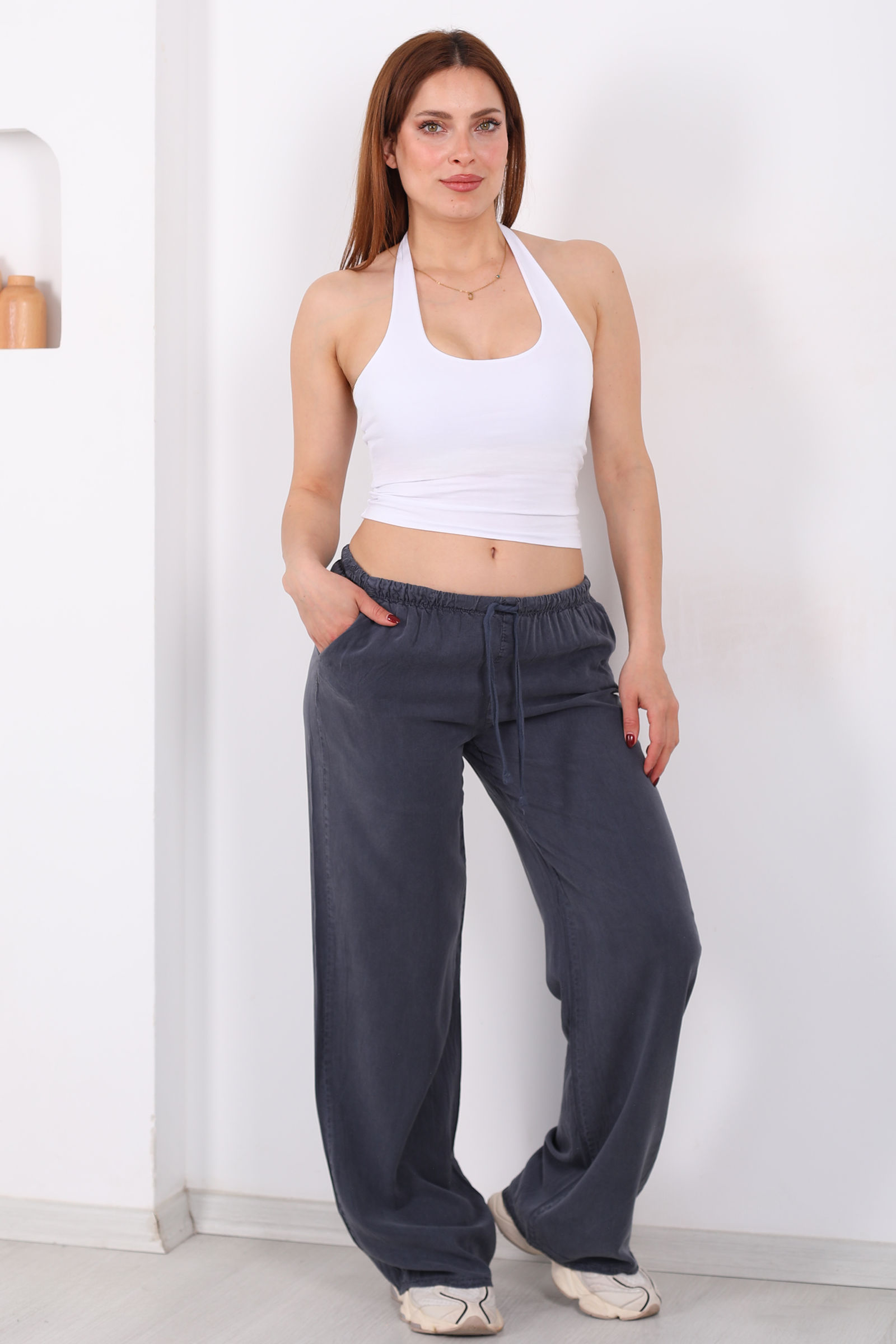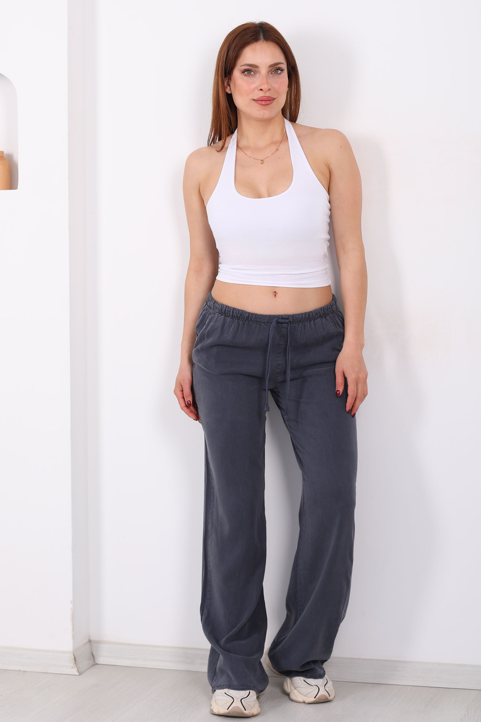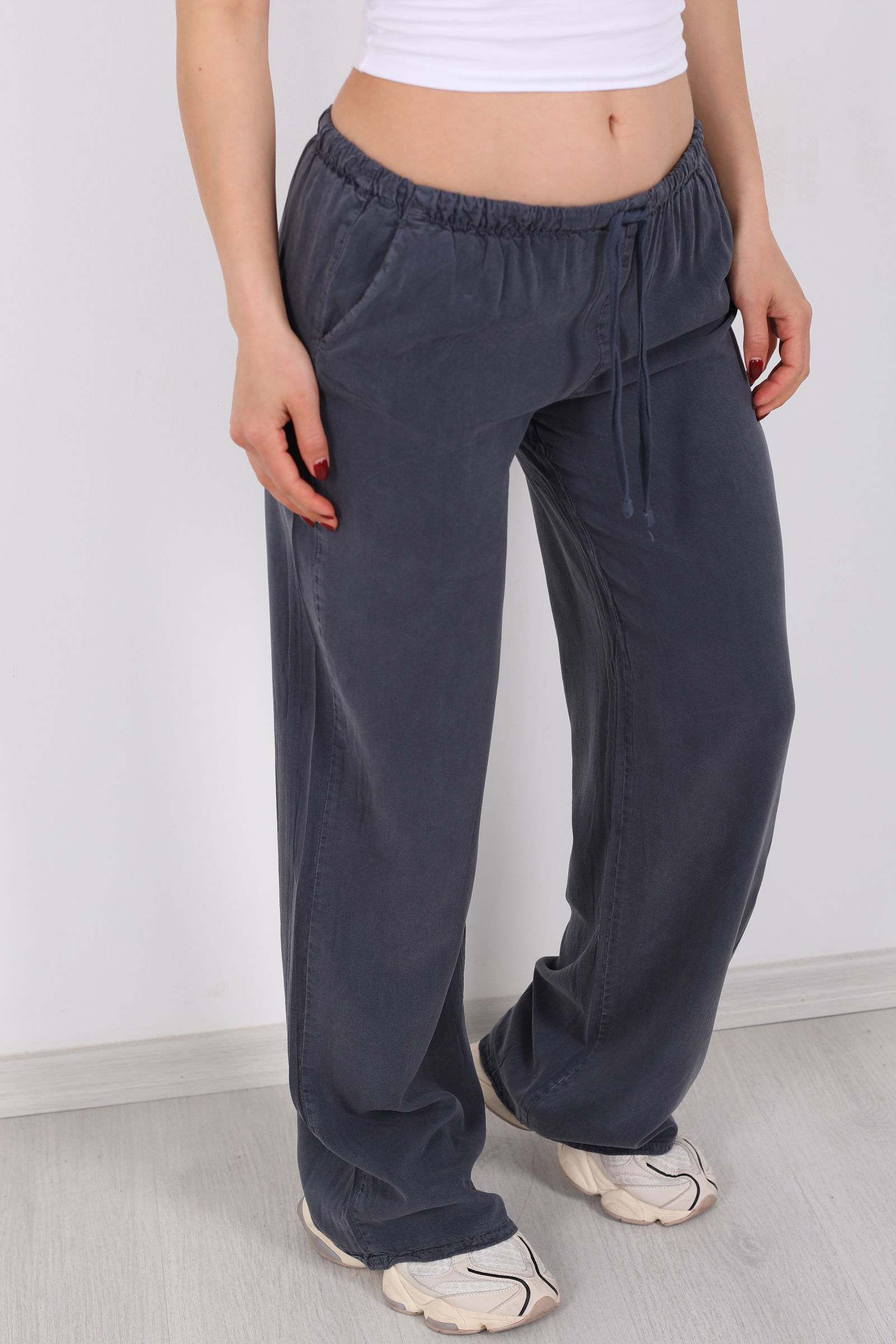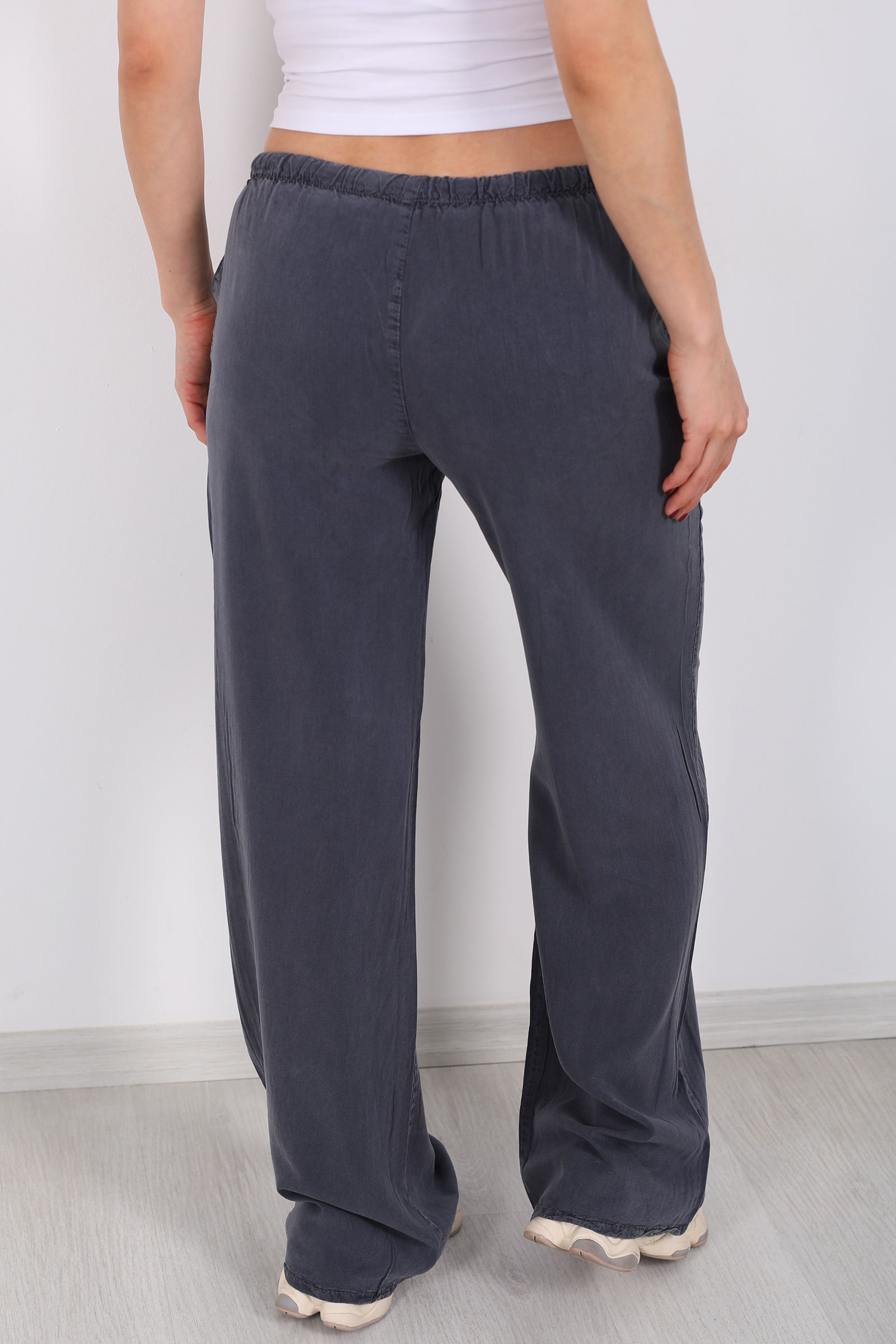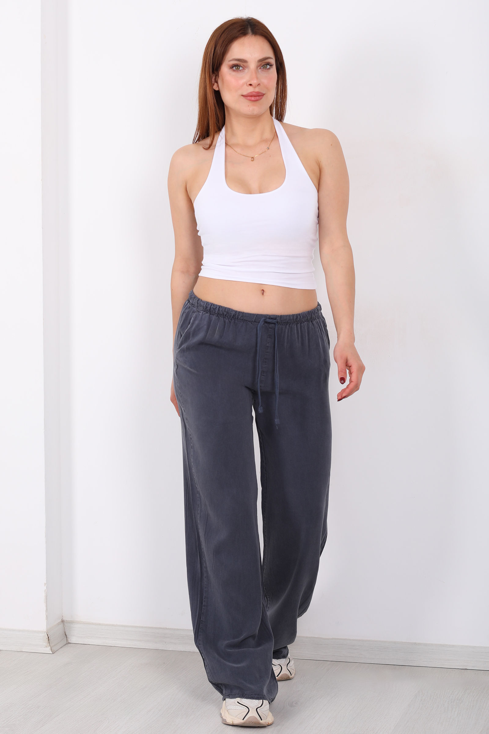 Modern şehir stilinin güçlü temsilcisi olan beli bağlamalı bol paça tensel pantolon, akışkan kumaş yapısı ve rahat kalıbıyla gün boyu konfor sunarken şıklığı zahmetsiz hale getirir. Tensel kumaşın hafif ve nefes alabilen dokusu vücutta ağırlık hissi oluşturmaz, doğal dökümlü yapısıyla zarif bir duruş sağlar.Antrasit rengin asil ve dengeli tonu, kombinlere modern bir karakter kazandırırken hem günlük kullanımda hem ofis stilinde kusursuz bir uyum yakalar. Bel kısmındaki bağlama detayı pantolona hareket katarken kişiye özel bir form oluşturur.