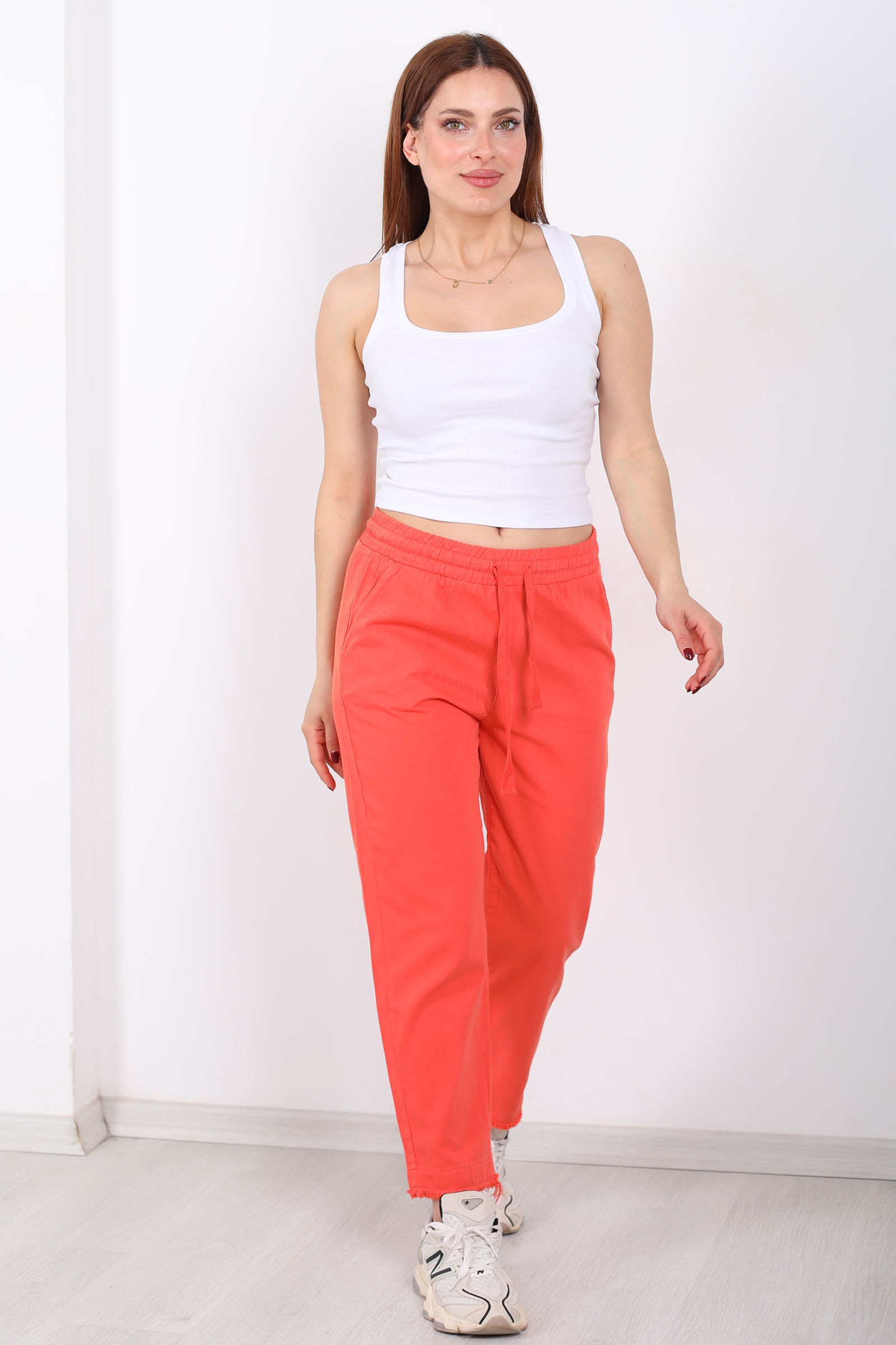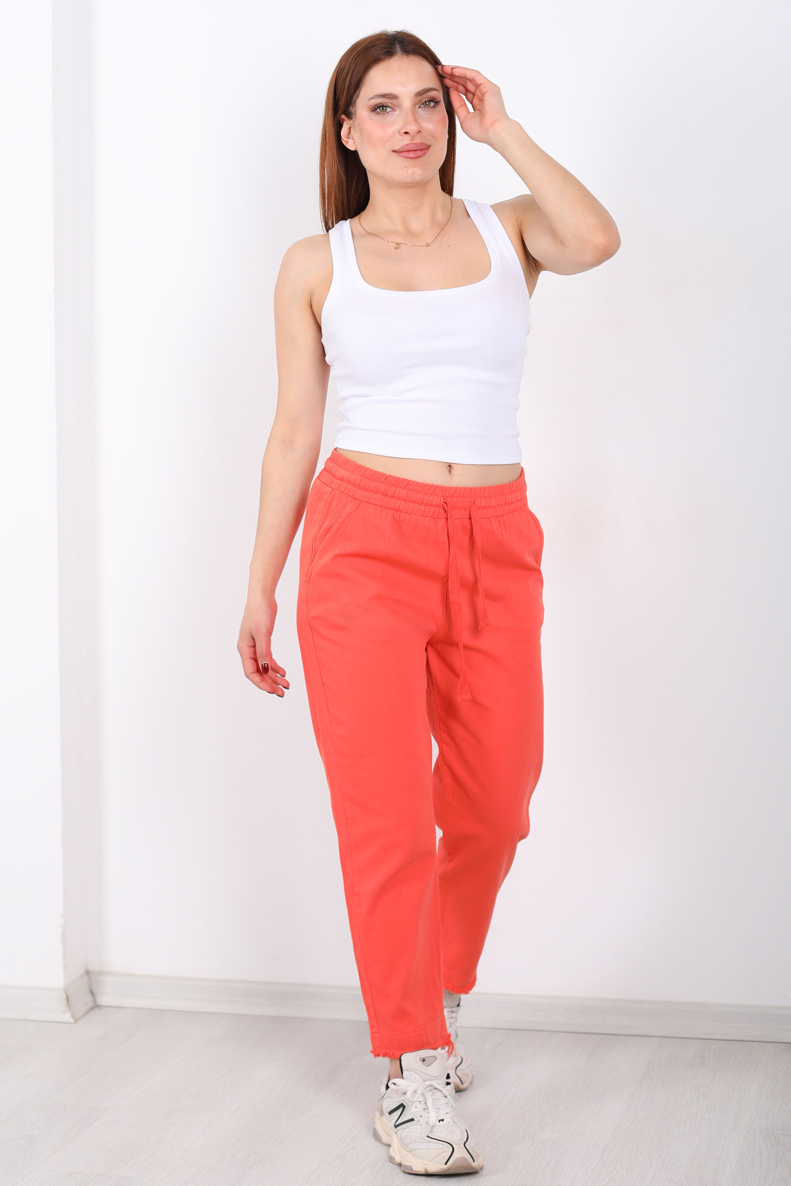Beldeki bağlama detayı, pantolona kişisel bir uyum ve zarif bir dokunuş sunar. Turuncu rengin enerjisi, minimal üstlerle bile kombinlerinizi canlandırırken, pastel tonlarla yumuşak ve şık bir kontrast oluşturur. Günlük şehir stili veya hafta sonu buluşmalarında bu pantolon, dikkat çekici ve modern bir görünüm sağlar.