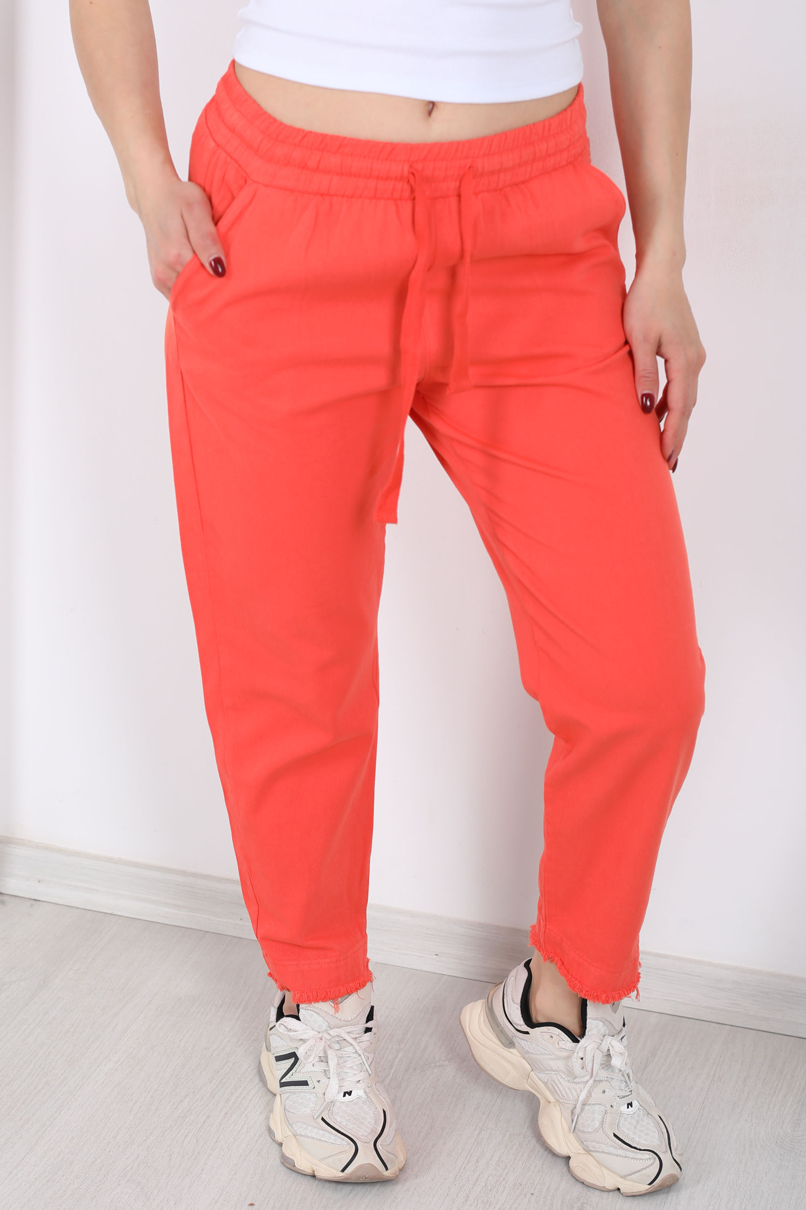 Enerjik turuncu tonuyla öne çıkan bu havuç kesim keten pantolon, gardırobunuza canlılık ve stil katıyor. Keten kumaşın hafif ve nefes alabilen dokusu, gün boyu rahatlık sağlar ve sıcak havalarda serin kalmanızı destekler. Paça uçlarındaki püsküller ise adımlarınıza küçük ama dikkat çekici bir hareket kazandırır.