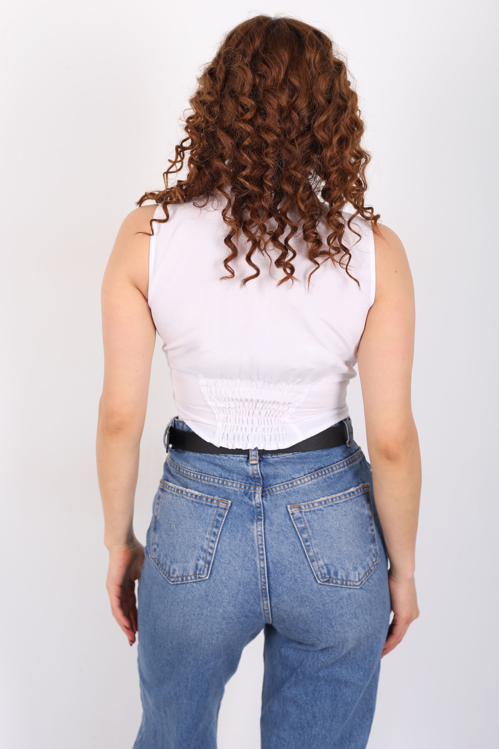 Beli Gipeli Arkası Lastikli Beyaz Kadın Kolsuz Gömlek