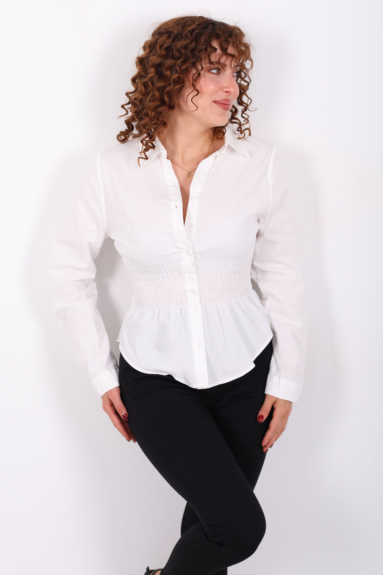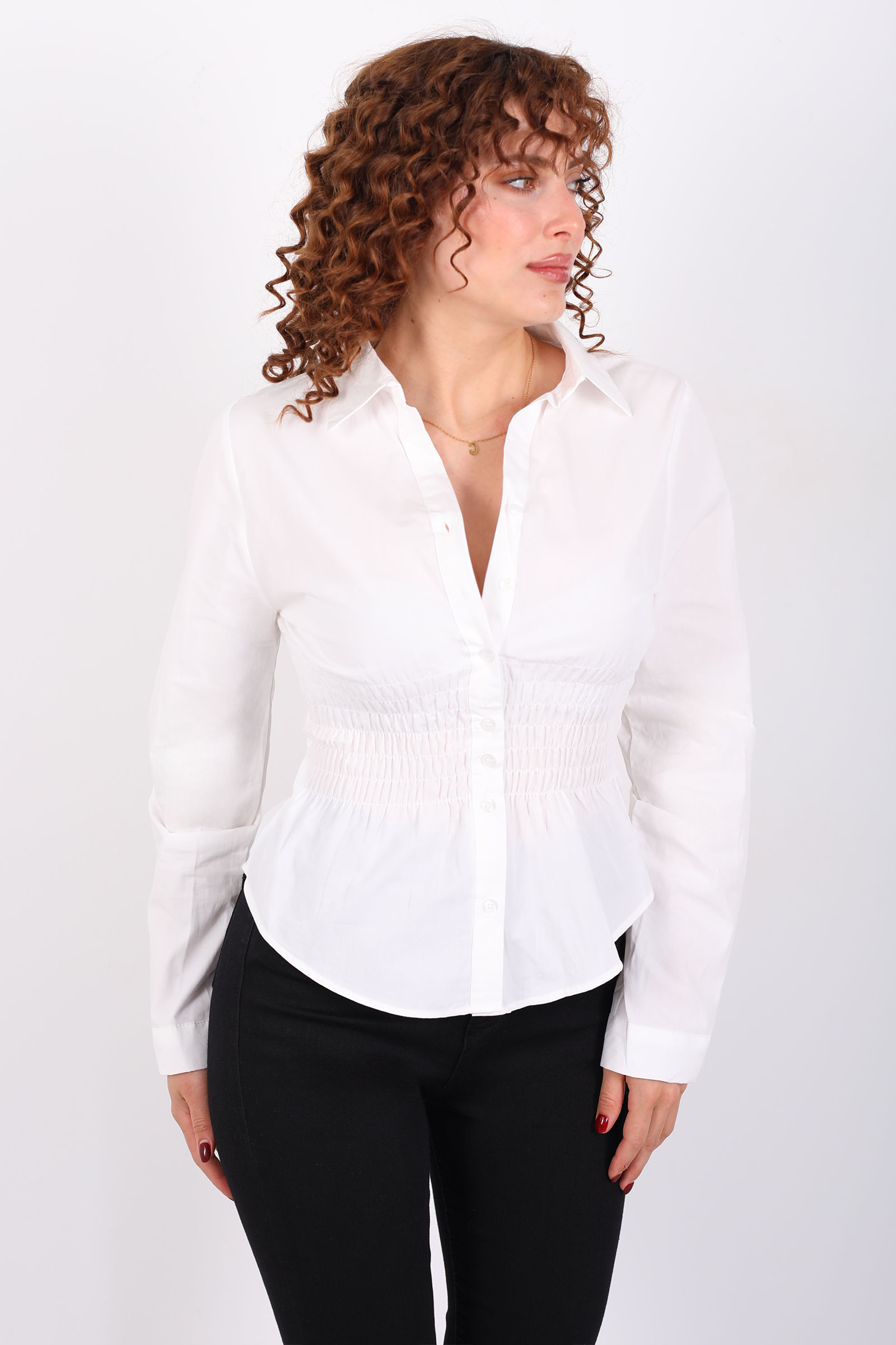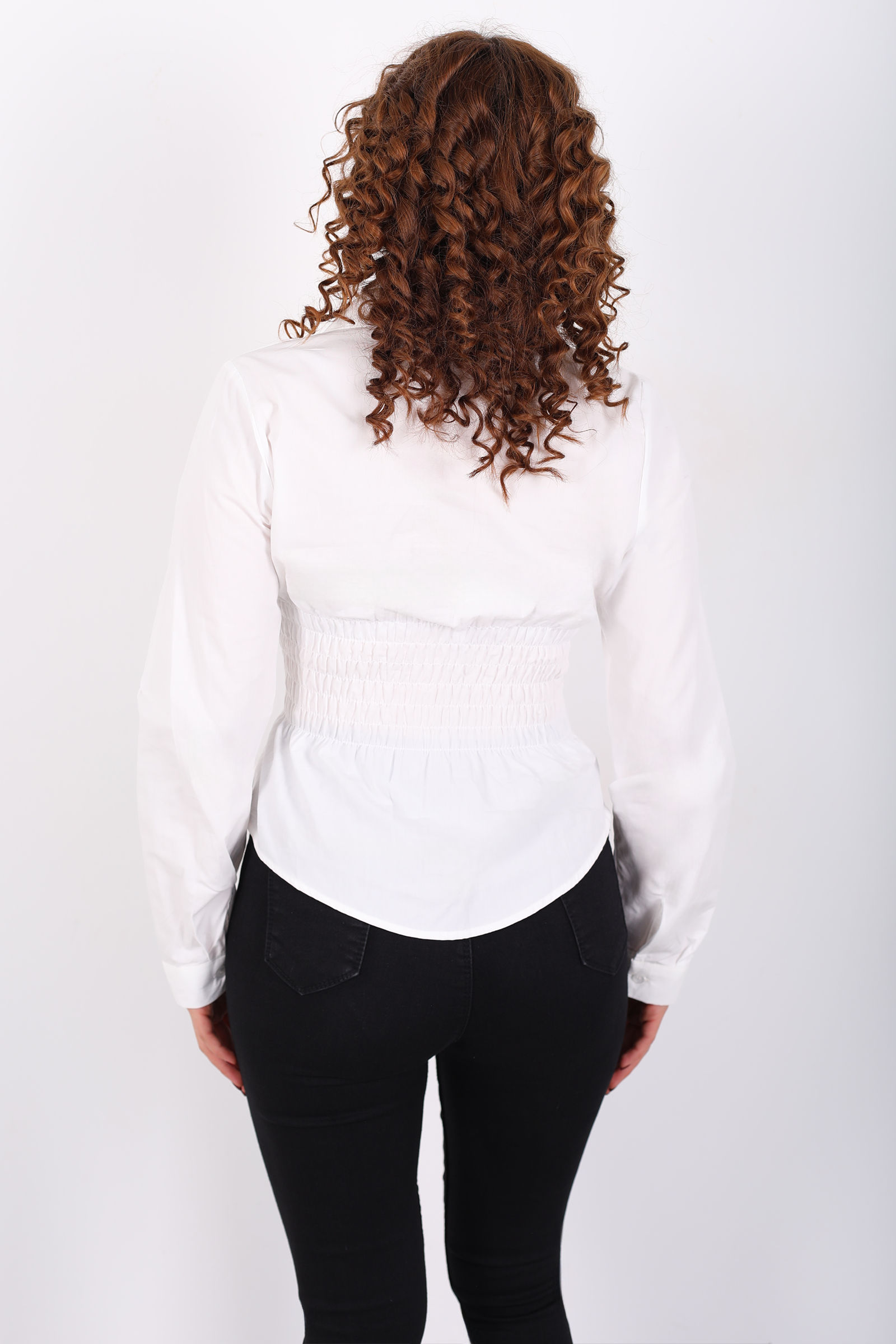 Beli Gipeli Uzun Kollu Beyaz Kadın Gömlek