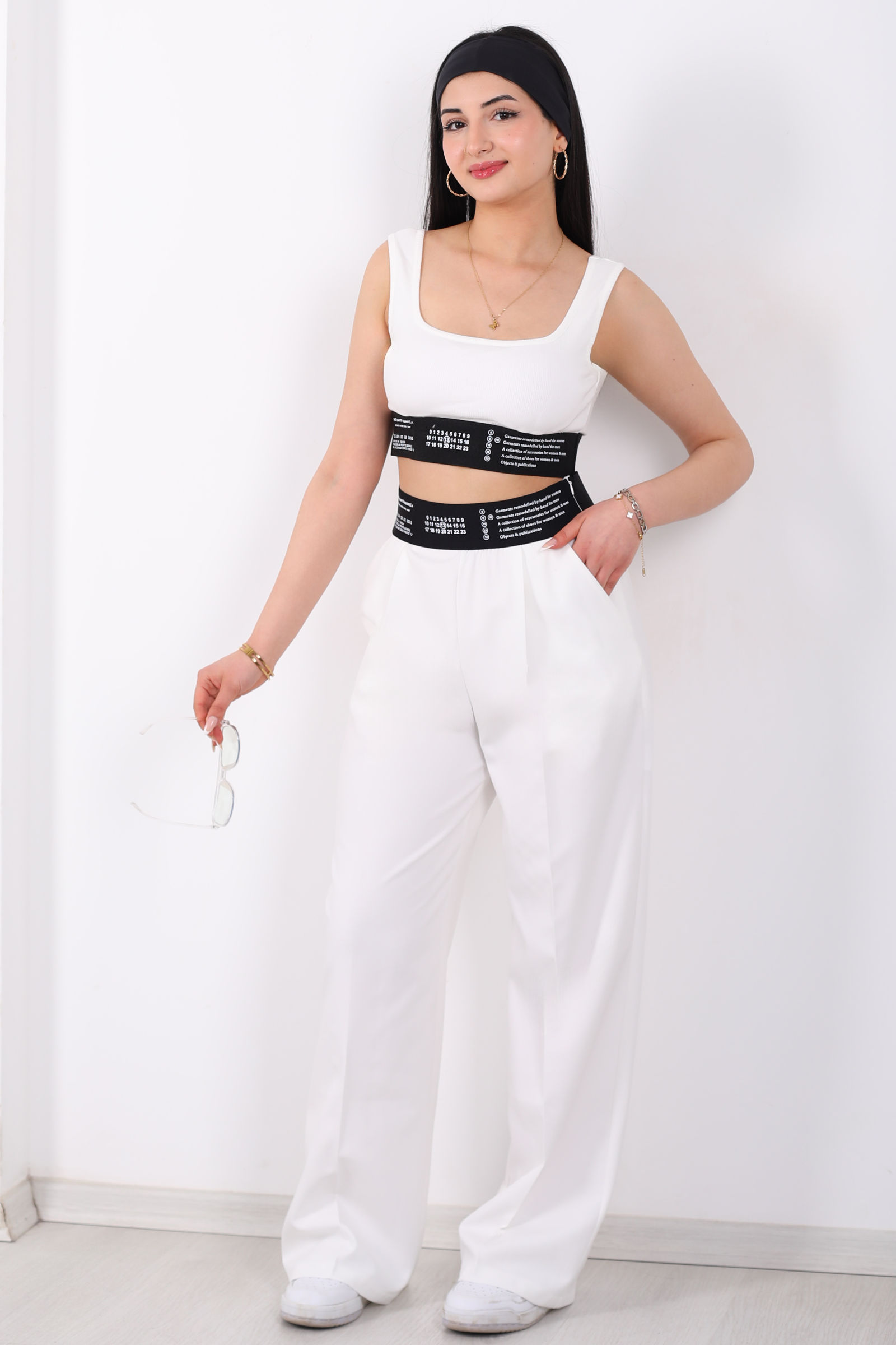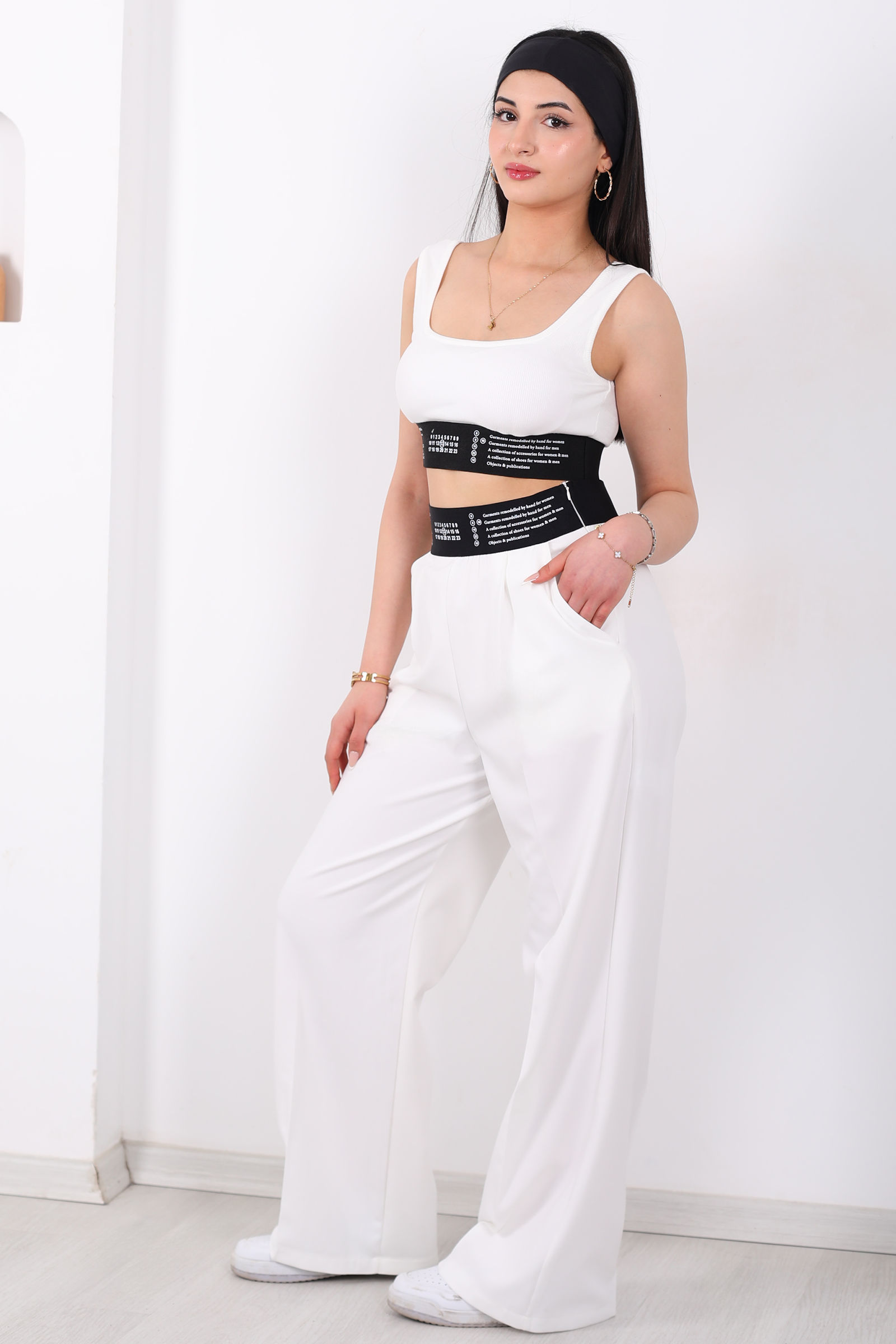 Beli Lastik Yazı Detaylı Kadın Beyaz Palazzo Pantolon