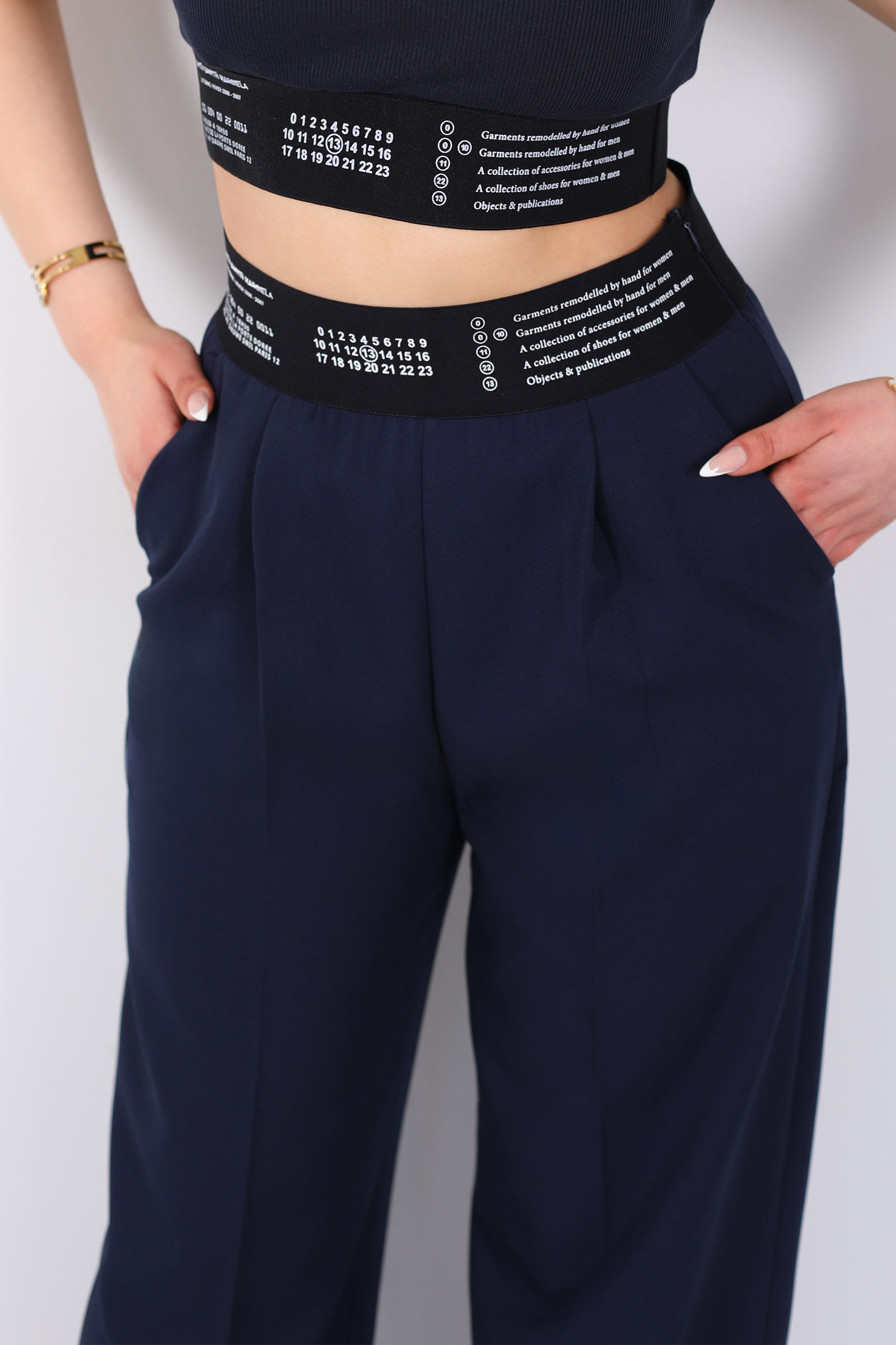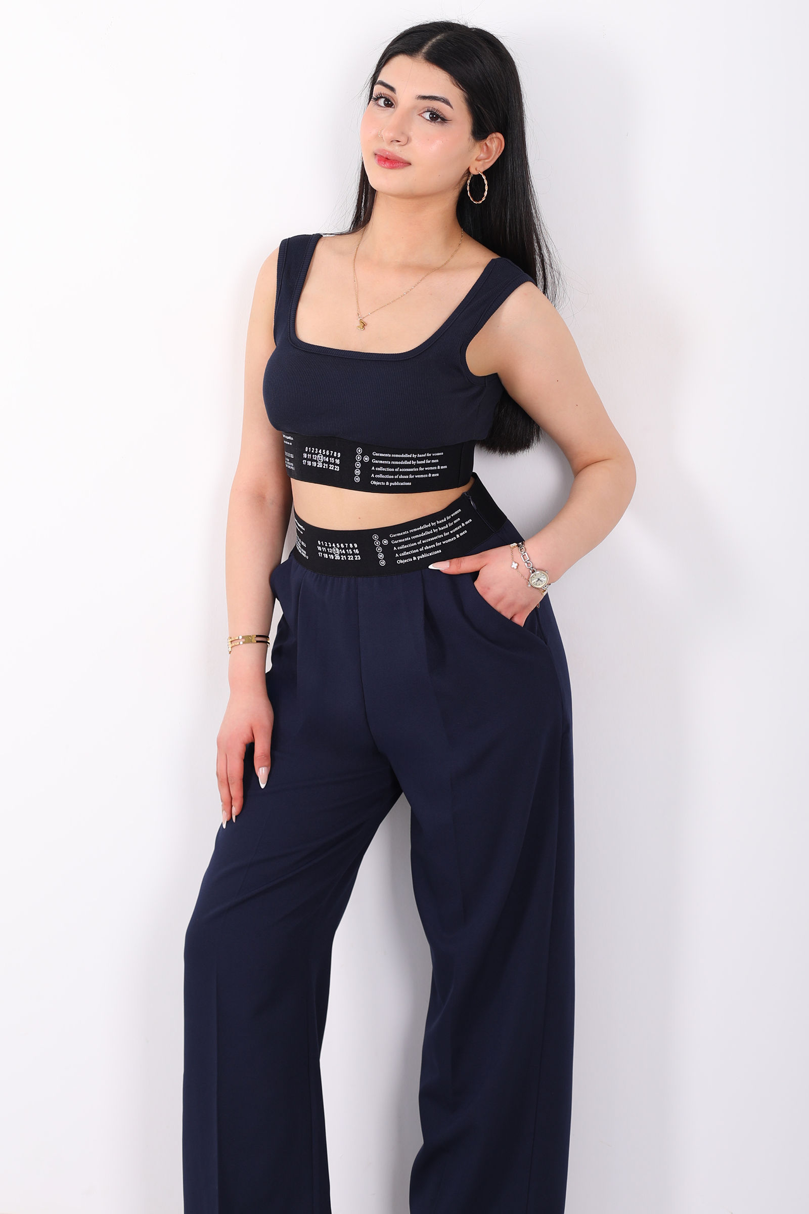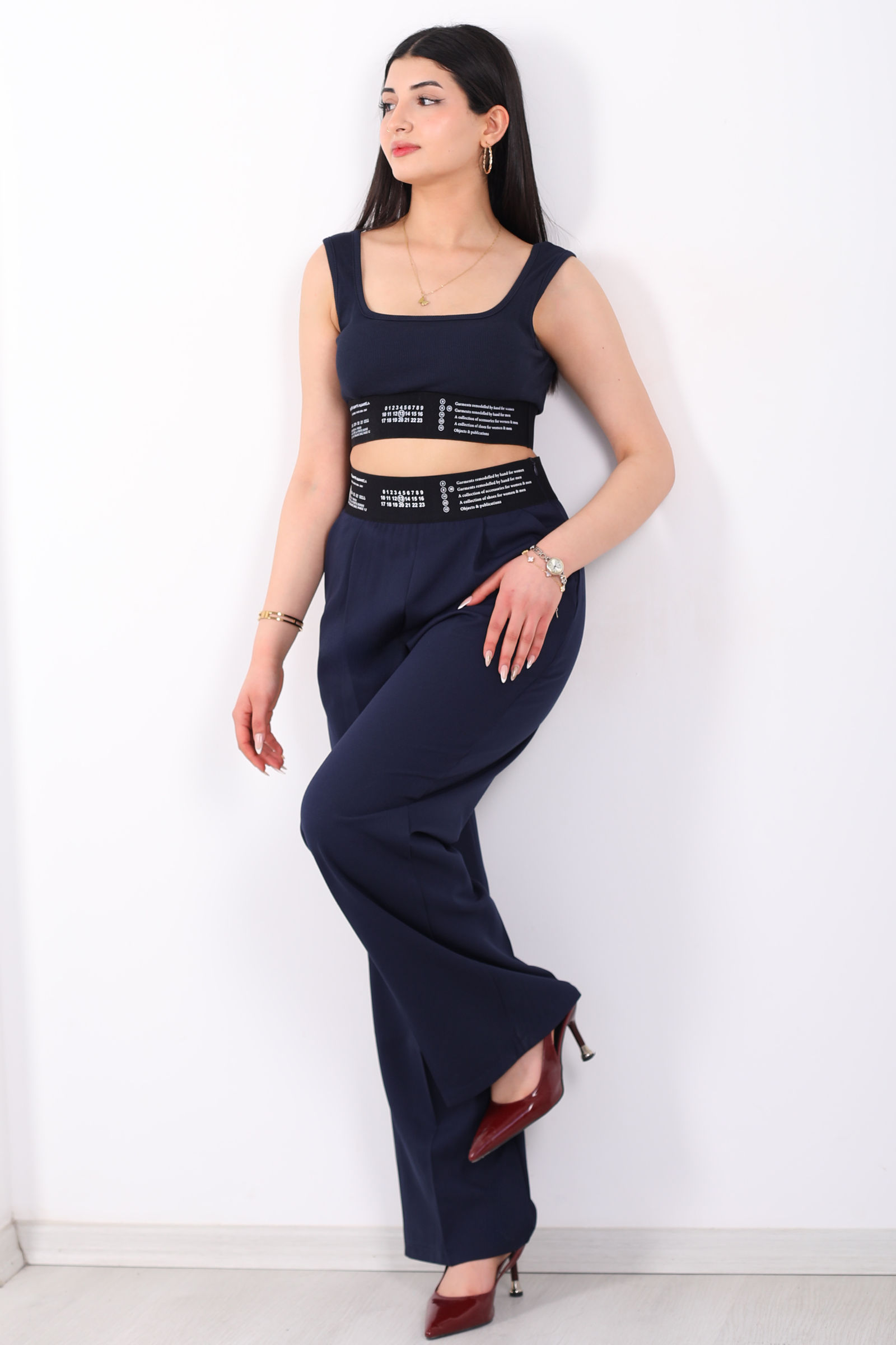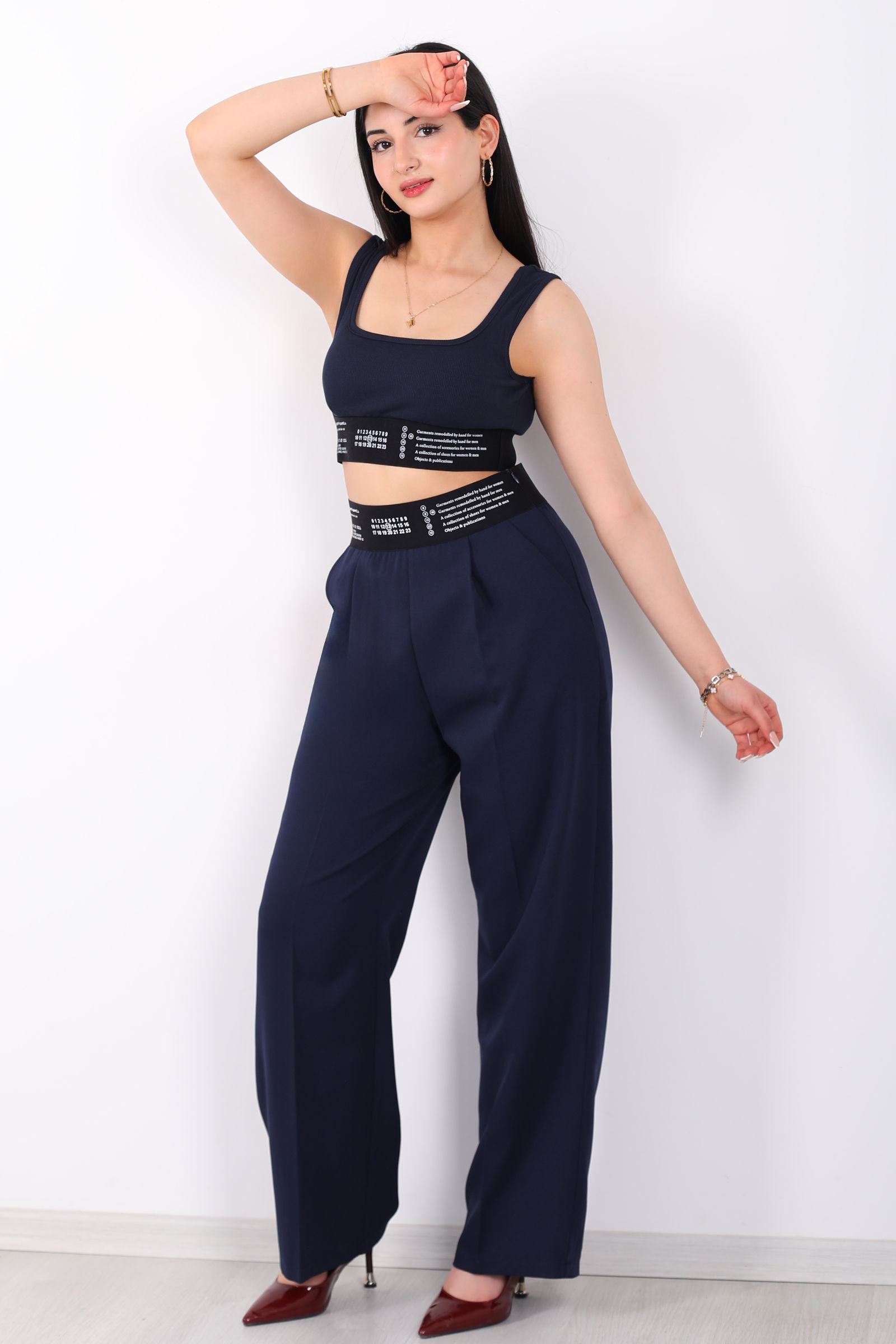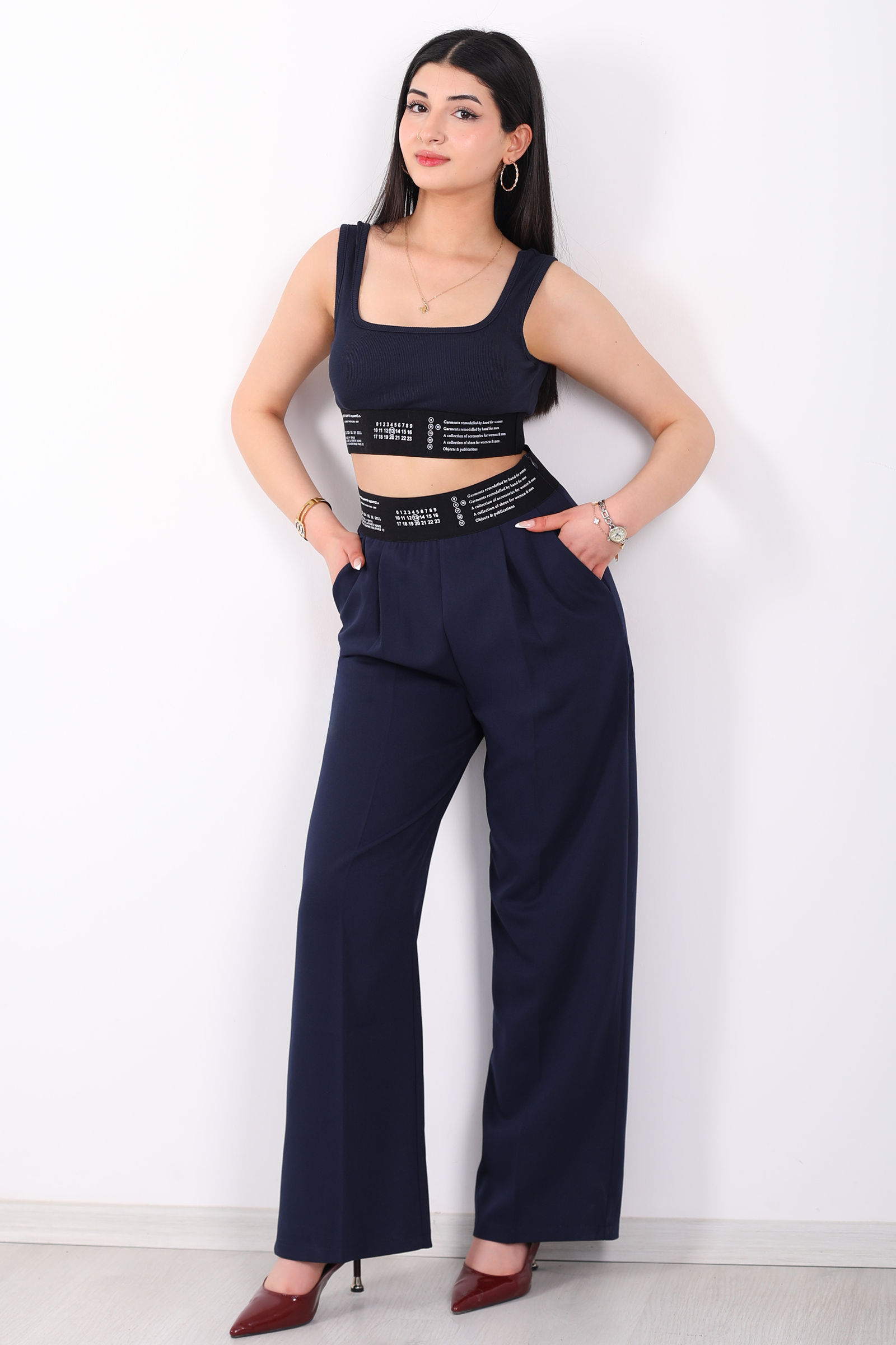 Beli Lastik Yazı Detaylı Kadın Lacivert Palazzo Pantolon